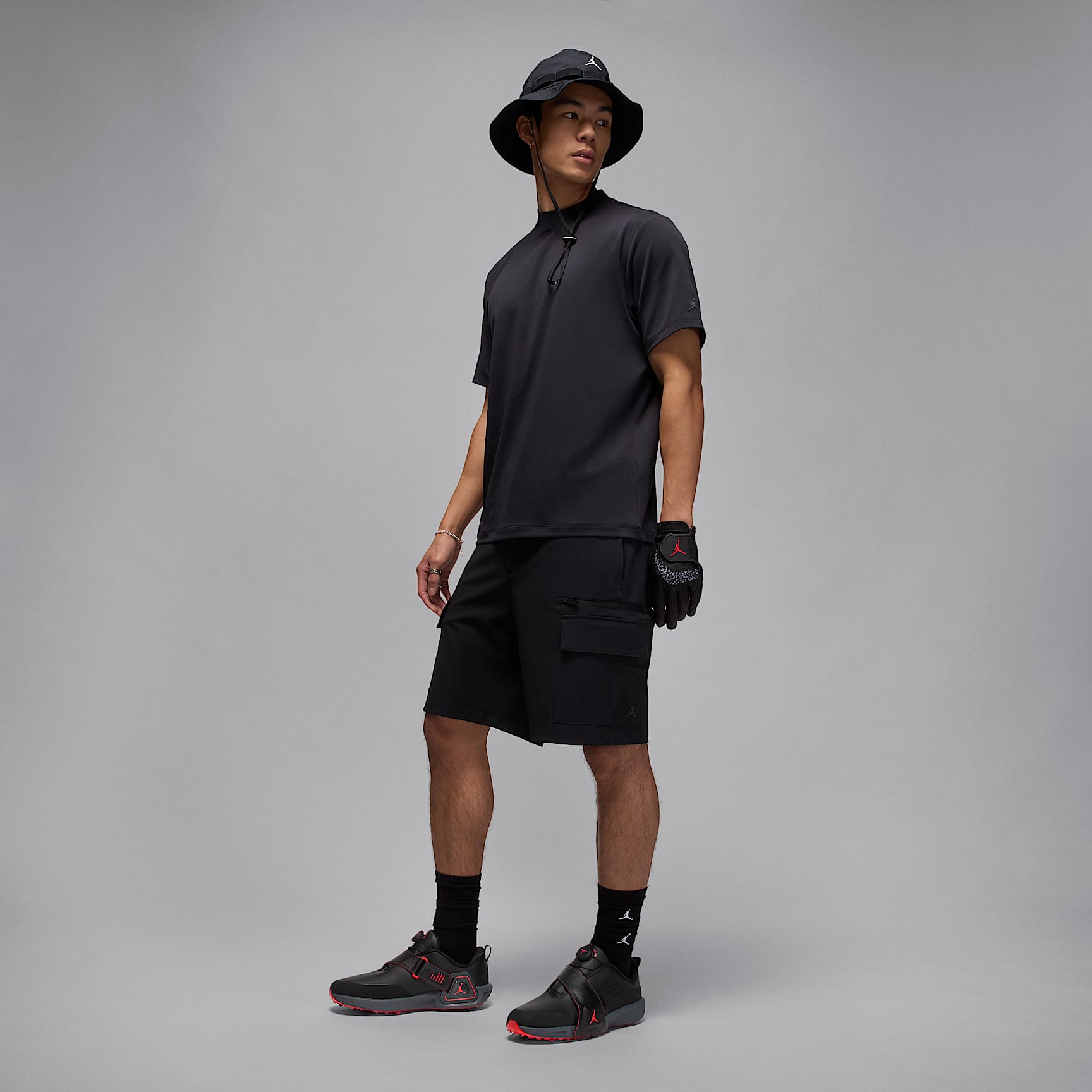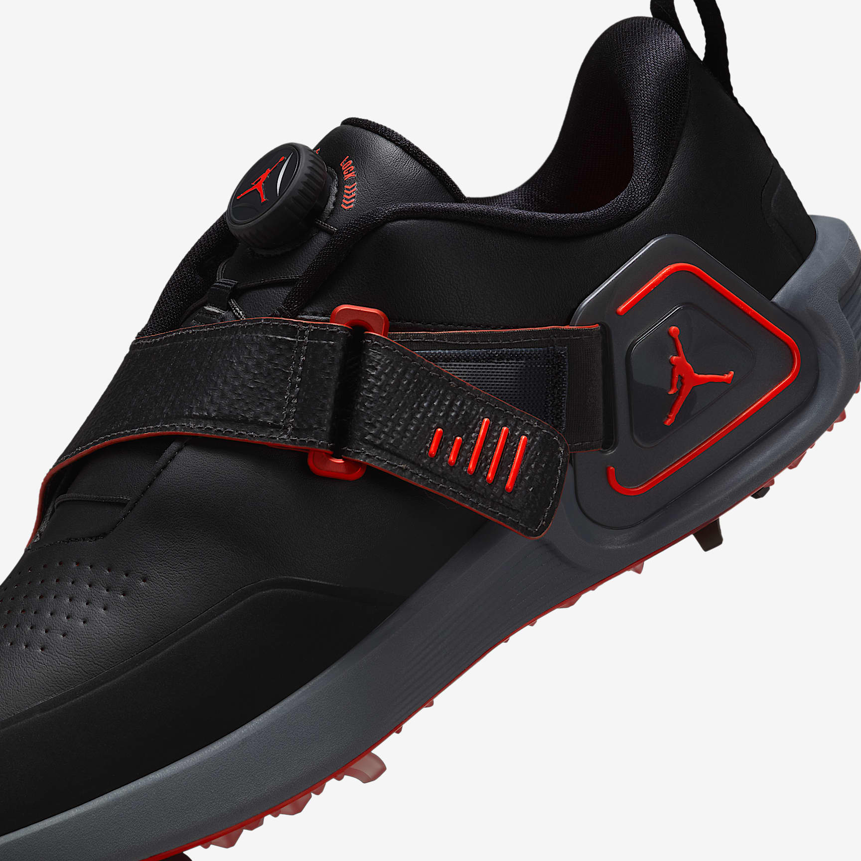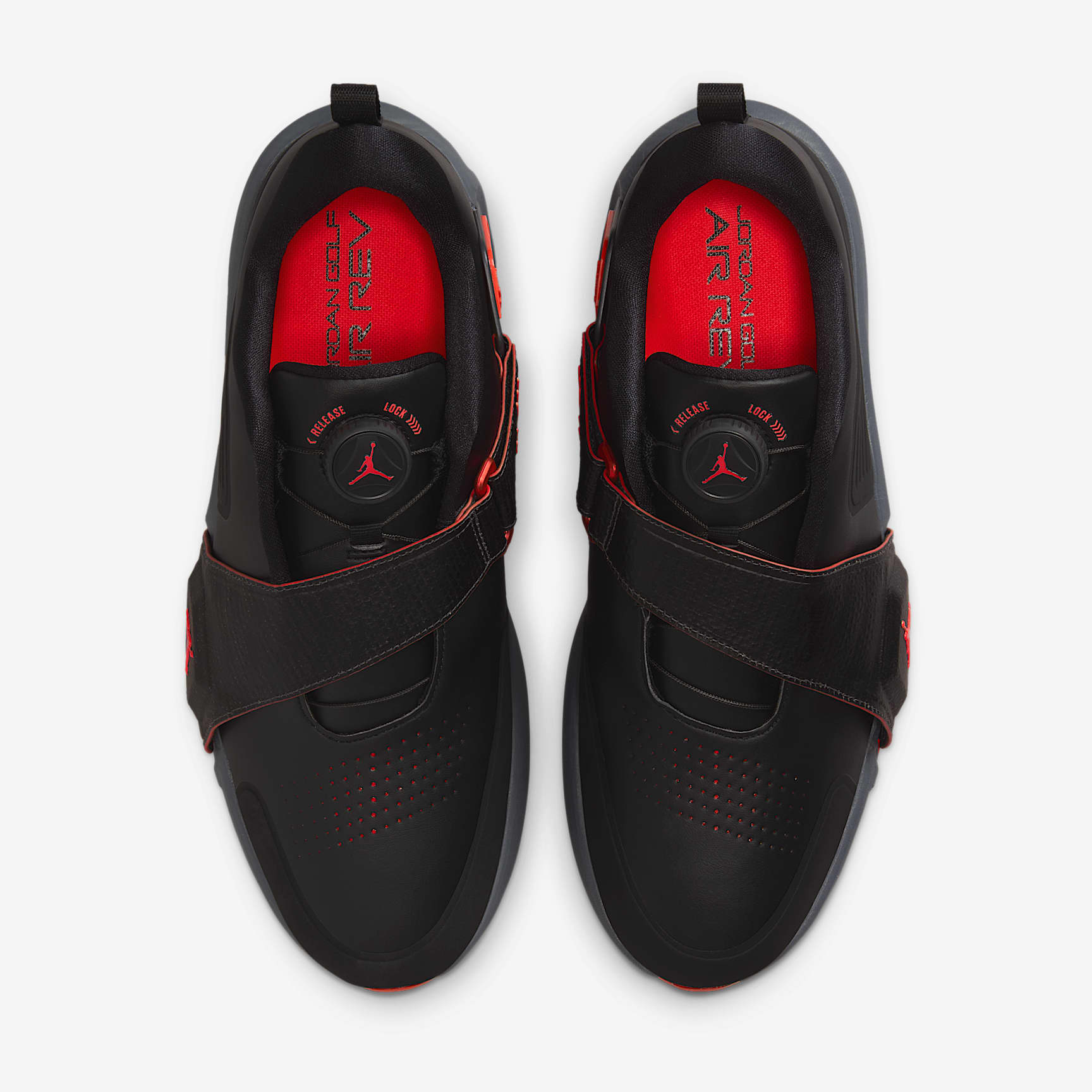 Grounded in greatness, the Jordan Air Rev is designed to give your swings optimal torque and speed. A moveable Air Zoom unit strategically placed in one shoe helps you power a strong, stable swing by capturing the energy generated when your trail foot pushes off. Welcome to the revolution. Hit Far What makes the Rev so revolutionary? It's the first Jordan golf shoe with a moveable Air Zoom unit. Right-handed players will want to tuck the Air Zoom unit inside the Flight Lock strap of the right shoe. The strap acts as an anchor point for the Air Zoom unit, which provides snappy cushioning for you to push against as you power through your swing. A springy foam pod in the left shoe helps soften your landing. Switch the Air Zoom unit and foam pod if you play left-handed. Off the Wall A molded plastic plate with Integrated traction helps solidify the wall-like surface of the Air Zoom unit. Right Comfort From the driving range to the front nine, a Cushlon foam midsole offers the right level of comfort and stability. Soft Touch Synthetic leather upper is perforated for breathability. It’s soft to the touch and helps offer a consistent fit that won’t stretch out with wear. Dial in Your Fit Dial lacing system allows you to personalize your fit. Turn the dial to the right to tighten and to the left to loosen. A strap helps lock in your fit for all-day performance.