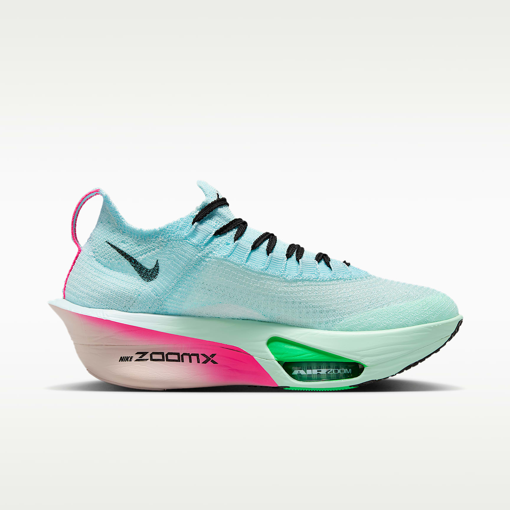 Fine-tuned for marathon speed, the Alphafly 3 helps push you beyond what you thought possible. Three innovative technologies power your run: A double dose of Air Zoom units helps launch you into your next step; a full-length carbon fiber plate helps propel you forward with ease; and a heel-to-toe ZoomX foam midsole helps keep you fresh from start to 26.2. Time to leave your old personal records in the dust. Energy Return for Your Marathon Two forefoot Air Zoom units combine with ZoomX foam to store and return the energy back to you, powering every step. Propulsive Feeling A full-length carbon fiber plate delivers a propulsive sensation that helps you smoothly transition through every stride and tackle turns with confidence. Cushioned Ride Fully connected ZoomX foam creates an ultralight and cushioned feel, helping you stay fresh and comfortable from mile 1 to 26.2. What's New About the Alphafly 3? The Alphafly 3 is our lightest Alphafly ever, featuring a slightly wider carbon fiber plate for increased stability, a fully connected ZoomX foam midsole for smoother transitions, and an all-new Atomknit upper designed for improved multidirectional containment and breathability. More Benefits * Notched laces offer a secure but soft lace-up. * Integrated knit tongue with lofted padding helps alleviate lace pressure. Product Details * Weight: Approx. 174g/6.1oz (Women's US 8) * Heel-to-toe drop: 8mm