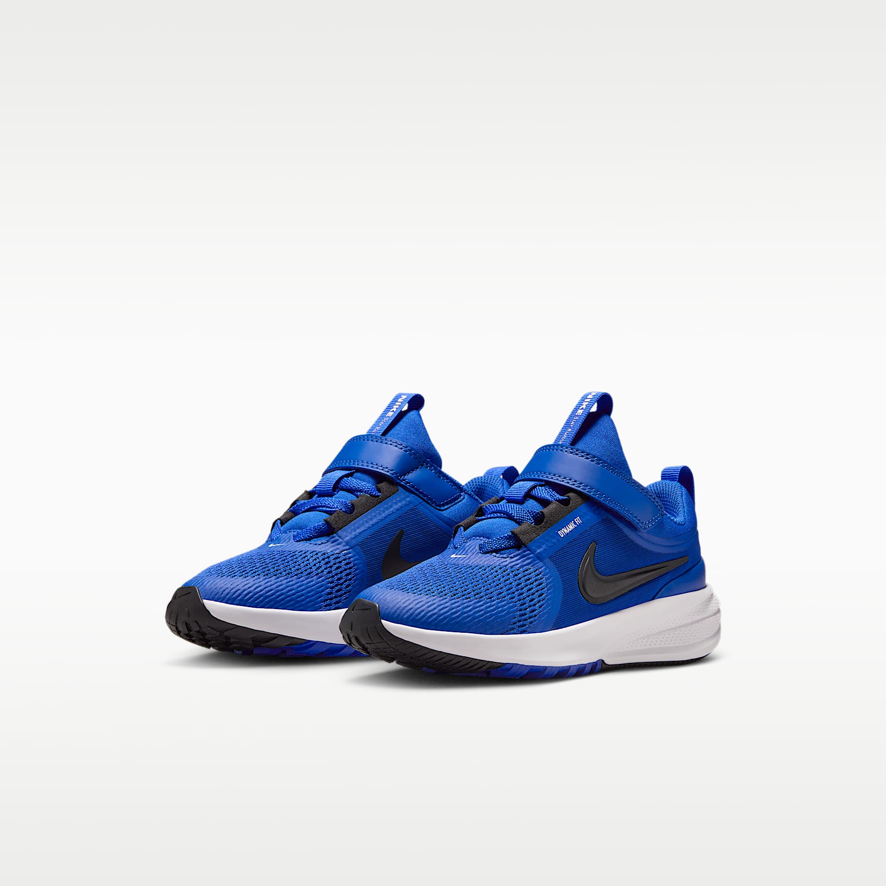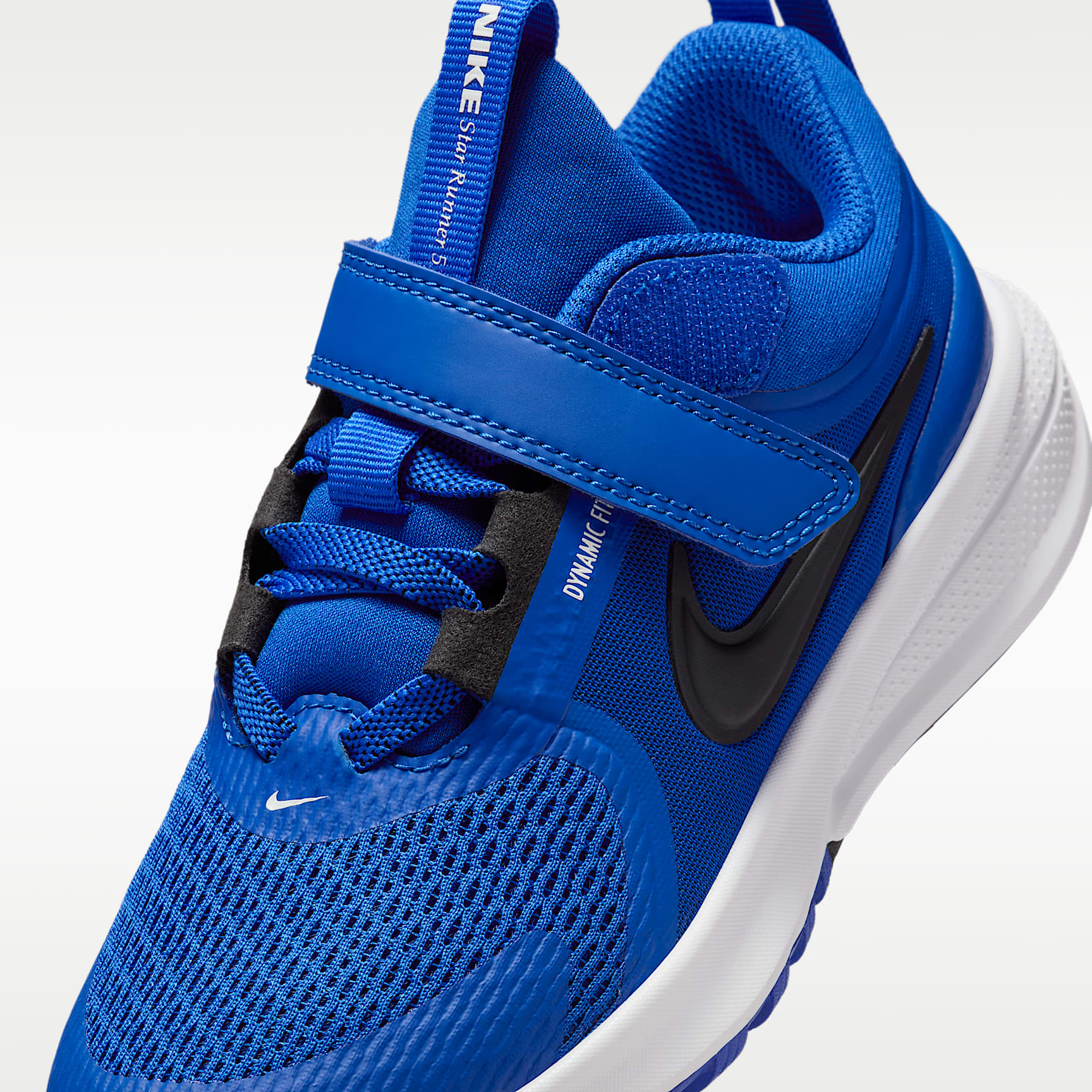 Breathable and lightweight, the Nike Star Runner 5 will have your little one dreaming of all the ways they can run and play. Springy cushioning and a secure fit help them make the most out of playtime. Keep Cool Breathable mesh and airy knits keep the upper lightweight and flexible, helping little feet stay cool and comfortable. We reinforced the toes for added durability. Secure Fit A dynamic fit band wraps around the middle of the foot and works with stretchy elastic laces to give kids a stable, held-in feel. An adjustable hook-and-loop strap helps kids secure their fit fast. Spring into Action We packed the midsole with foam, helping add soft and springy cushioning to kids' every stride. Get a Grip Durable rubber lugs on the outsole help provide added traction where little runners need it most. Product Details * Elastic laces * Pull tab on tongue