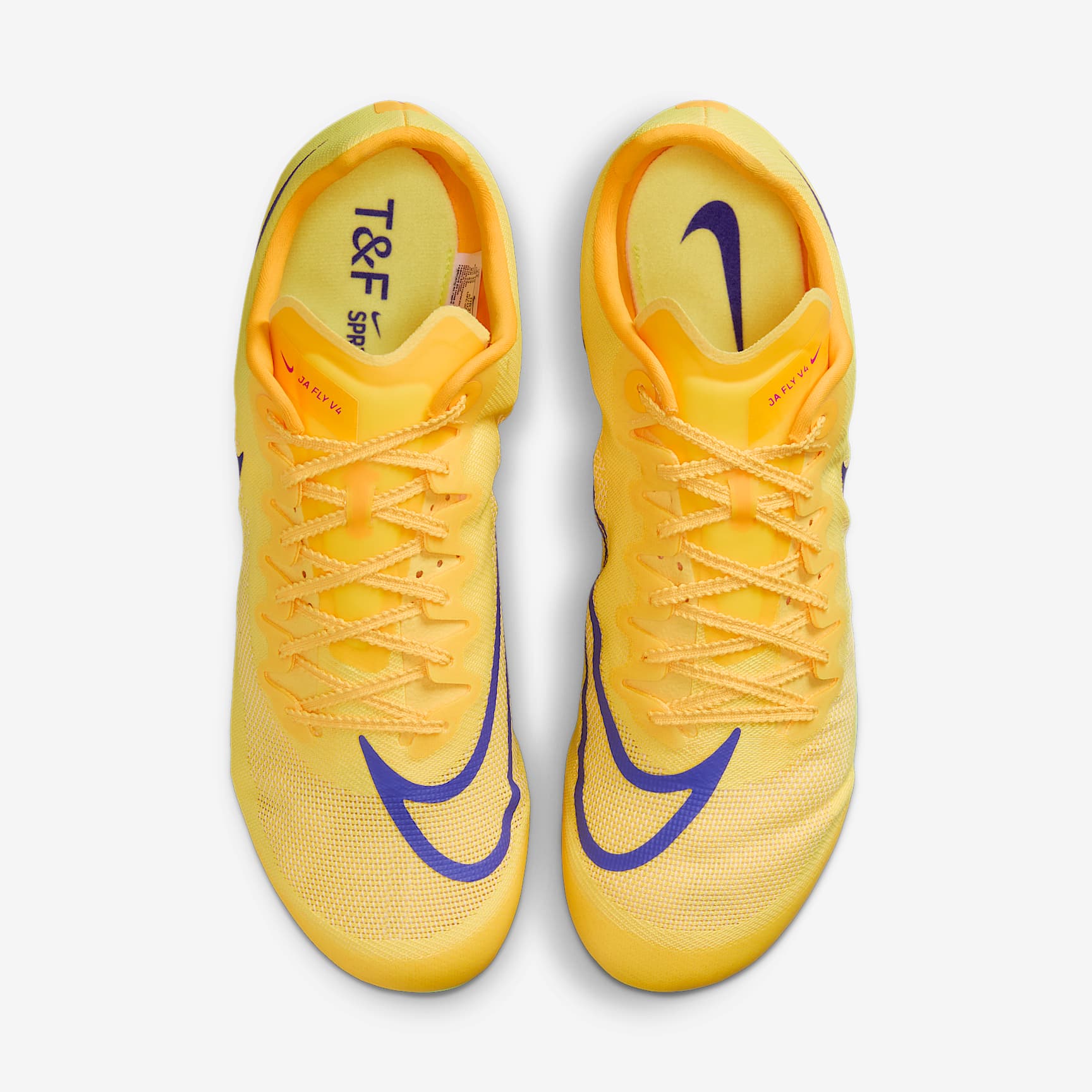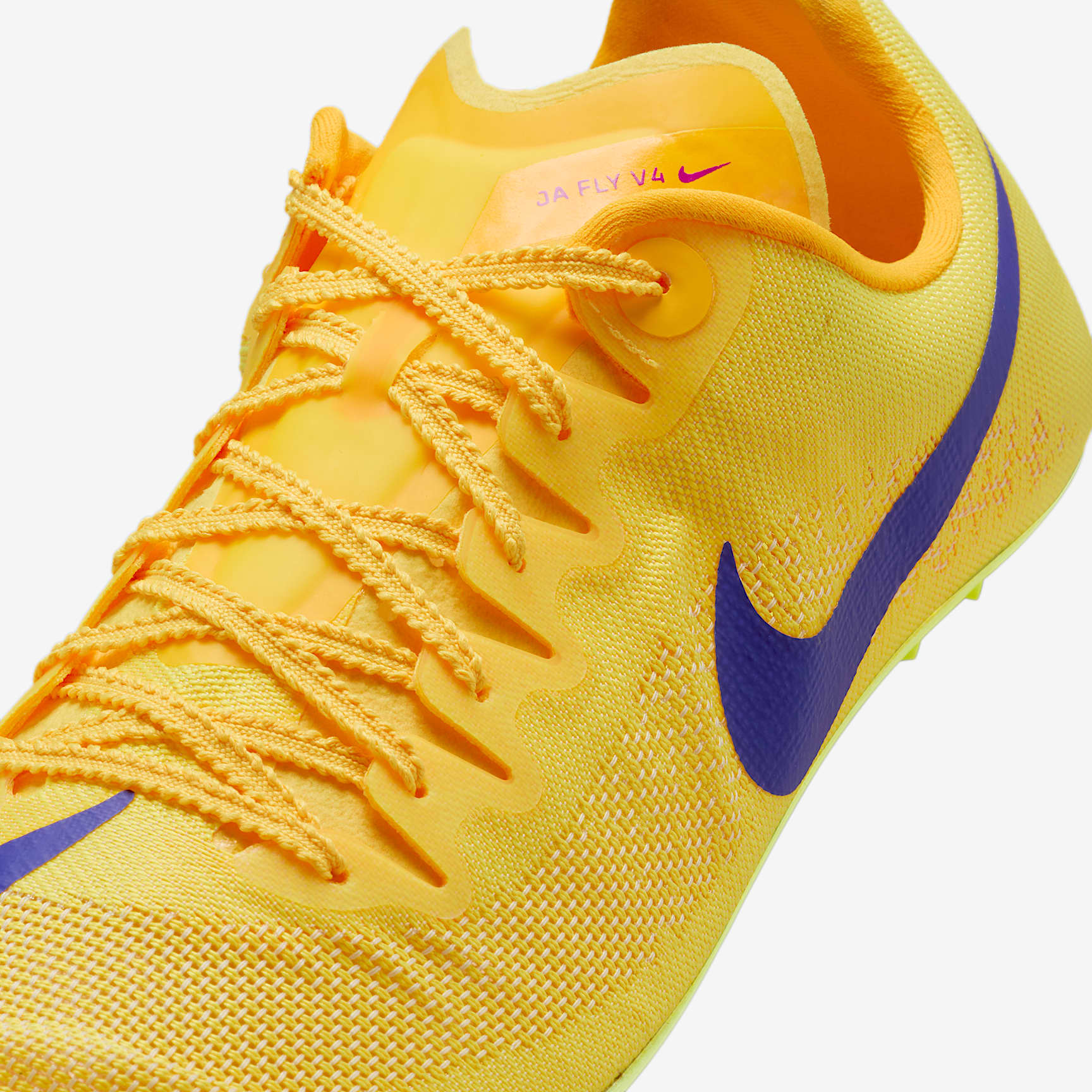 Our lightest sprint spike has a revamped plate. Finish through the tape first in the Nike Zoom Ja Fly 4, a sprint spike made to help you set personal records in everything from the 60 meters to 400 meters. Our lightest Nike Sprint spike has a revamped plate for enhanced stiffness and an updated upper for better breathability, so you can stay focused on doing your best. Lighter, Faster An updated woven upper gives you security and containment at a significantly lighter weight than the Ja Fly 3, but with more breathability. Explode Out of the Blocks A completely new plate using computationally designed hexagons delivers stiffness in key areas to help you fly off the starting line and maintain speed throughout the race. Lace Up The Nike Racing shoelace is lightweight with notches and just a little stretch that allows for a secure fit that stays tied in all conditions.