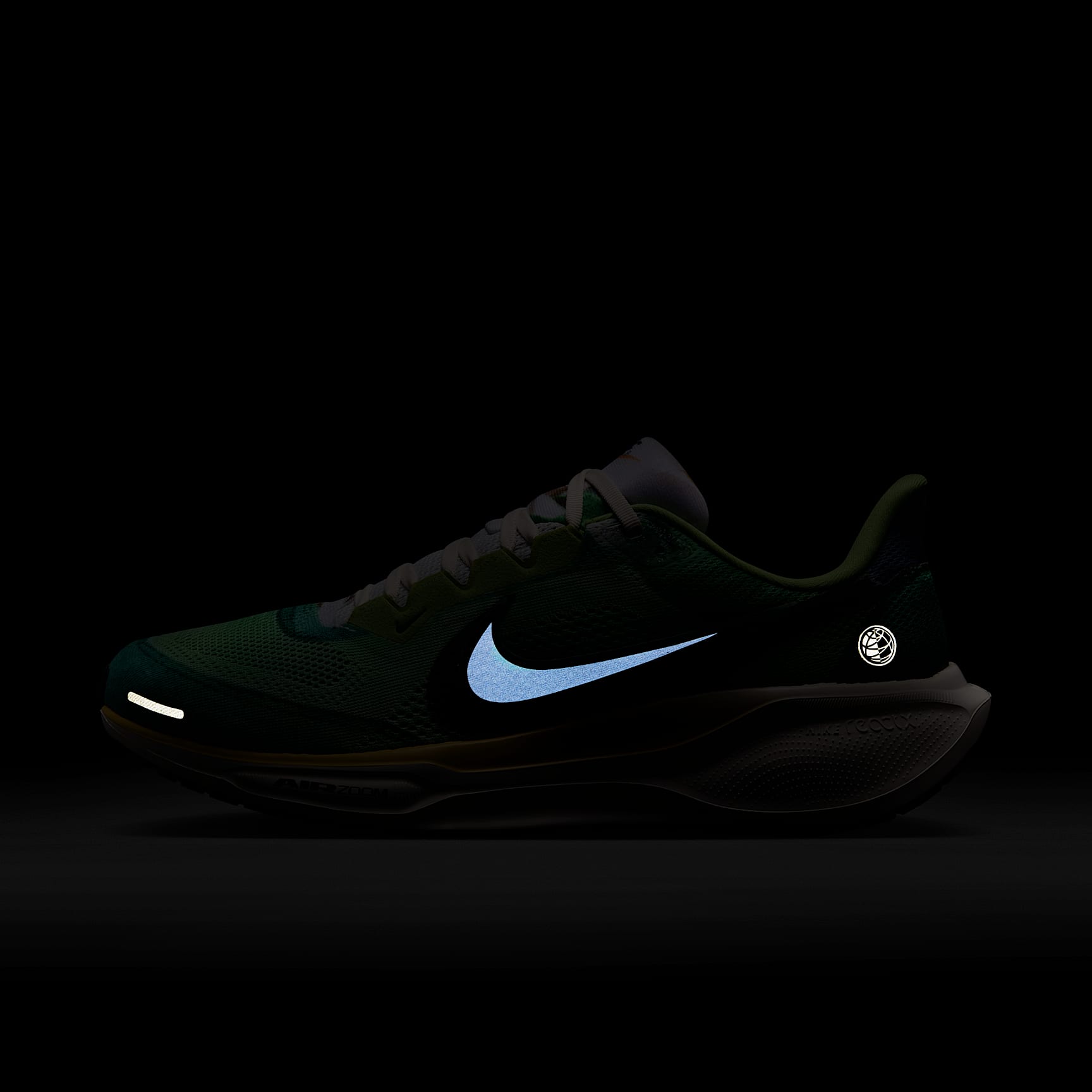 Responsive cushioning in the Pegasus provides an energised ride for everyday road running. Experience lighter-weight energy return with dual Air Zoom units and a ReactX foam midsole. Plus, improved mesh on the upper decreases weight and increases breathability. Springy cushioning We paired Nike ReactX foam with two Air Zoom units (one in the forefoot and one in the heel) to give you a bouncy, springy sensation and an energised feel at toe-off. Waffle-inspired traction Signature waffle-inspired rubber outsole provides traction and flexibility. Plush collar A plush collar, tongue and soft sockliner for a secure and comfortable fit What's new? * The ReactX foam midsole is 13% more responsive than previous React technology. * The engineered mesh upper is lighter and more breathable than the Pegasus 40. Product details * Weight: approx. 297g (men's size 9) * Heel-to-toe drop: 10mm * MR-10 last—our best, most consistent fit (same as Pegasus 40) * Reflective design details * Not intended for use as personal protective equipment (PPE) Crafted for performance and planet The ReactX foam is engineered to reduce its carbon footprint by at least 43% in a pair of midsoles due to reduced manufacturing process energy compared with prior React foam. The carbon footprint of ReactX is based on cradle-to-gate assessment reviewed by PRé Sustainability BV and Intertek China. Other midsole components such as airbags, plates or other foam formulations were not considered.