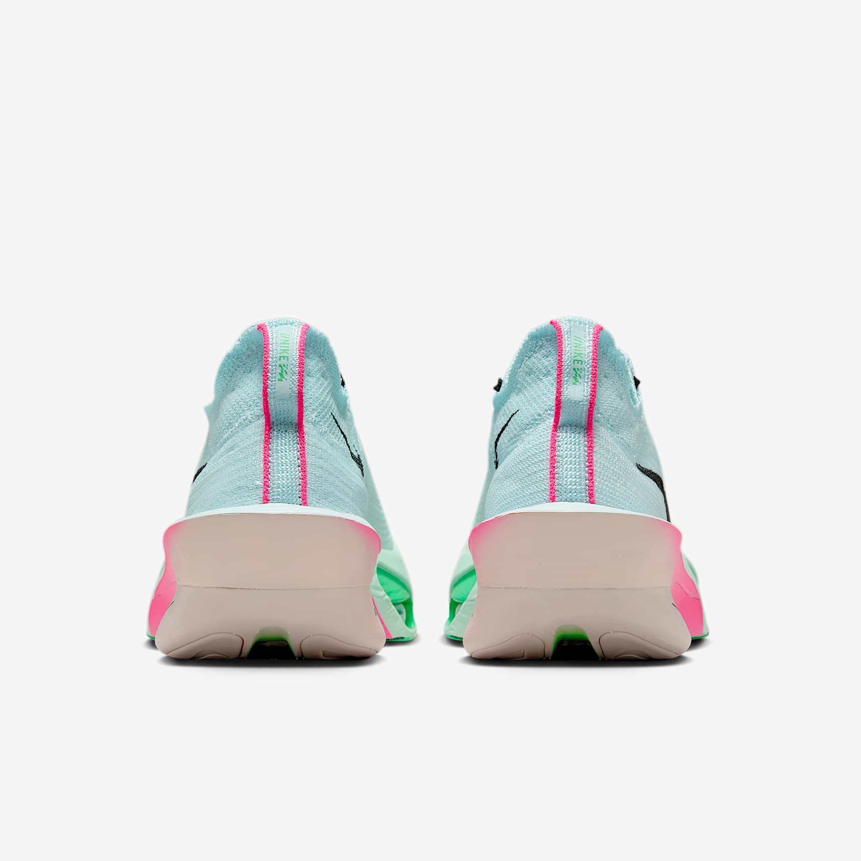 Fine-tuned for marathon speed, the Alphafly 3 helps push you beyond what you thought possible. Three innovative technologies power your run: a double dose of Air Zoom units helps launch you into your next step; a full-length carbon-fibre plate helps propel you forwards with ease; and a heel-to-toe ZoomX foam midsole helps keep you fresh from start to 26.2. Time to leave your old personal records in the dust. Energy return for your marathon Two forefoot Air Zoom units combine with ZoomX foam to store and return the energy back to you, powering every step. Propulsive feeling A full-length carbon-fibre plate delivers a propulsive sensation that helps you smoothly transition through every stride and tackle turns with confidence. Cushioned ride Fully connected ZoomX foam creates an ultralight and cushioned feel, helping you stay fresh and comfortable from mile 1 to 26.2. What's new about the Alphafly 3? The Alphafly 3 is our lightest Alphafly ever, featuring a slightly wider carbon-fibre plate for increased stability, a fully connected ZoomX foam midsole for smoother transitions and an all-new AtomKnit upper designed for improved multi-directional containment and breathability. More benefits * Notched laces offer a secure but soft lace-up. * Integrated knit tongue with lofted padding helps alleviate lace pressure. Product details * Weight: approx. 218g (men's UK 9) * Heel-to-toe drop: 8mm * Not intended for use as personal protective equipment (PPE)