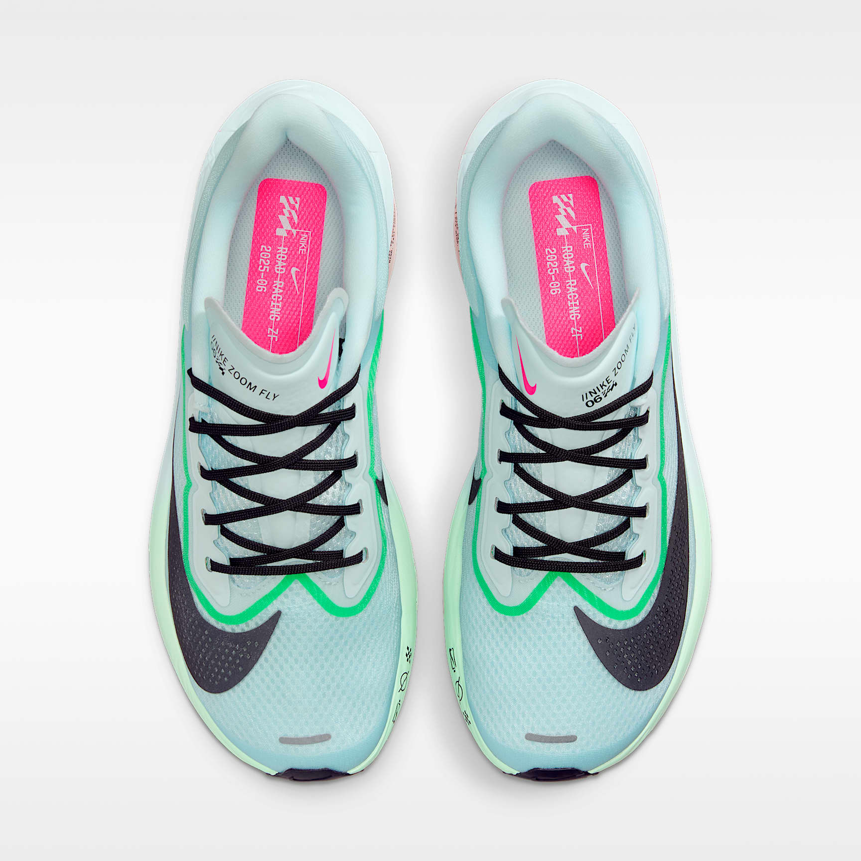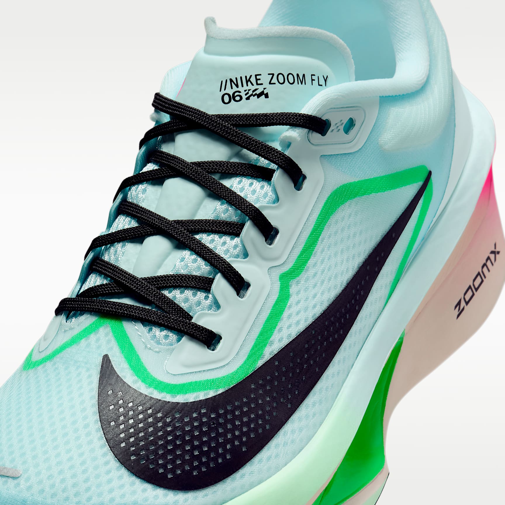 ZoomX foam plus a carbon fiber plate equals an energized ride. The Zoom Fly 6 is with you every step of your run. Lighter than the Zoom Fly 5, its responsive ZoomX foam adds energy return to each stride, while a carbon fiber Flyplate helps propel you to the finish line. Responsive Speed ZoomX foam, Nike’s lightest and most responsive foam, delivers our most energy return with every stride you take. Carbon Fiber Flyplate Full-length carbon fiber Flyplate increases efficiency and responsiveness. Grippy Outsole A thin rubber outsole is lightweight and grippy on the road. Product Details * Weight: Approx. 214g/7.5oz (Women's US 8) * Heel-to-toe drop: 8mm * Reflective details * Not intended for use as Personal Protective Equipment (PPE)