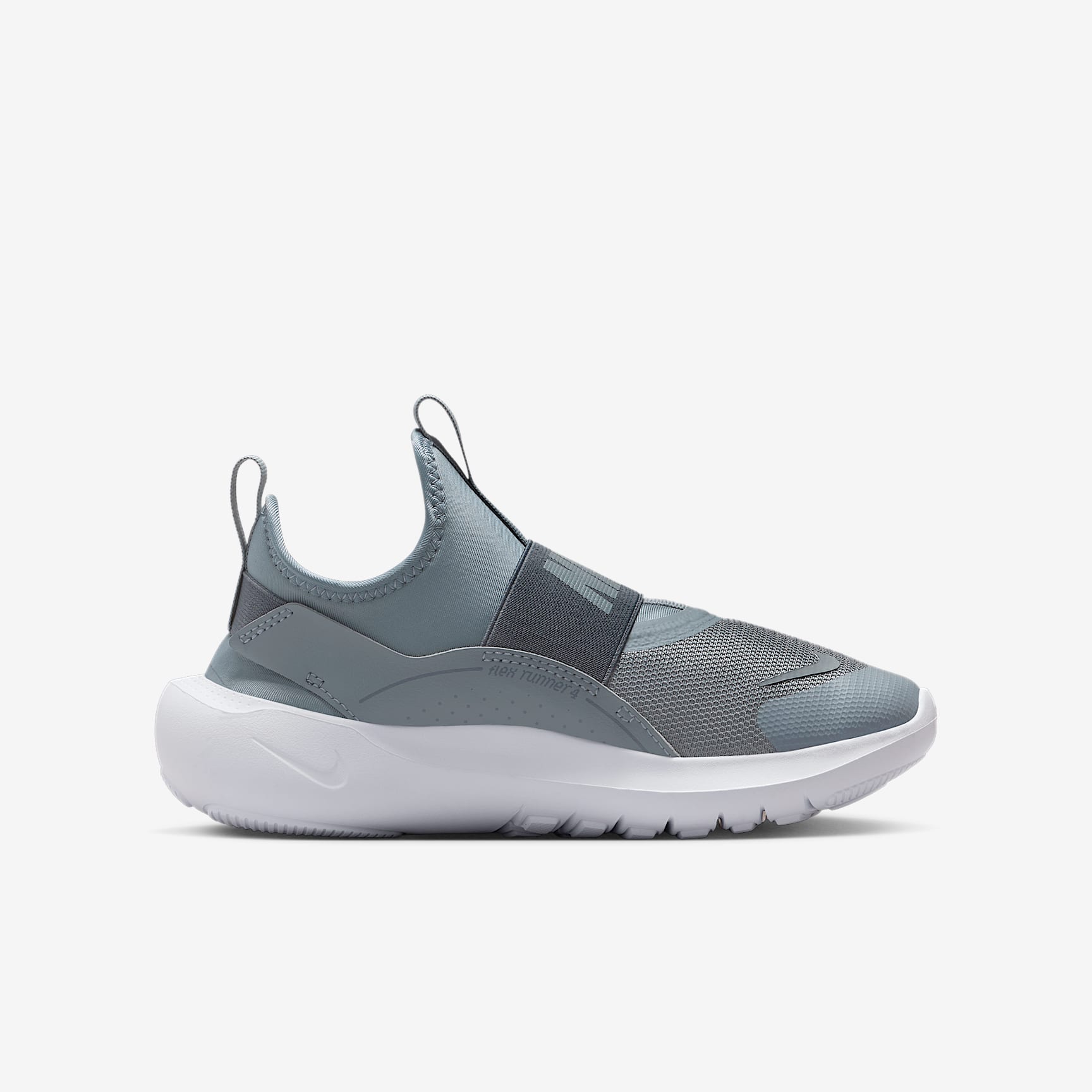 With the Flex Runner 4, you're always ready to race into fun. A flexible, bootie-like design makes it easy to pull on, while stretchy straps help secure your fit. Flex grooves in the outsole let your feet move naturally, helping you find your stride. What's new You spoke and we listened. For the Flex Runner 4, we've updated the fit of the midfoot strap and the collar to help make these easy to slip on and comfortable enough to wear all day. Pull on and go Pull tabs on the heel and tongue work with a stretchy inner sleeve to help make these shoes easy to put on. Elastic straps run behind your heel and across the top of your foot to provide a snug, secure feel. Play anywhere Flex grooves in the outsole add flexibility, helping every step feel natural. Multi-surface traction works with sturdy foam that wraps around the heel to provide grip and stability when you shift directions. Durable comfort We reinforced the toe box and used durable materials throughout to help these kicks stand up to how kids like you play. Soft, springy foam in the midsole helps cushion your every step.