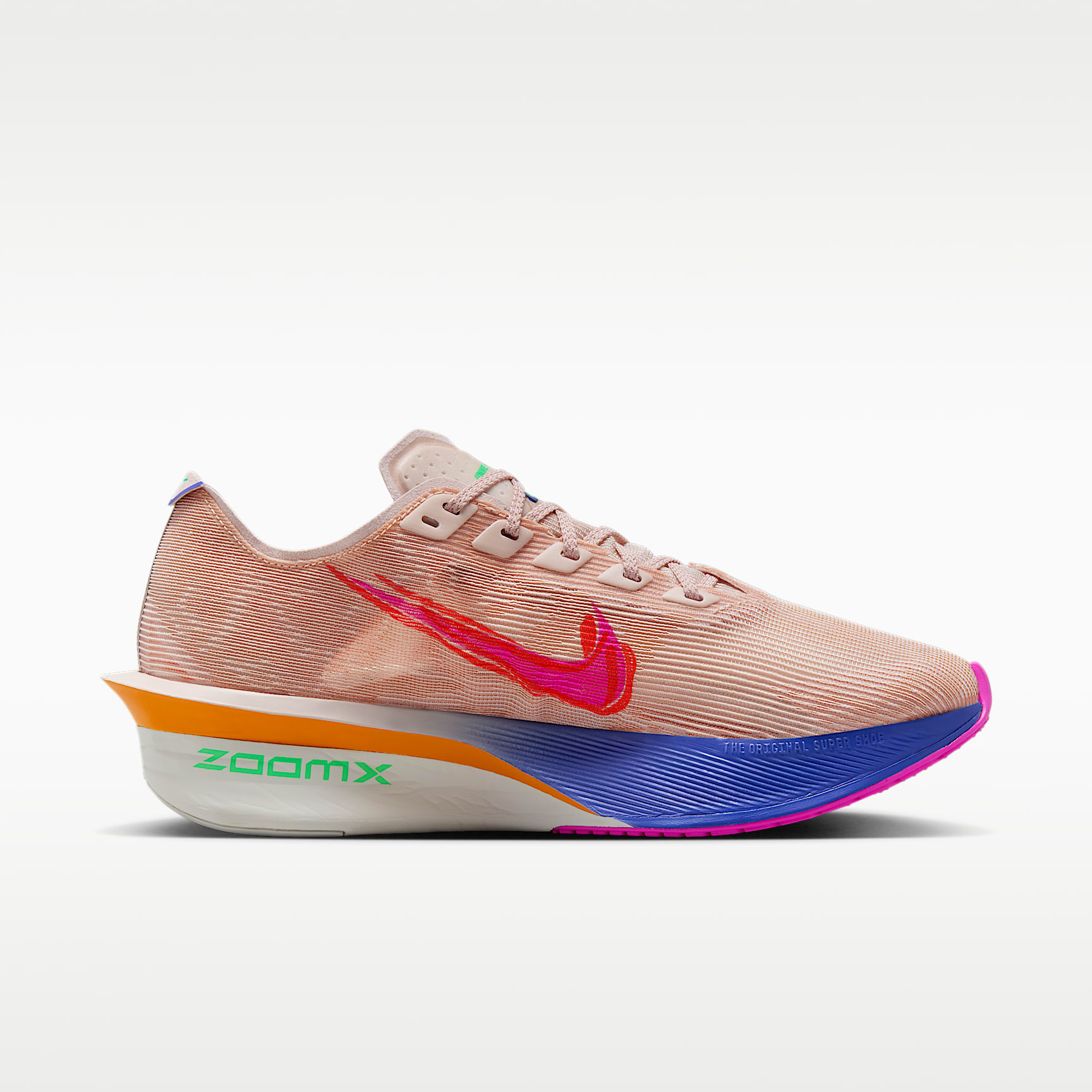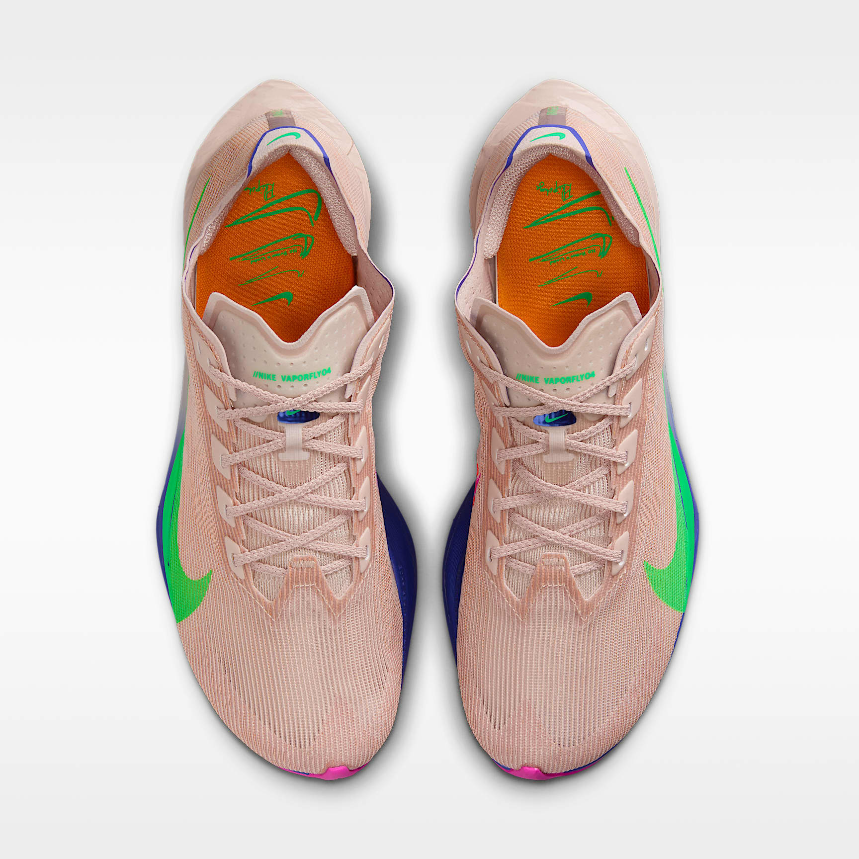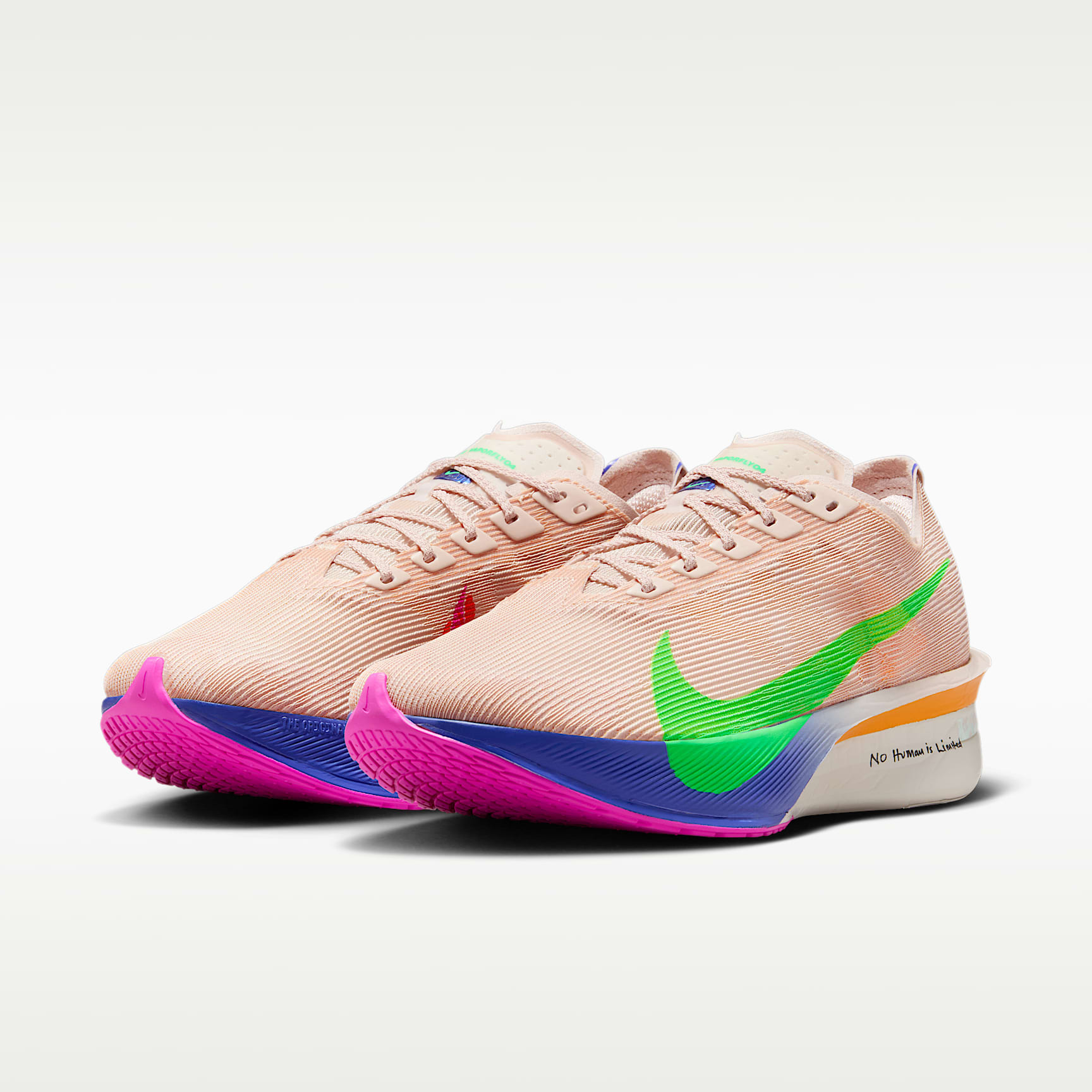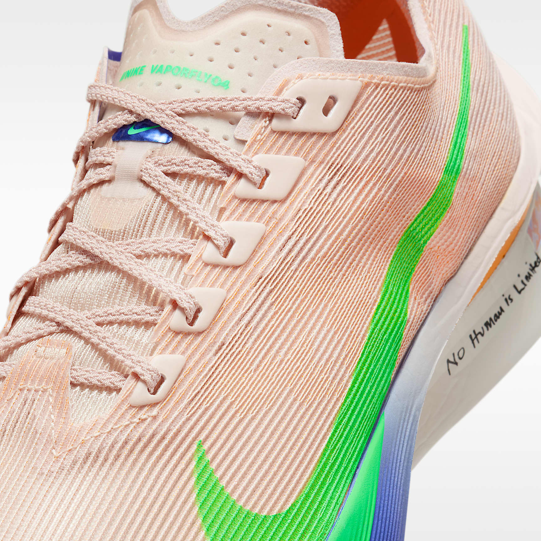 Ultralight design delivers a propulsive feel from a 10k to a marathon The new-look Vaporfly 4 "Eliud Kipchoge" is a lean, mean, mile-eating machine. We trimmed inessential weight in the midsole, outsole and upper from the Vapor 3 without sacrificing performance. The result is a lighter, more propulsive all-around racing shoe that’s trusted from the mile to the marathon. Behind the Design Eliud Kipchoge says achieving your dream isn't a solo endeavor, so we utilized his community in designing this shoe. His family influenced the color selection and the multi-style Swoosh logo, which represents the strength behind a team. "No human is limited" nods to the endless possibilities you have with a support system. Lighter Upper Engineered mesh helps reduce the weight of the shoe while providing a more consistent fit. And we saved more weight by reducing the size of the heel and tongue. Lighter Foam Engineered mesh helps reduce the weight of the shoe while providing a more consistent fit. And we saved more weight by reducing the size of the heel and tongue. Lighter Outsole We reduced the weight of the outsole by using a thinner rubber compared to the Vaporfly 3. Full Speed The full-length carbon fiber Flyplate has a higher angle than the Vaporfly 3 and combines with a lower heel-to-toe drop to give you a propulsive feel on race day. What's New? * Lighter upper, midsole, outsole * Higher plate angle * Lower heel-to-toe drop Product Details * Weight: Approx. 152g/5.4oz (Women's US 8) * Heel-to-toe drop: 6mm