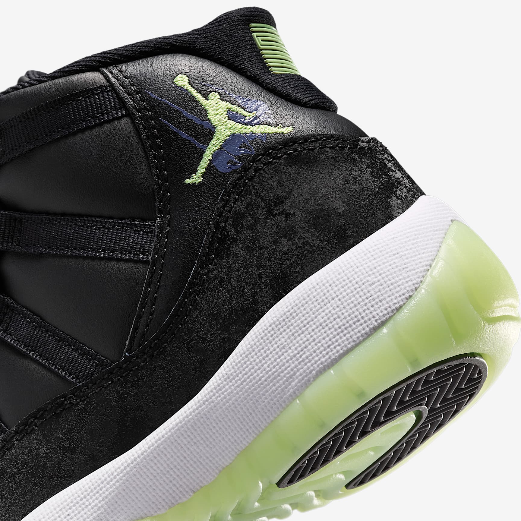 Light up the playground after dark. This edition of the eternally popular AJ11 brings you sleek style with real and synthetic leather, soft velvet accents and glow-in-the-dark details. An Air-cushioned midsole and carbon-fibre plate help you stay quick on your feet, so you can hustle home for dinner after knocking down that buzzer beater. Benefits * Genuine leather and fabric upper is durable and lightweight. * Encapsulated Air-Sole unit cushions your heel. * Rubber outsole with herringbone pattern adds traction. Product Details * Not intended for use as personal protective equipment (PPE)