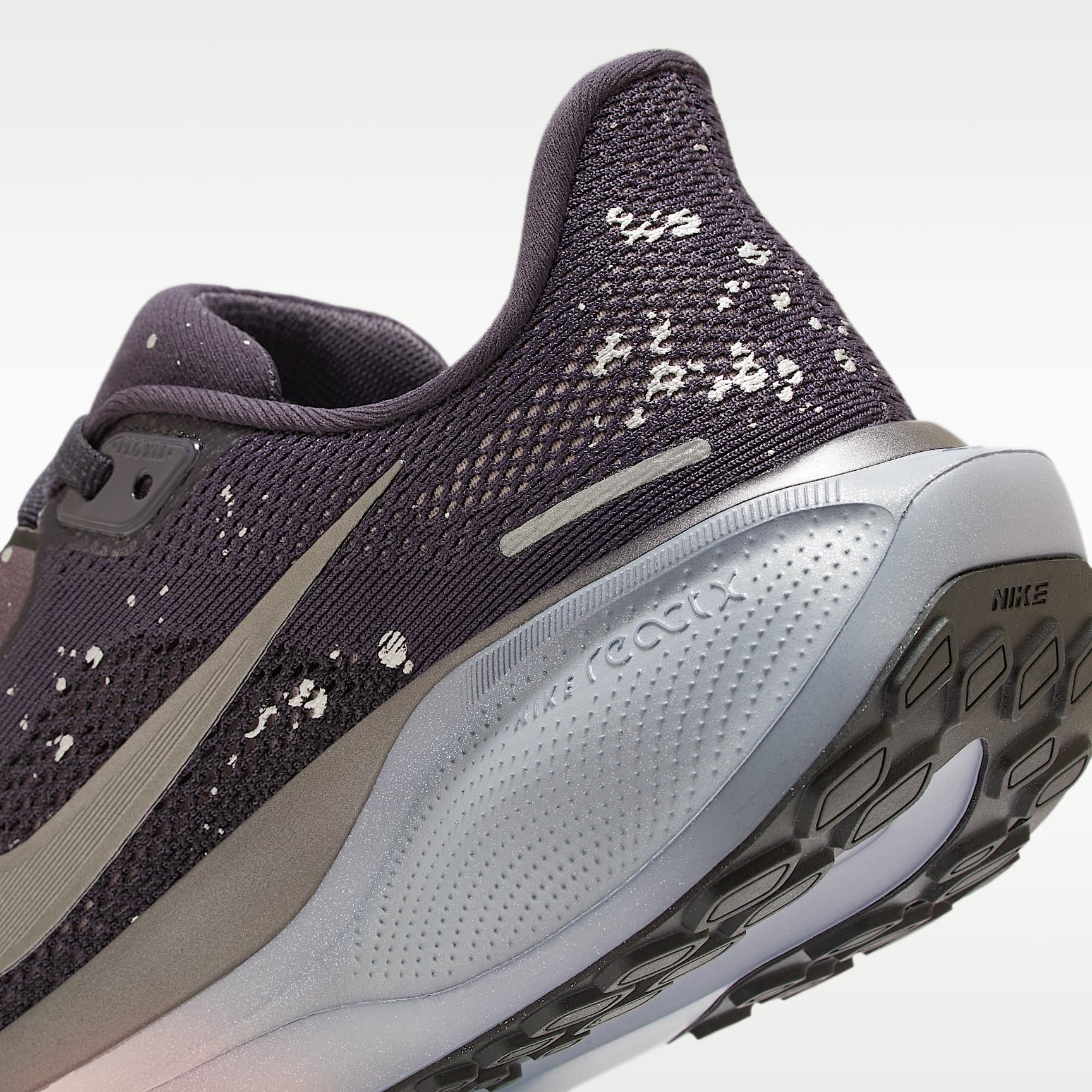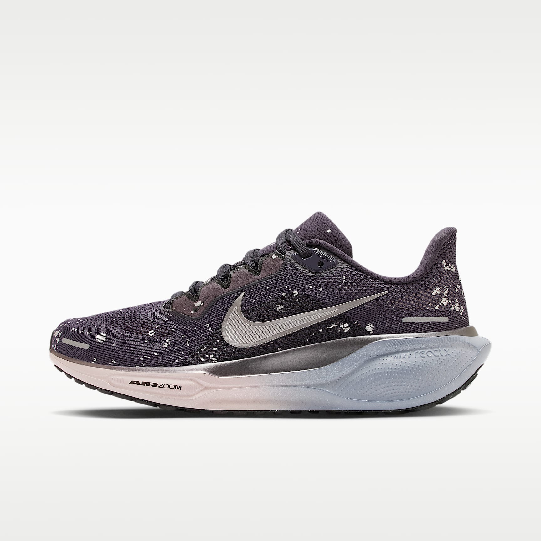 Responsive cushioning meets Air Zoom units for an energised ride. Responsive cushioning in the Pegasus provides an energised ride for everyday road running. Experience lighter-weight energy return with dual Air Zoom units and a ReactX foam midsole. Plus, the improved engineered mesh on the upper helps decrease weight and increase breathability. Engineered mesh upper The lightweight, breathable mesh on the upper strikes the ideal balance between comfort and containment. ReactX foam midsole Two Air Zoom units, at the forefoot and heel, are combine with soft, durable ReactX foam for a smooth, responsive ride. Waffle-inspired traction Our signature waffle-inspired rubber outsole provides durable traction and flexibility. Plush padding Padding on the collar, tongue and sockliner help give you a secure and comfortable fit. What's new? * Mesh upper is lighter and more breathable for increased comfort * The ReactX foam midsole is 13% more responsive than previous Nike React technology * Wider forefoot and heel help provide stability * Increased stack heights at the forefoot and heel add extra cushioning Product Details * Weight: approx. 251g (women's size 5.5) * Heel-to-toe drop: 10mm * MR-10 last—our best, most consistent fit (same as Pegasus 40) * Reflective design details * Not intended for use as personal protective equipment (PPE)