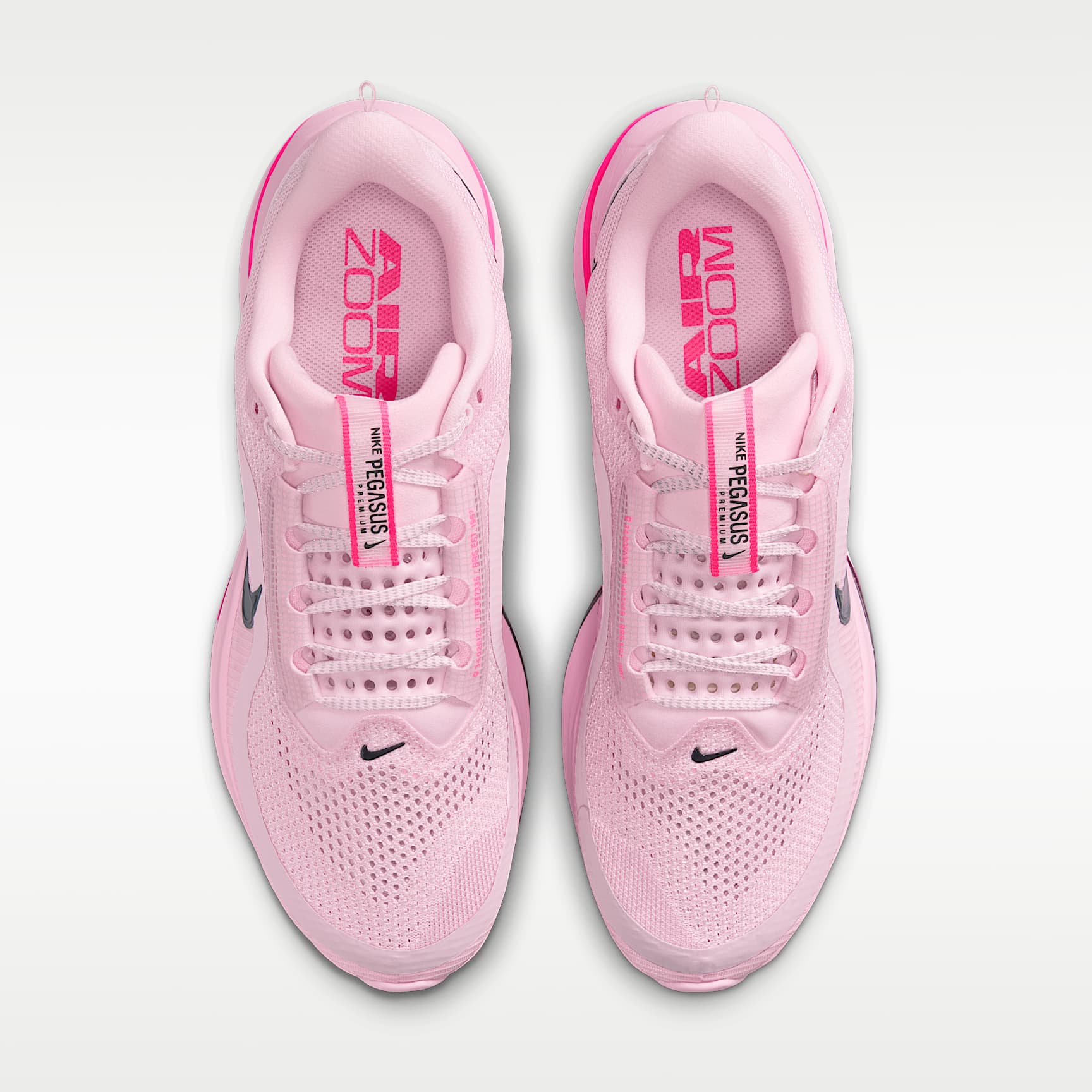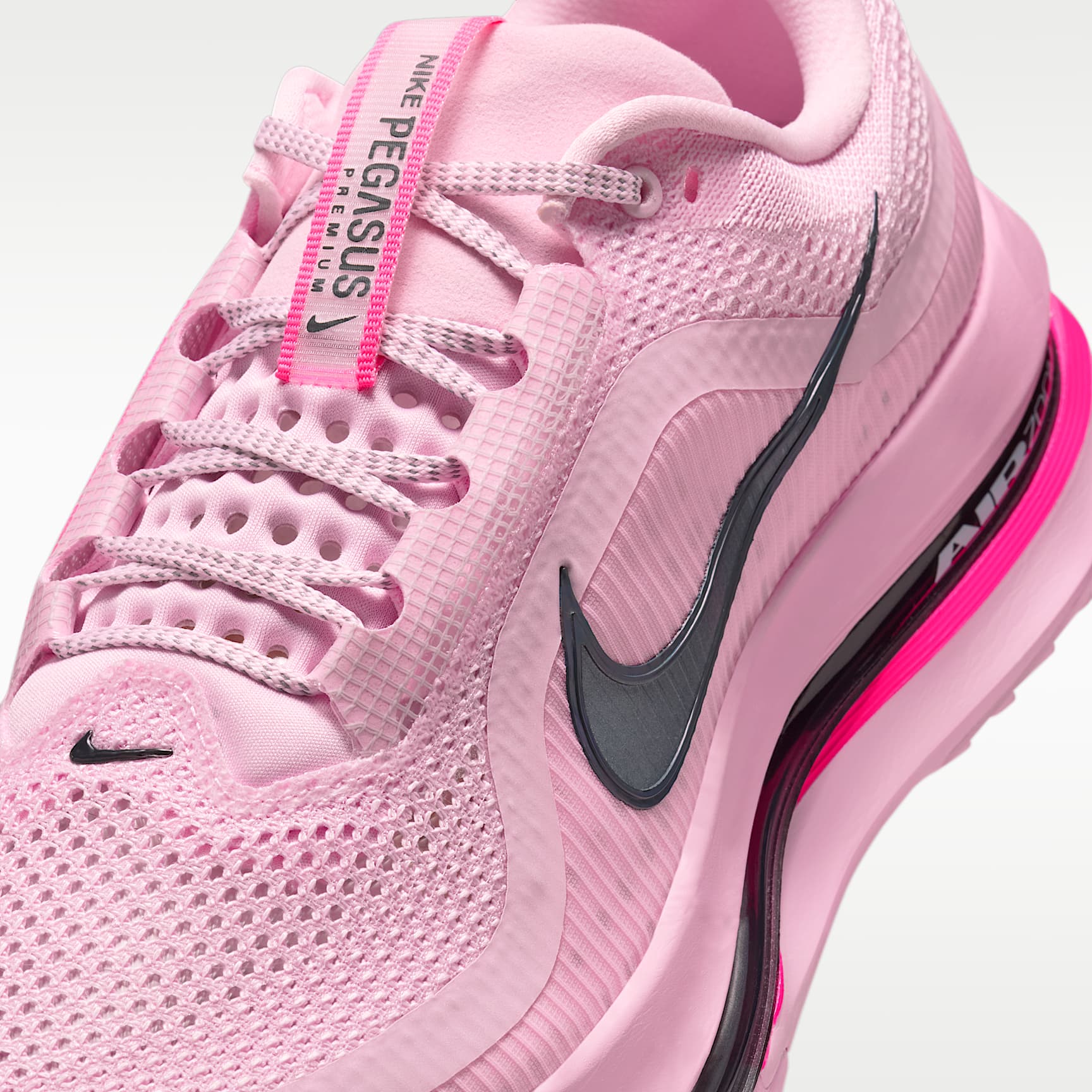 The Pegasus Premium supercharges responsive cushioning with a triple stack of our most powerful running technologies: ZoomX foam, a sculpted Air Zoom unit and ReactX foam. It's the most responsive Pegasus ever, providing high energy return unlike any other. With a lighter-than-air upper, it decreases weight and increases breathability so you can fly faster. Engineered mesh on the upper Breathable, lightweight engineered mesh helps keep you contained. ZoomX foam Your foot sits on top of full-length ZoomX foam, Nike's most responsive foam. It delivers incredible energy return with each stride. Full-length Air Zoom cushioning The full-length Air Zoom unit offers our optimal level of springiness underfoot, unlocking a level of speed and responsiveness that'll put pep in your miles. ReactX foam foundation ReactX foam, 13% more responsive than previous React technology, sits at the bottom of the ZoomX foam and Air Zoom cushioning. It offers a smooth and balanced ride. Modified Waffle outsole Modified Waffle outsole has high-abrasion rubber to provide traction. Product details * Weight: 325g approx. (men's UK 9) * Heel-to-toe drop: 10mm * Not intended for use as personal protective equipment (PPE)