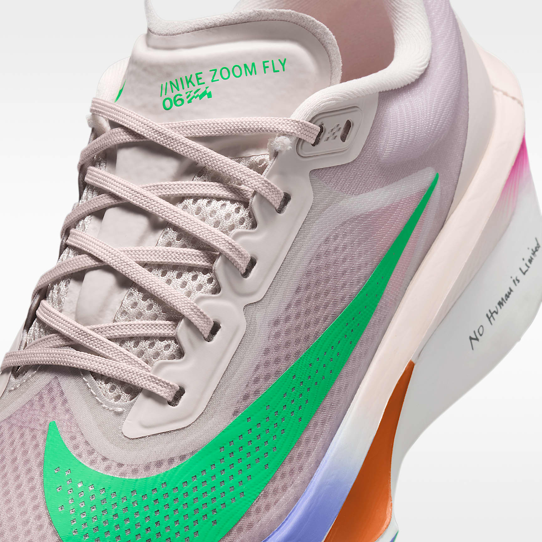 Responsive foam and a carbon fiber plate deliver a propulsive ride. The Zoom Fly 6 "Eliud Kipchoge" is with you every step of your run. Lighter than the Zoom Fly 5, it adds energy return to your every stride with responsive ZoomX cushioning. A carbon fiber Flyplate helps propel you to the finish line. Behind the Design Eliud Kipchoge says achieving your dream isn't a solo endeavor, so we utilized his community in designing this shoe. His family influenced the color selection and the multi-style Swoosh logo, which represents the strength behind a team. "No human is limited" nods to the endless possibilities you have with a support system. Light Foam ZoomX foam, Nike’s lightest and most responsive foam, delivers our most energy return with every stride you take. Full-Length Plate Full-length carbon fiber Flyplate increases efficiency and responsiveness. Grippy Outsole Thin rubber outsole is lightweight and grippy on the road. Product Details * Weight: Approx. 214 g/7.7 oz (Women's US 8) * Heel-to-toe drop: 8 mm * Not intended for use as Personal Protective Equipment (PPE)