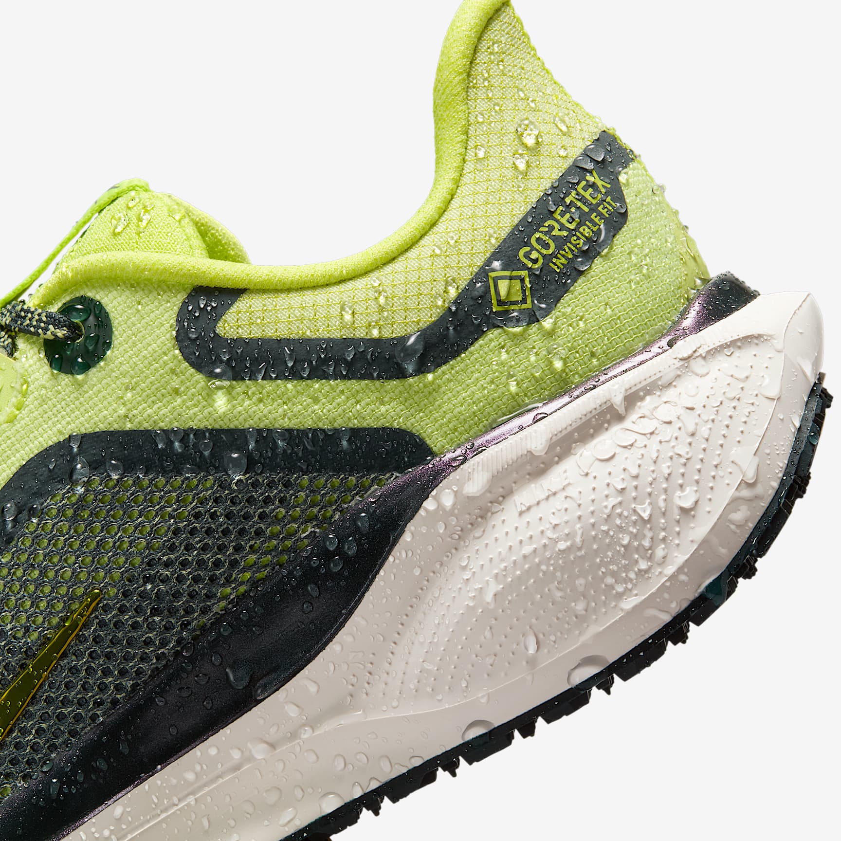 Springy foam and Air Zoom units energize your wet-weather runs. Responsive cushioning in the Pegasus provides an energized ride for wet-weather road running. Experience lighter-weight energy return with dual Air Zoom units and a ReactX foam midsole. Plus, a waterproof GORE-TEX upper and reflective details throughout help you comfortably take on the elements. GORE-TEX Upper Waterproof GORE-TEX upper and technical mesh help keep water out so your feet stay dry. Responsive Ride ReactX foam midsole surrounds forefoot and heel Air Zoom units for an energized ride. It's 13% more responsive than previous React technology. Storm-Tread Outsole Storm-Tread outsole provides traction in wet weather. Heathered Collar Heathered material around the collar helps keep your ankle warm. What's New? * ReactX foam midsole Product Details * Reflective GORE-TEX logo and Swoosh logo * Reflective graphics and overlays * Not intended for use as Personal Protective Equipment (PPE) * Weight: Approx. 251g/8.9 oz (Women's US 8) * Heel-to-toe drop: 10mm * MR-10 Last - Our best, most consistent fit (same as Pegasus 40) * Plush collar, tongue and sockliner