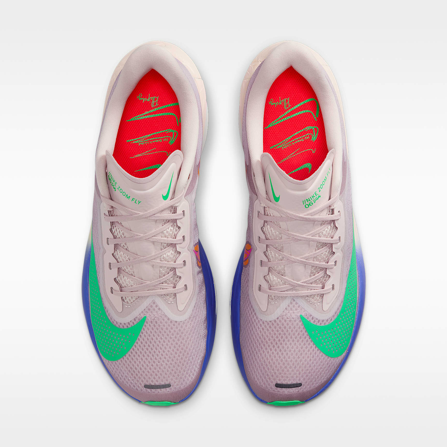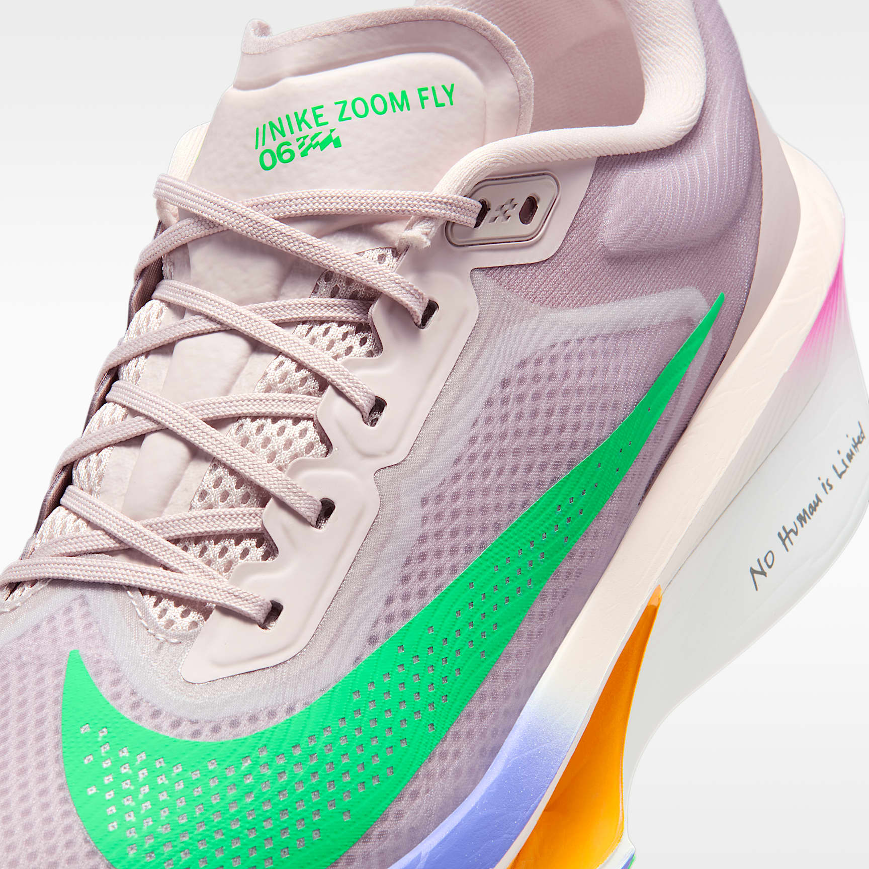 The Zoom Fly 6 is with you every step of your run. Lighter than the Zoom Fly 5, its responsive ZoomX foam adds energy return to each stride, while a carbon fiber plate helps propel you to the finish line. Keep Growing Whenever someone trains with Eliud Kipchoge, they're asked to plant a tree at his base camp to signify their growth. The sockliner graphics mimic that growth with branches moving forward towards the front of the shoe. The red clay color fade nods to the Kenyan dirt that stains the shoes when training. The font is a play on African trees that have fractal-like patterns on the surfaces. More Benefits * ZoomX foam, Nike’s lightest and most responsive foam, delivers our most energy return with every stride you take. * Full-length carbon fiber plate increases efficiency and responsiveness. * Thin rubber outsole is lightweight and grippy on the road. Product Details * Weight: Approx. 265 g/9.3 oz (Men's US 10) * Heel-to-toe drop: 8 mm * Synthetic leather on upper * Not intended for use as Personal Protective Equipment (PPE)