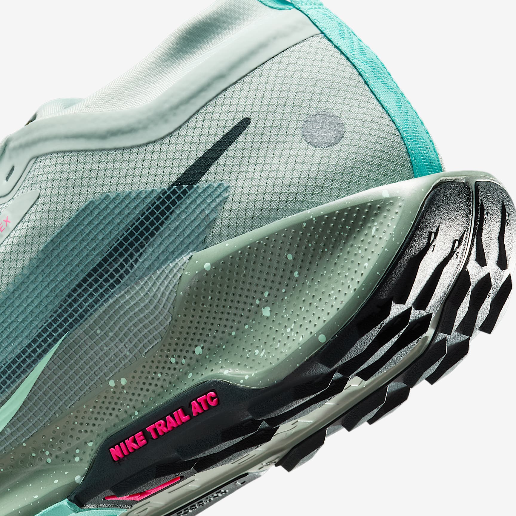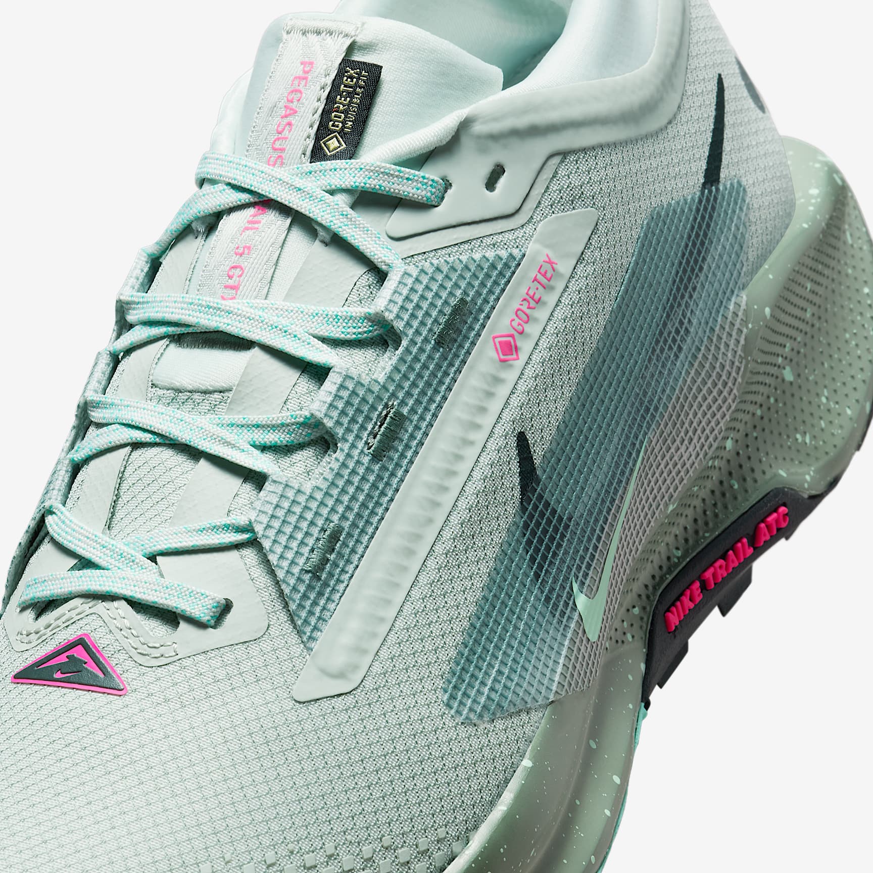 GORE-TEX tech and a grippy outsole provide wet-weather protection. The Pegasus Trail 5 provides wet-weather protection for trail running. A waterproof GORE-TEX upper, an all-terrain outsole and reflective details help you comfortably take on the elements. With a ReactX foam midsole, it gives you responsive cushioning for an energized ride. GORE-TEX Upper A waterproof GORE-TEX upper and 3-D print toe cap help keep water out so your feet stay dry. Responsive Ride Springy ReactX foam midsole gives you lightweight energy return. It's 13% more responsive than previous React technology. ATC Outsole Nike Trail All Terrain Compound (ATC) rubber outsole provides enhanced grip on steep inclines and in wet weather while giving you a smooth ride on the road. What's New? * ReactX foam midsole * Nike Trail ATC outsole Product Details * Weight: Approx. 300g/10.6oz (Men's US 10) * Heel-to-toe drop: 9.5mm * Reflective details at sides of heel * Not intended for use as Personal Protective Equipment (PPE)