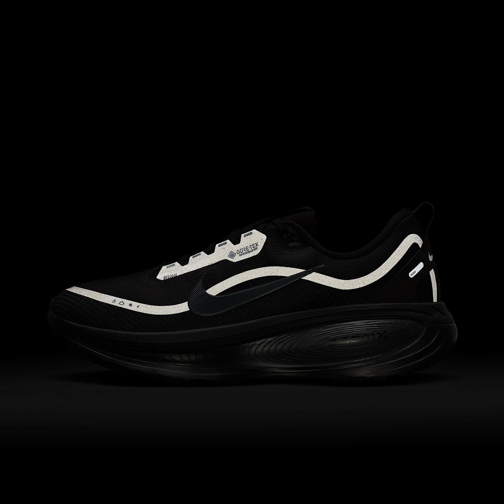 Waterproof tech meets maximum cushioning for a comfortable wet-weather ride. Maximum cushioning in the winterised Vomero 18 delivers a comfortable ride for rainy road runs. Experience optimal comfort with lightweight ZoomX foam stacked on top of responsive ReactX foam in the midsole. Plus, a waterproof GORE-TEX upper and reflective design details throughout help you comfortably take on the elements. Rain-ready upper Waterproof GORE-TEX lining and technical mesh upper keep your feet dry. Dual-density midsole We stacked ZoomX foam on top of ReactX foam for a soft, comfortable ride. Storm Tread outsole The Storm-Tread outsole provides traction and grip in wet, slippery conditions. What's new? * Waterproof GORE-TEX liner and mesh upper * ZoomX foam stacked on top of ReactX foam * Higher stack height compared to Vomero 17 * 13% more responsive than previous React technology Product Details * Reflective design details on upper * Not intended for use as personal protective equipment (PPE) * Weight: Approx. 329g/9 oz (Men's US 10) * Heel-to-toe drop: 10mm