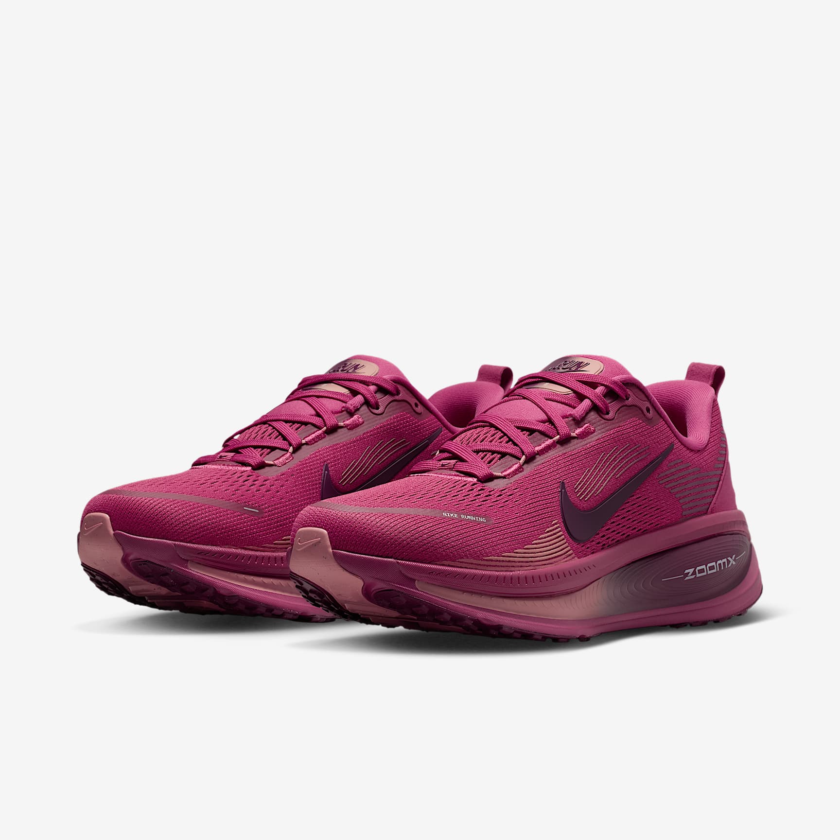 Maximum cushioning in the Vomero provides a comfortable ride for everyday runs. Our softest, most cushioned ride has lightweight ZoomX foam stacked on top of responsive ReactX foam in the midsole. Plus, a redesigned traction pattern offers a smooth heel-to-toe transition. Engineered Mesh Upper The upper is made of engineered mesh for soft breathability. Dual-Density Midsole Our dual-density midsole has ZoomX foam stacked on top of ReactX foam, 13% more responsive than previous React technology, for a comfortable ride. Pods Around Outsole We placed pods around the outsole to help enhance agility and smoother heel-to-toe transitions. Plush Padding A plush tongue and lining give you a comfortably snug feel. What’s New? Newly stacked foam midsole with premium ZoomX on top of ReactX foam amplifies cushioned comfort. Product Details * Weight: Approx. 263g/9.3oz (Women’s US 8) * Heel-to-toe drop: 10mm * MR-10 Last - Our best, most consistent fit * Not intended for use as Personal Protective Equipment (PPE)