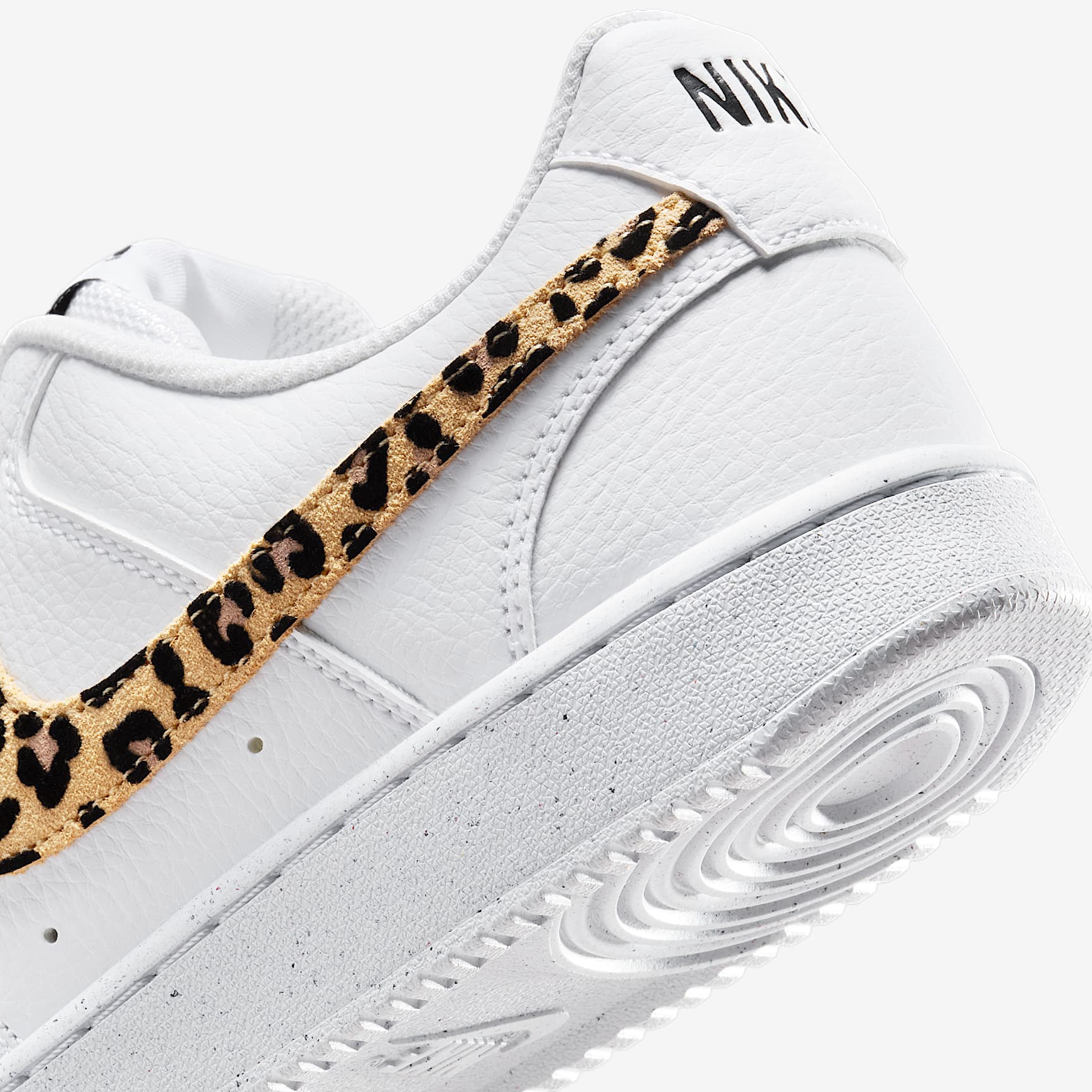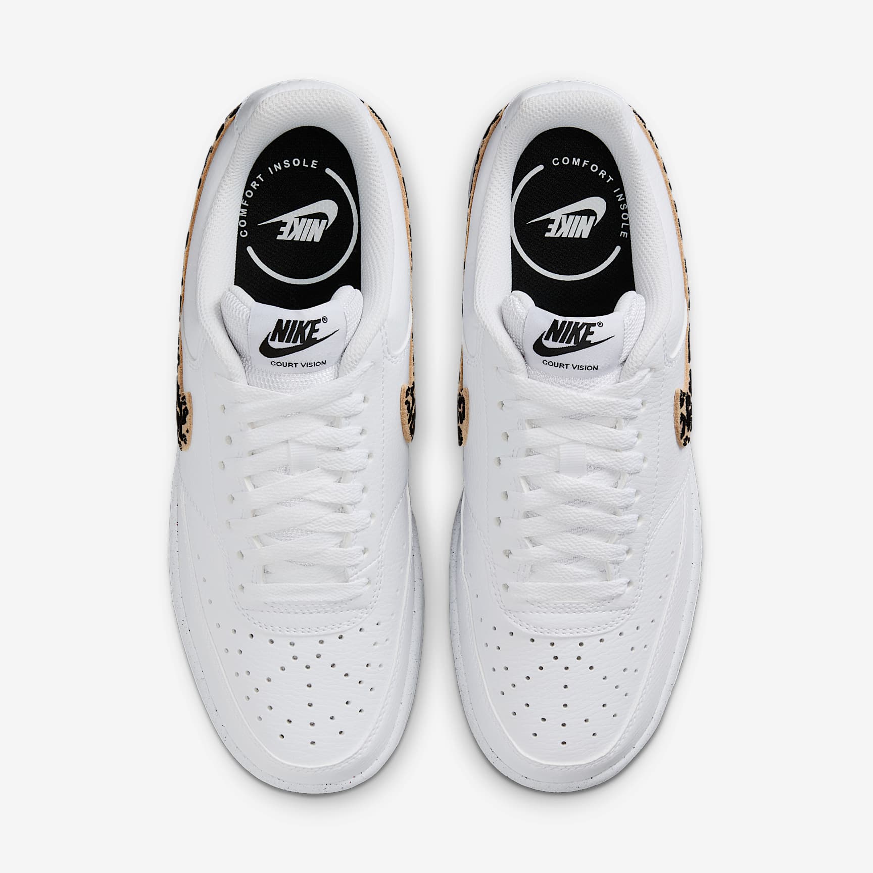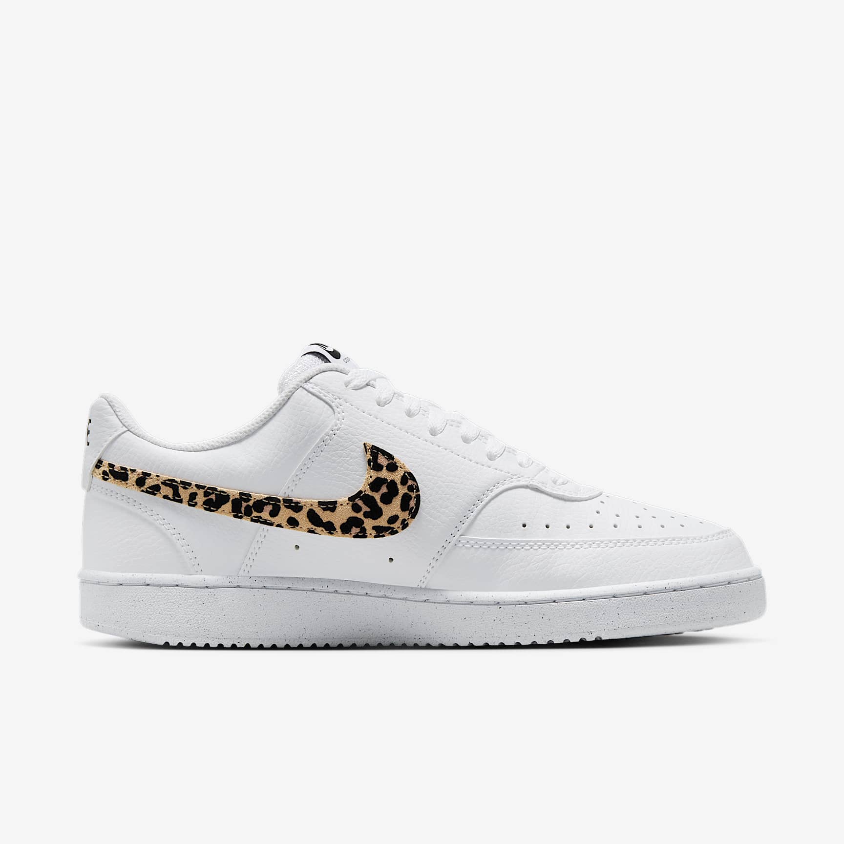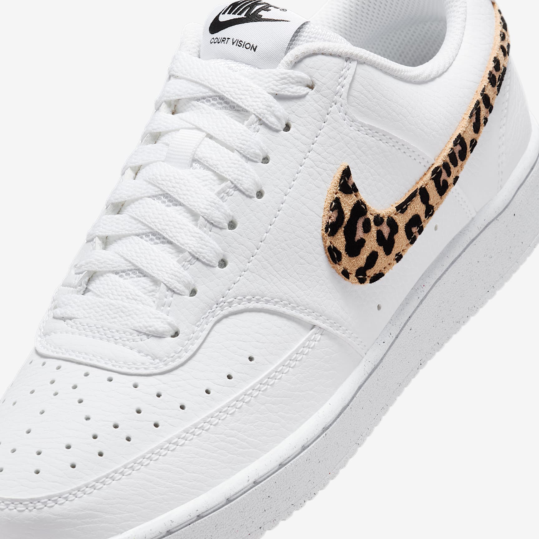 The fastbreak style of '80s basketball meets your everyday with the Nike Court Vision Low. It features an upper inspired by old-school basketball sneakers and the classic rubber cupsole featured on some of the most iconic silhouettes of the past. This version is finished with a suede, leopard-print Swoosh logo for a fierce look. Benefits * Leather upper with perforated toe box is breathable and comfortable. * Rubber cupsole adds durability, support and traction. Product Details * Low-cut silhouette * Padded collar