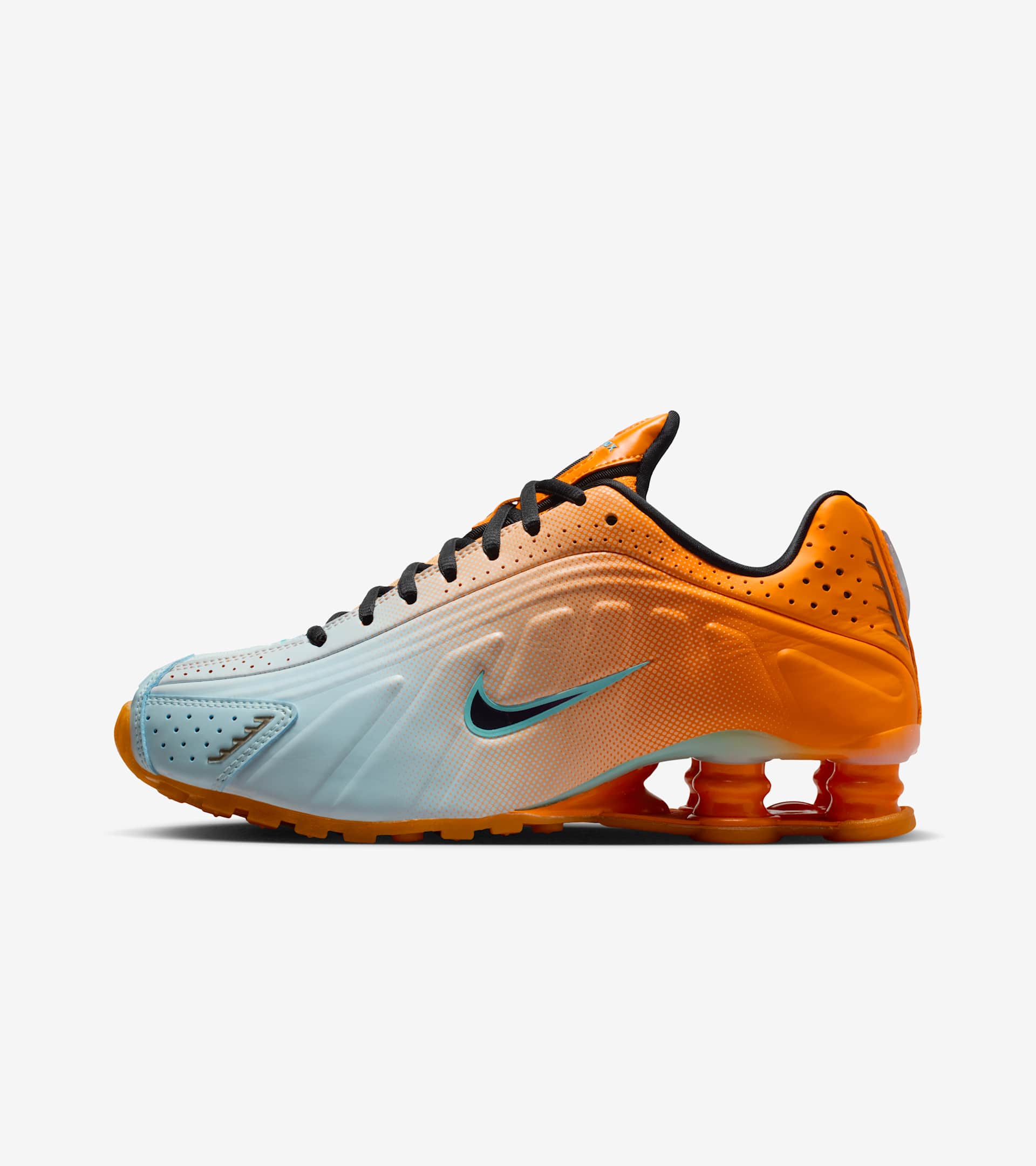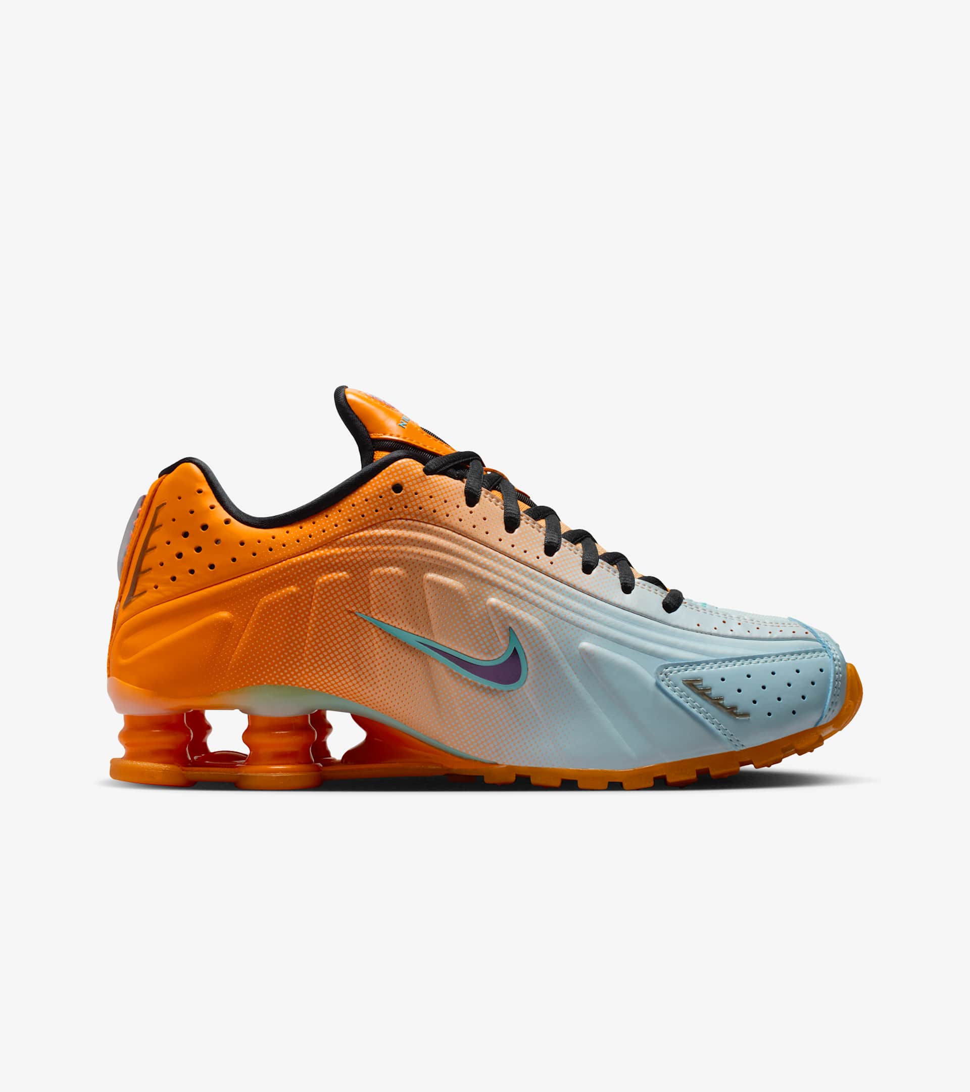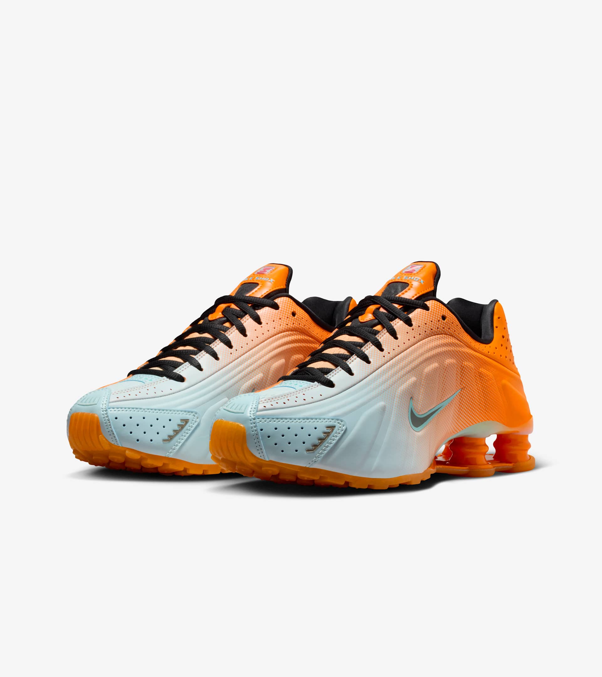 Inspired by the colours of Miami and the boundary-pushing artists that converge there yearly, this Shox R4 comes in hot with Vivid Orange and Glacier Blue fading into one another. Reflective design details shimmer and pop with your every step. The Shox R4 has always been a distinct shoe with its standout heel, but combined with the bold and bright design, we dare you to find a stronger statement piece. SKU: IH2343-801