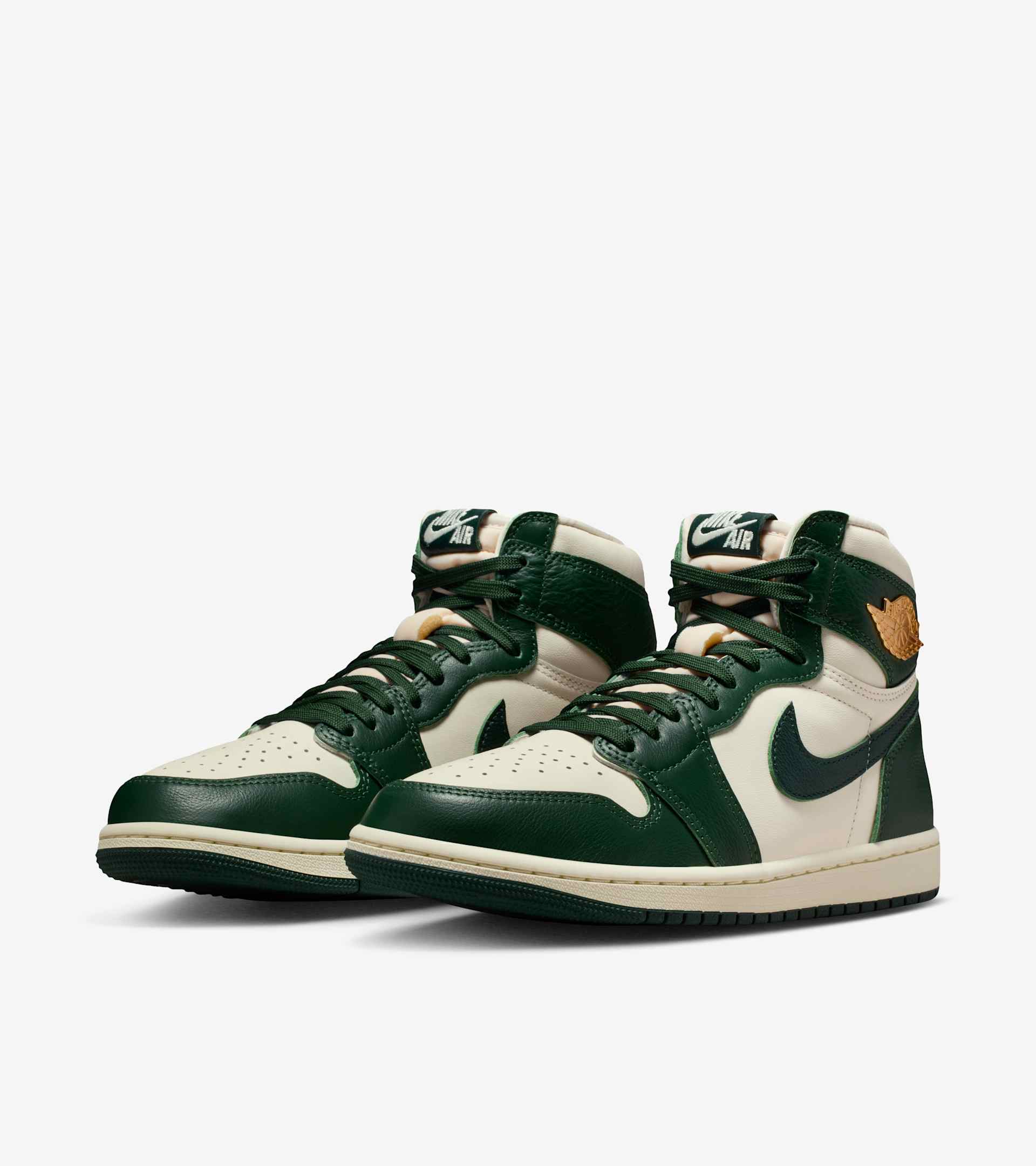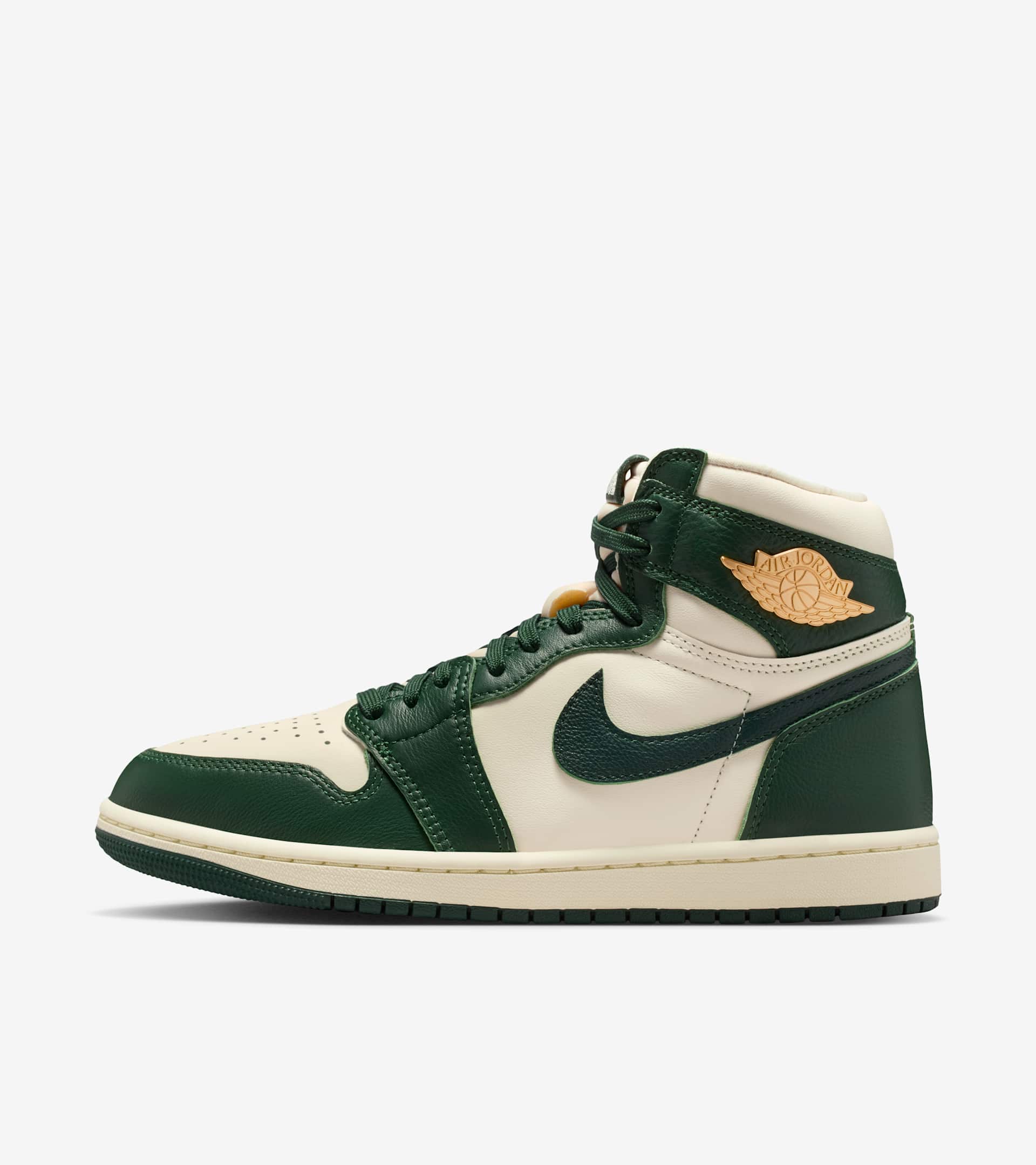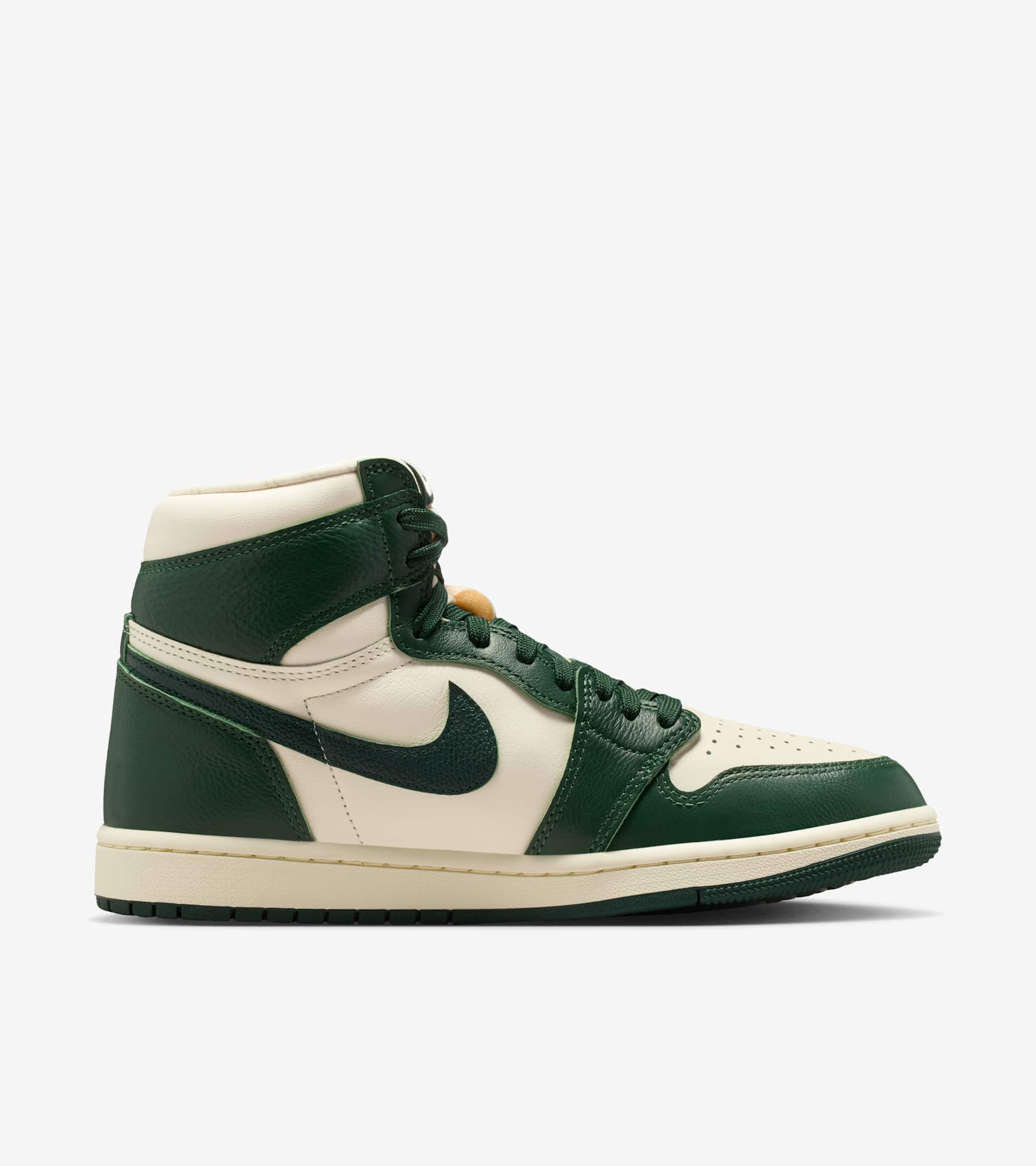 This autumn-inspired AJ1 pairs premium leather and earthy hues to finish off your autumn fits with an iconic Jordan Brand spin. Fir Green overlays add refreshing warmth against the smooth Pale Ivory upper, while deeper Pro Green accents punctuate the season. A Brushed Gold Wings logo and woven Nike Air tongue label hook it back to the original—in elevated fashion. The classic lightweight cushioning, padded collar and pristine finishes let you lace up this seasonal sneaker and rock it all year long. SKU: FD2596-101