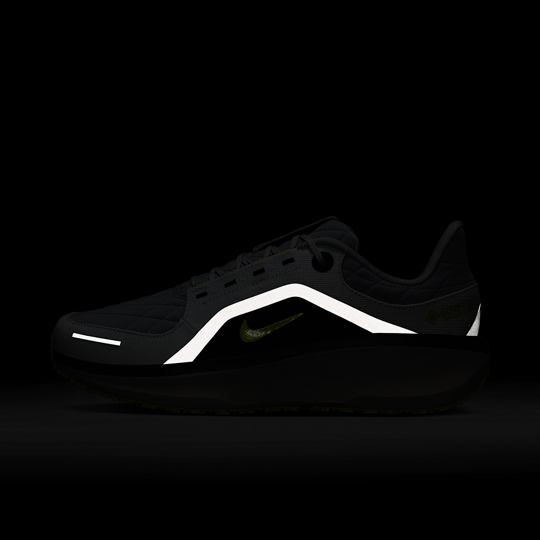 Springy Nike Air and soft foam energize your wet-weather runs. With a waterproof GORE-TEX upper and reflective details, this Winflo 11 provides a balanced ride for wet-weather runs. Experience energy return with a combination of Cushlon 3.0 foam and a full-length Nike Air unit in the midsole. Plus, a spacious forefoot provides an accommodating, comfortable fit. GORE-TEX Upper The waterproof GORE-TEX upper helps keep water out so your feet dry. Responsive Ride Our Cushlon 3.0 foam midsole combines with a full-length Nike Air unit to energize each step. Reliable Traction Rubber waffle-inspired outsole offers reliable traction. What’s New? * More space in forefoot * Wider heel * Added breathability * Heathered material around collar for ankle warmth Product Details * Reflective Swoosh logos and heel graphic * Not intended for use as Personal Protective Equipment (PPE) * Weight: Approx. 325g/11.5oz (Men’s US 10) * Heel-to-toe drop: 10mm * MR-10 Last - Our best, most consistent fit