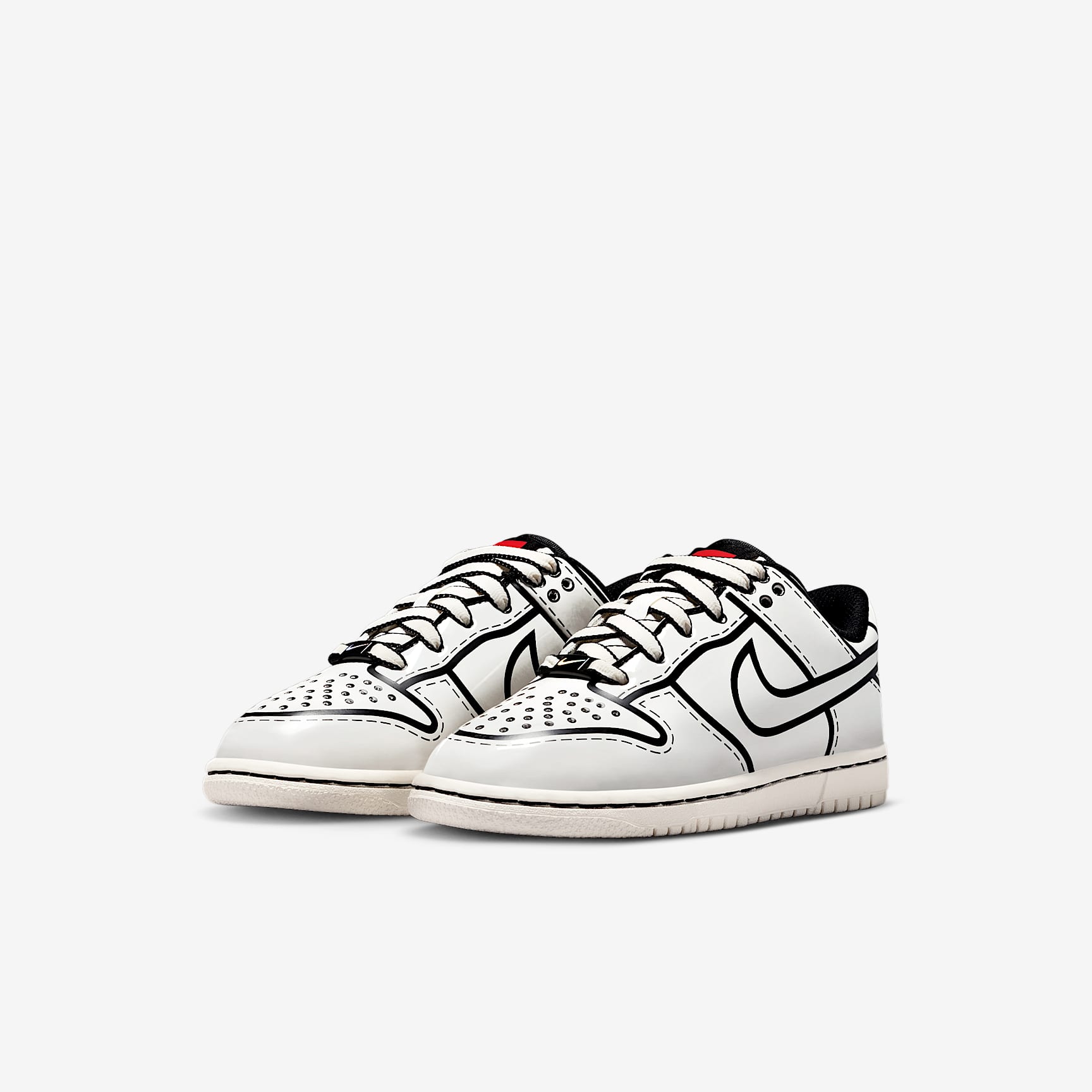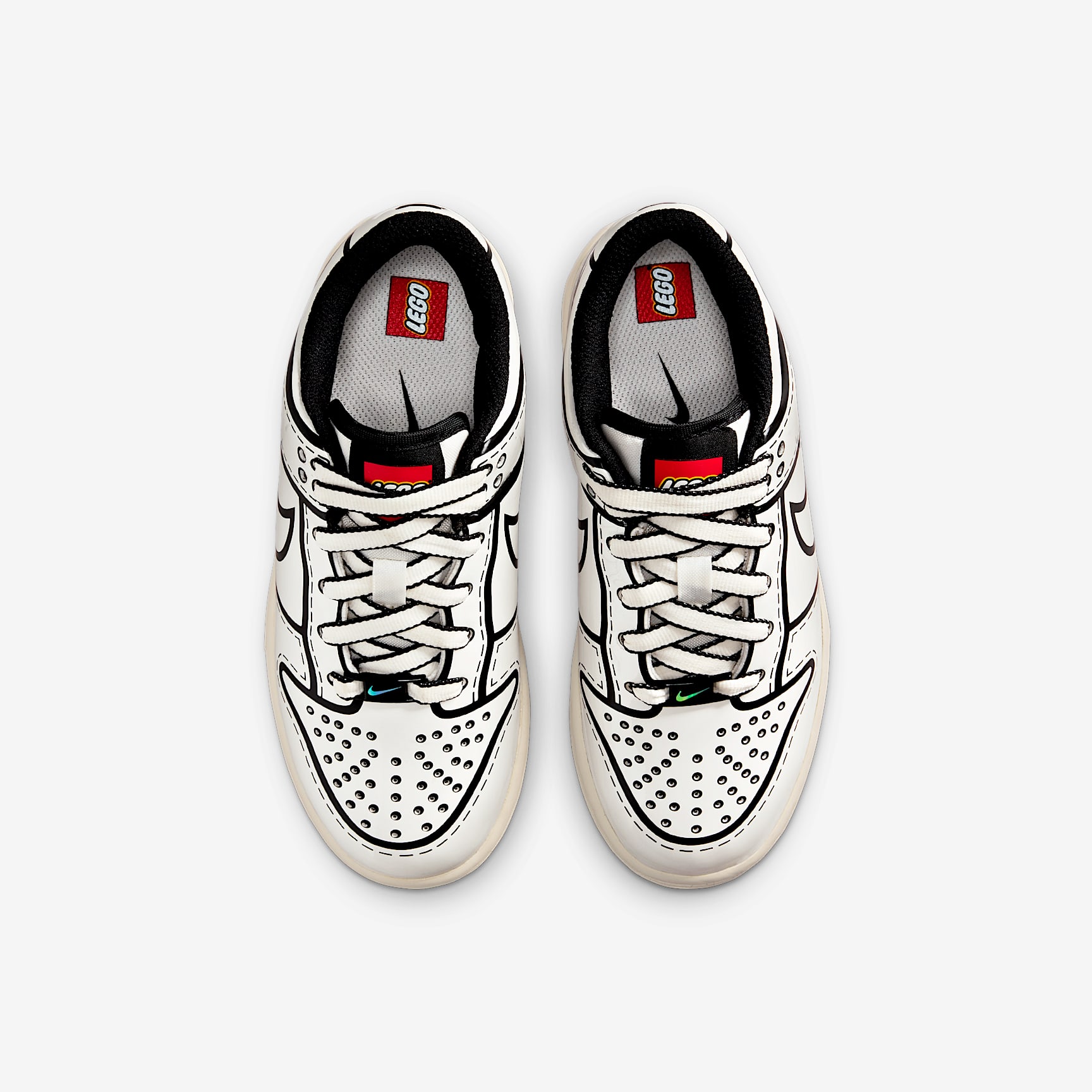 What do the Dunk and LEGO® Minifigures have in common? Both look good however you style them. Put your kid in the designer's seat with a Dunk that's truly a blank canvas. It features a flat, one-piece upper and a box you can assemble into a play chest—the possibilities are endless! Make it their own The painted-on aesthetic highlights the Dunk's signature stitching, and takes inspiration from Minifigure designs. All that's missing is your little one's artistic touch—the sky's the limit! Play-ready traction The rubber outsole featuring a classic pivot circle adds durable traction and heritage style. Plush Comfort Foam underfoot offers lightweight, responsive cushioning. Product Details * Classic laces * Padded collar * Cupsole construction Nike Dunk Born from a series of mash-ups, hacks and tight deadlines, the Nike Dunk landed on university basketball courts during the '85–'86 season. While the original 'College Colours' designs helped you stay true to your school, the Dunk didn't prove to be popular. But it was this humble sneaker's lack of popularity—and flat, grippy soles—that helped it jump the rails to captivate skateboarders. Decades later, this everyday favourite continues to be snatched up in countless colourways, proving its influence is undeniable.