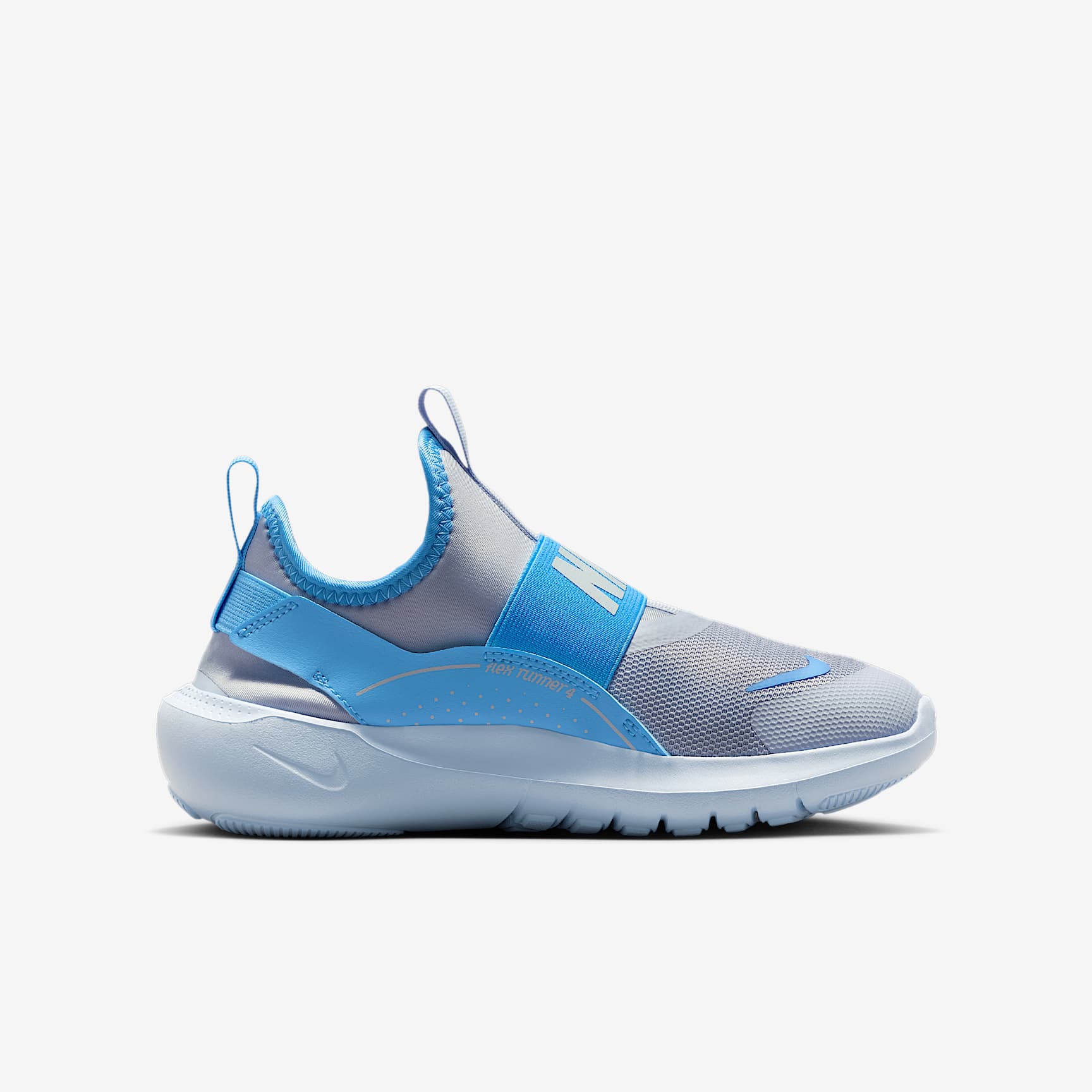 With the Flex Runner 4, you're always ready to race into fun. A flexible, bootie-like design makes it easy to pull on, while stretchy straps help secure your fit. Flex grooves in the outsole let your feet move naturally, helping you find your stride. What's New You spoke and we listened. For the Flex Runner 4, we updated the fit of the midfoot strap and the collar to help make these easy to slip on and comfortable enough to wear all day. Pull on and Go Pull tabs on the heel and tongue work with a stretchy inner sleeve to help make these shoes easy to put on. Elastic straps run behind your heel and across the top of your foot to provide a snug, secure feel. Play Anywhere Flex grooves in the outsole add flexibility, helping every step feel natural. Multisurface traction works with sturdy foam that wraps around the heel to provide grip and stability when you shift directions. Durable Comfort We reinforced the toe box and used durable materials throughout to help these kicks stand up to how kids like you play. Soft, springy foam in the midsole helps cushion your every step.