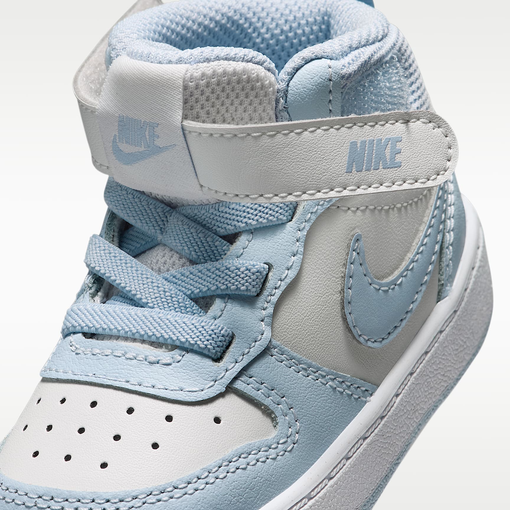 ALL-STAR COMFORT. Your little one will feel like an all-star off the court with the Nike Court Borough Mid 2. The classic mid-top design features durable leather for a premium look and feel. A hook-and-loop strap makes it easy to take the shoe on and off. Benefits * Leather is durable and easy to clean. * Elastic laces and a hook-and-loop strap make it easy to take the shoe on and off. * Padding around the tongue and ankle provides extra comfort. * Grooves in the sole make it flexible. Product Details * Cupsole construction for a classic look and feel