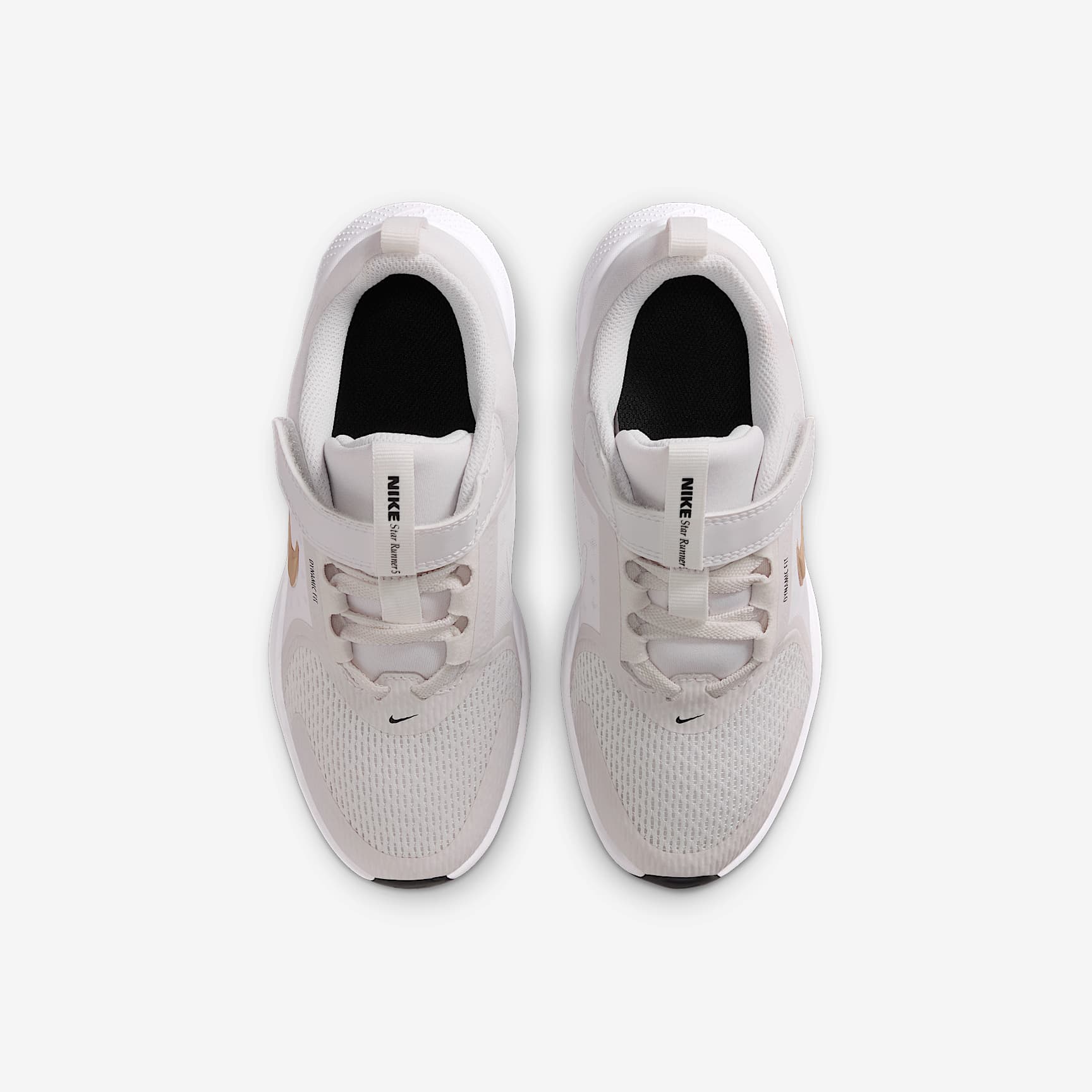 Breathable and lightweight, the Nike Star Runner 5 will have your little one dreaming of all the ways they can run and play. Springy cushioning and a secure fit help them make the most out of playtime. Keep cool Breathable mesh and airy knits keep the upper lightweight and flexible, helping little feet stay cool and comfortable. We reinforced the toes for added durability. Secure fit A Dynamic Fit band wraps around the middle of the foot and works with stretchy elastic laces to give kids a stable, held-in feel. An adjustable hook-and-loop strap helps kids secure their fit fast. Spring into action We packed the midsole with foam, helping add soft and springy cushioning to kids' every stride. Get a grip Durable rubber lugs on the outsole help provide added traction where little runners need it most. Product details * Elastic laces * Pull tab on tongue