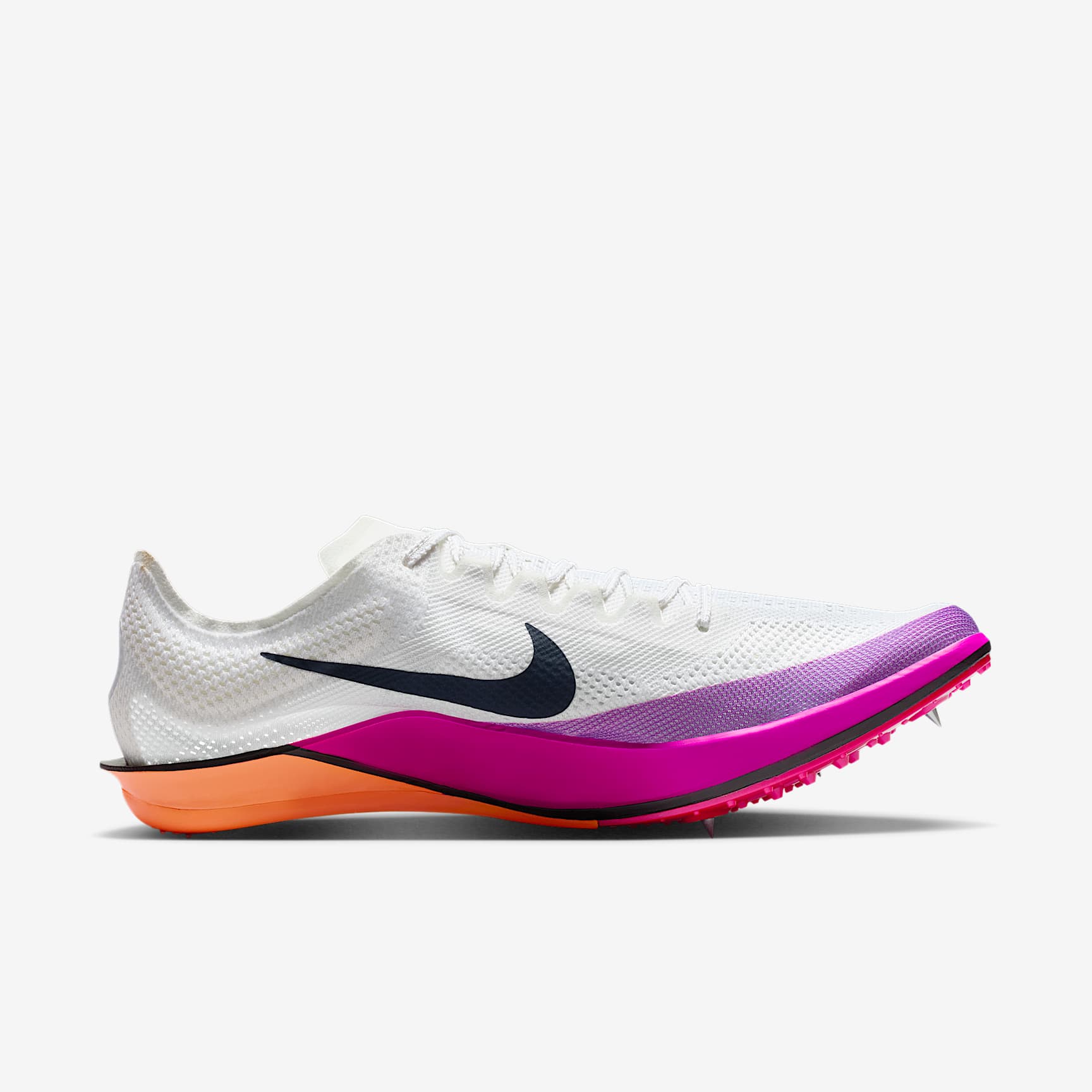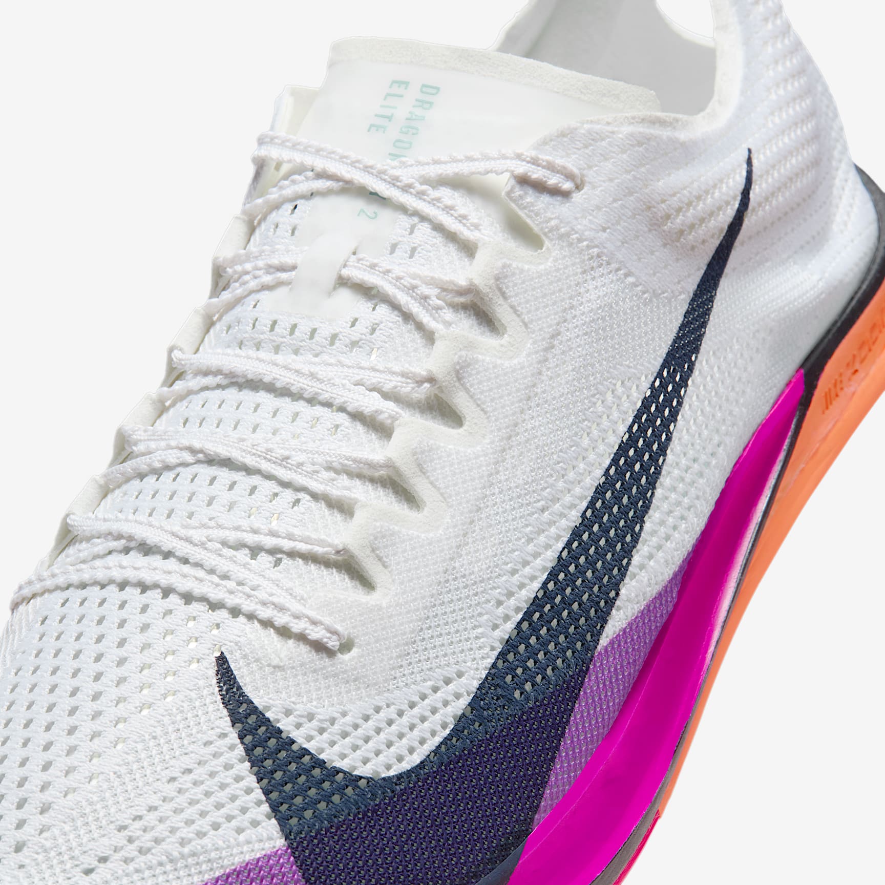 Ultralight foam and carbon plate help unlock your race-day speed. Our most dominant distance track spikes are back at the starting line, ready to break even more world records. Now loaded with an ultralight ZoomX foam and a responsive carbon plate, the Dragonfly 2 Elite can help unleash a new level of speed you’ll want to save for race day. It's donned by the fastest 5K and 10K runners in the sport, who are ready to reach new heights. Engineered Upper New yarns and engineered upper enhance breathability and comfort. The upper's conforming fit gives a disappearing sensation that is built to go the distance. Heel is reinforced to help improve stability. ZoomX Foam Full-length ZoomX foam, Nike’s lightest and most resilient foam, delivering a high level of energy return with every stride you take. Stable Connection Four permanent spikes help reduce the weight of the plate and create a wide, flat platform for a stable connection to the track. Carbon Plate Carbon unlocks plate response and helps reduce weight. The curved design gives you a propulsive feel. What's New? A slightly wider midfoot and forefoot compared to the previous iteration improve the feeling of stability on straightaways and especially around the turns.