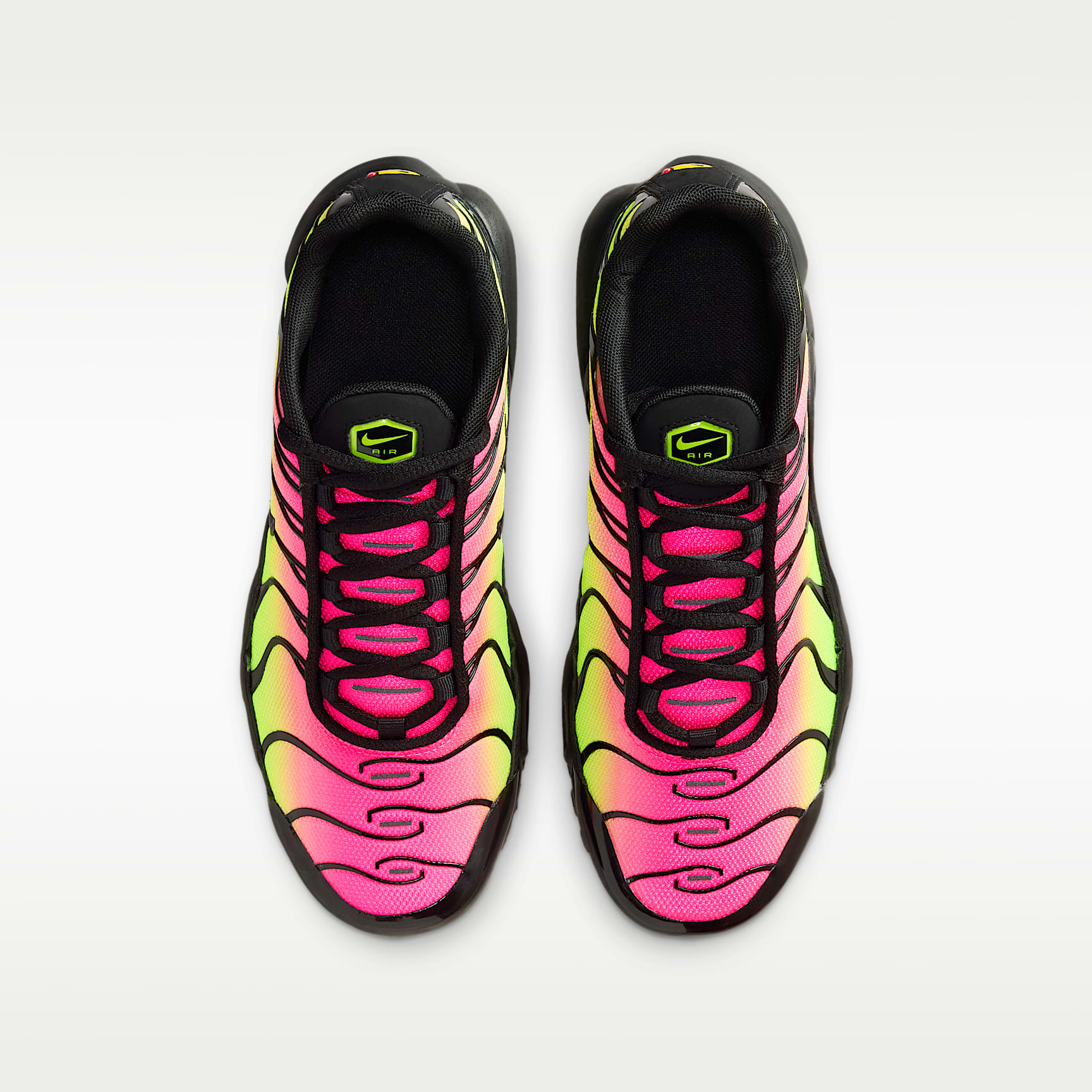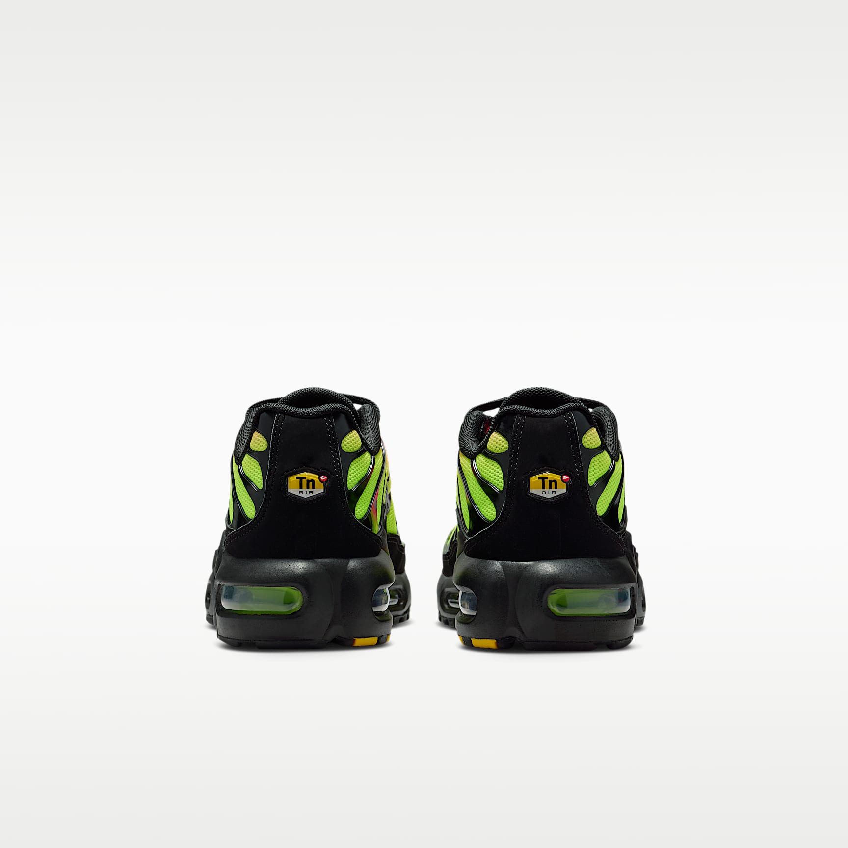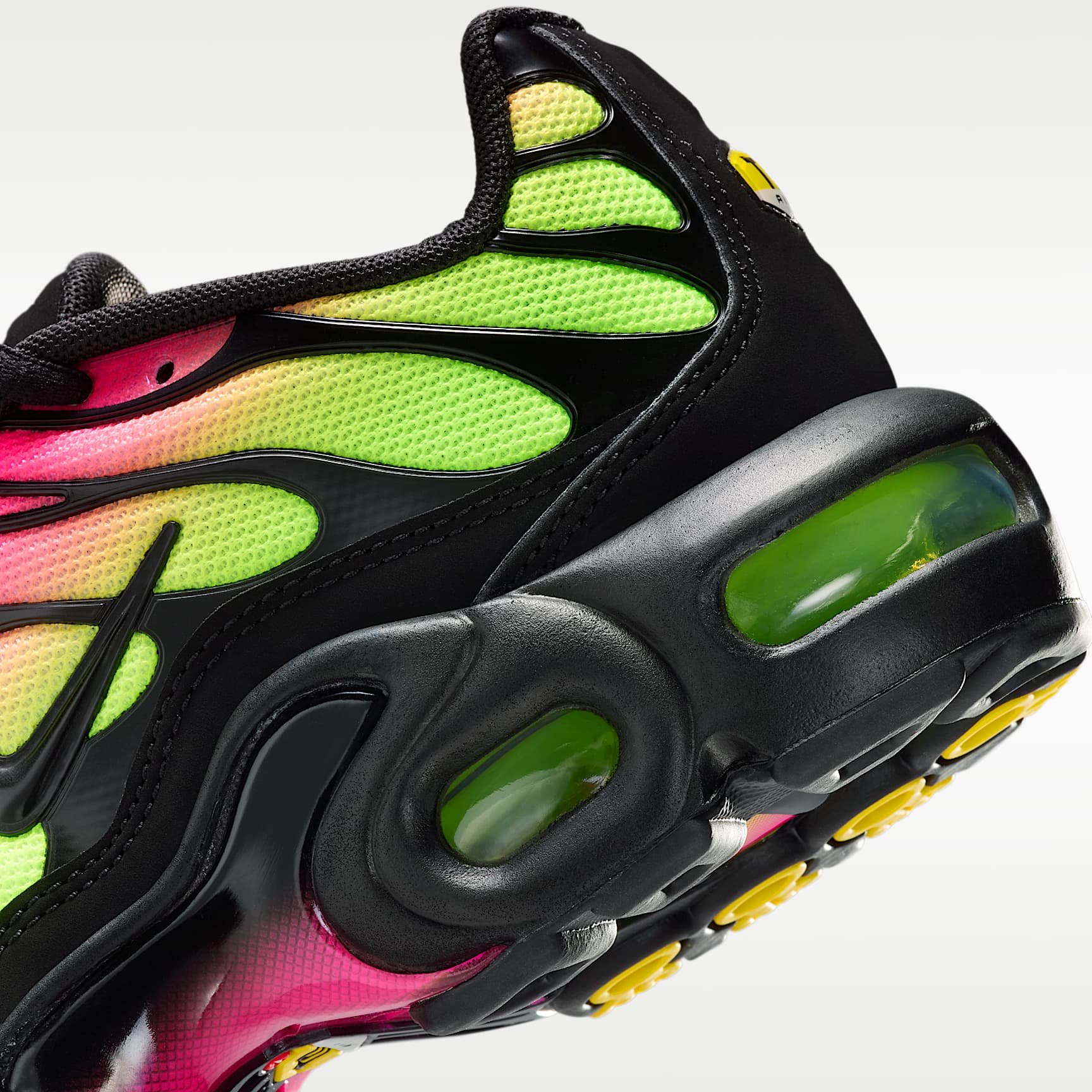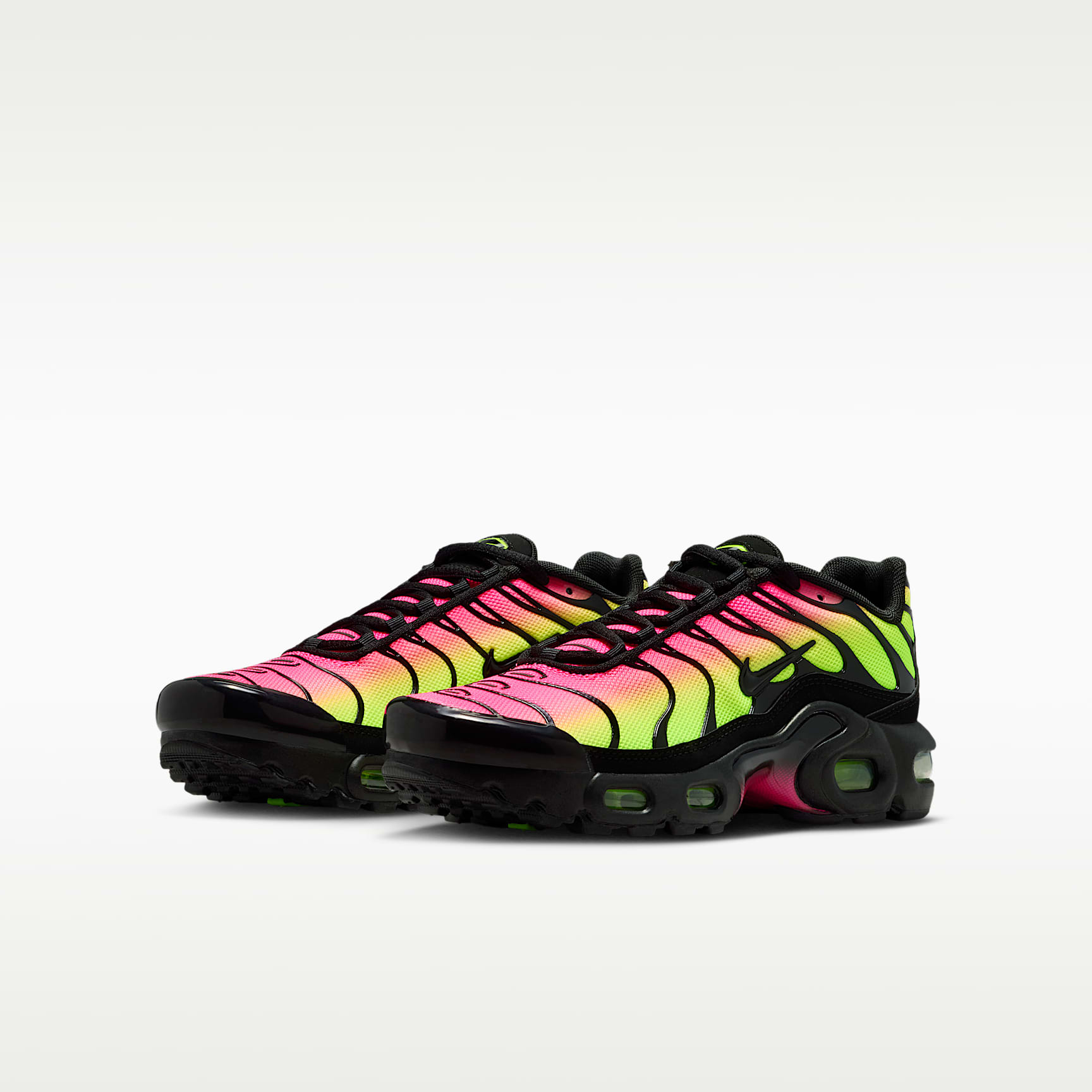 Who says kids don't deserve big cushioning? Not us. Get a taste of our legendary Tuned Air technology with the Nike Air Max Plus. From the school yard to your backyard, these comfy kicks are ready to play with breathable mesh fabric up top and a durable rubber sole underfoot. Plus, wavy design lines and iconic plastic accents celebrate bold style. Beach Trip Add a touch of the beach to your everyday style. The wavy lines of the iconic plastic cage draw inspiration from palm trees and ocean waves. Plus, the supportive midfoot arch draws inspiration from a whale's tail. Comfy Cushioning Originally designed for performance running, a Max Air unit provides lightweight cushioning that lasts. Durable Traction Rubber sole with tread pattern helps add durable traction so you're free to hop, skip and jump. Plastic toe tip adds durability and shine while flex grooves help make every step feel natural. Play All Day Synthetic upper with lightweight mesh adds breathability and durability. Product Details * Classic laces * Reflective elements * Not intended for use as Personal Protective Equipment (PPE)