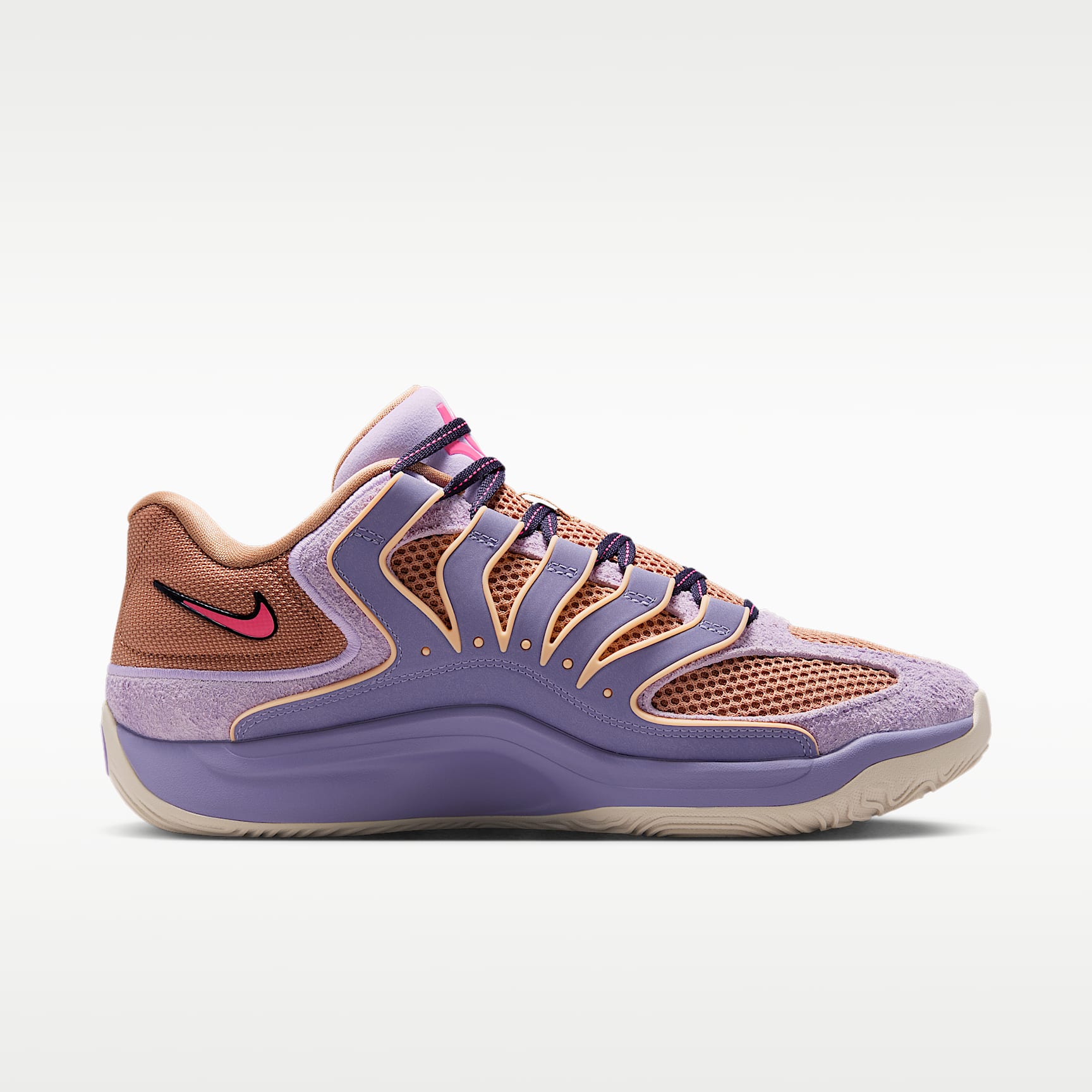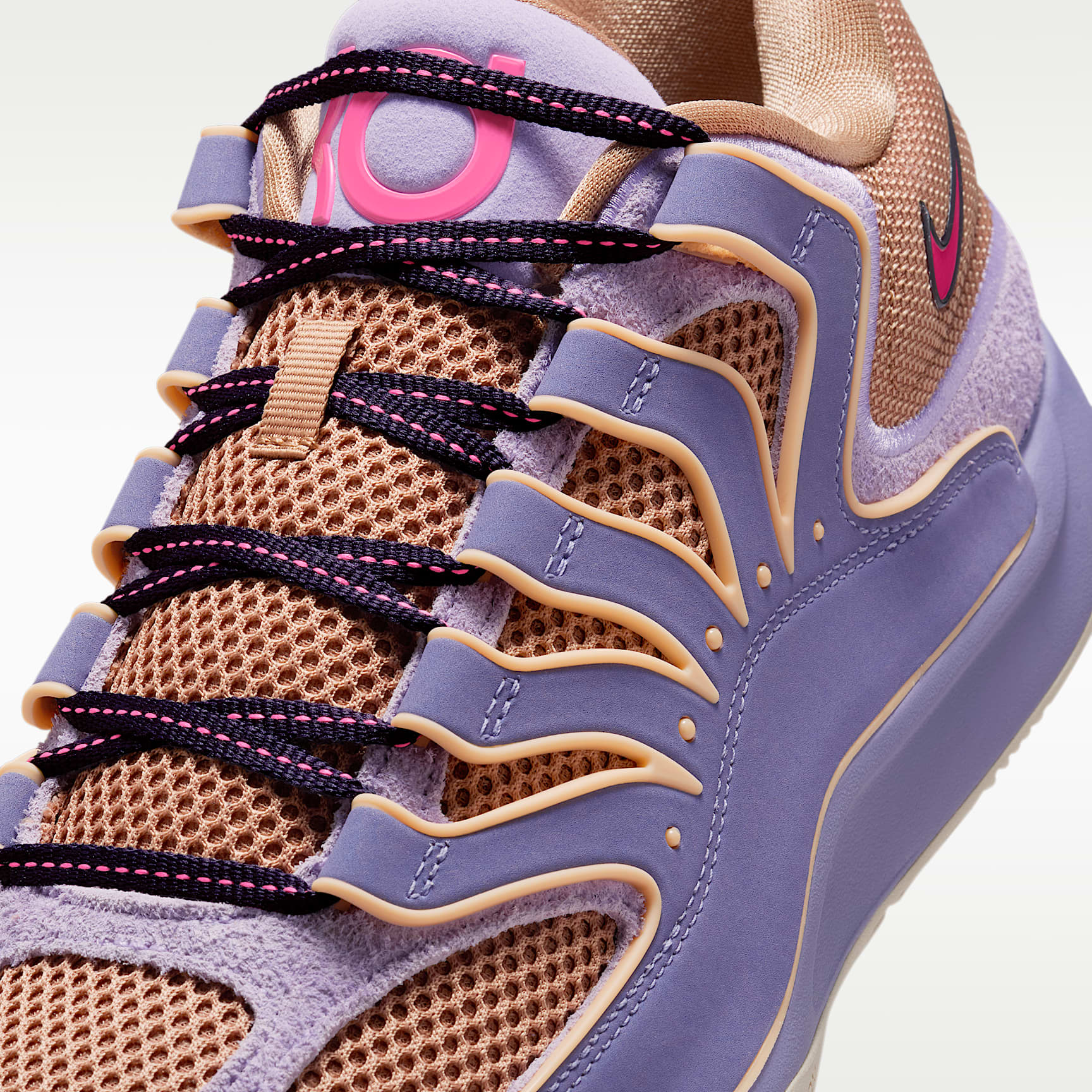 Wanda Durant is the real MVP, but KD is a grandma’s boy too. Barbara A. Davis, KD’s grandma, was the one who told KD his height was a gift, even when his classmates teased him about his prodigious size. Her house was an escape of sorts for the Durant family, a place to laugh, cry, listen and learn from the family matriarch. Barbara’s enduring memory lives on in this special all-purple KD18, an homage to her favorite color. Her initials “B.A.D.” are embroidered on both tongue tops as well. Zoom, Zoom A big forefoot Air Zoom unit offers a different level of velocity when exploding, either on the dead run or out of a standstill position. It offers a different level of snappy pop when the game revs up. Our latest version of Cushlon foam adds a soft, comfortable sensation and freshness that can help you come the 4th quarter. Pop your Steps The bottom layer of the upper has Nike Air cushioning at the heel to add a pop in your step. A strong plastic plate directly underfoot conforms as you flex. It works with the forefoot Air Zoom unit to give you a snappy first step while also providing support and stability. Let it Breathe The upper is made of open holed sandwich mesh, which not only offers a different level of breathability when the action heats up but helped us reduce the weight of the shoe. Stay Contained A tough plastic cage offers customizable firmness on both sides of your foot that molds to your foot. It helps keep you on top of the platform.
