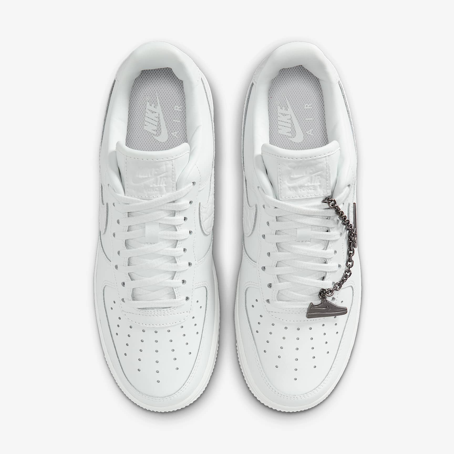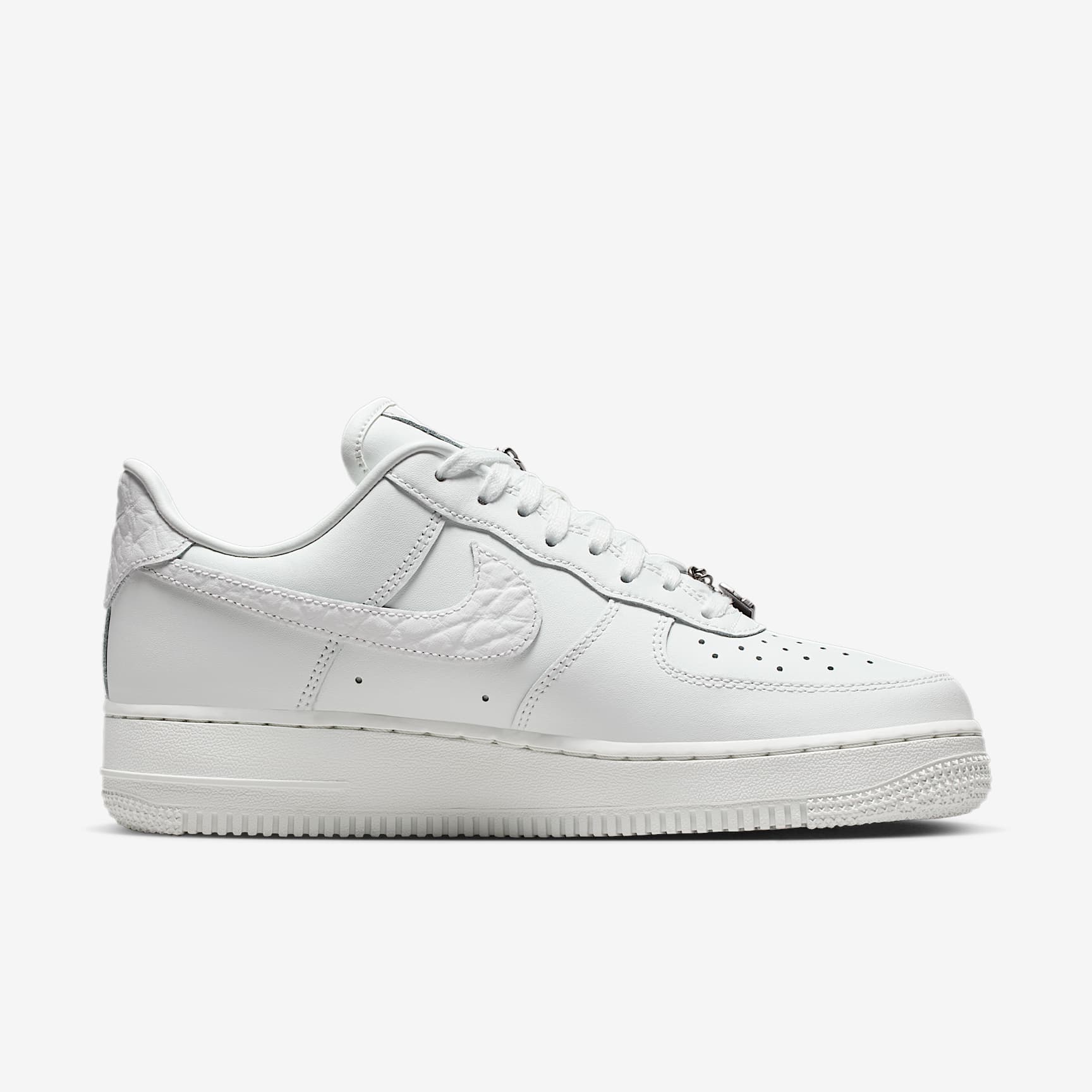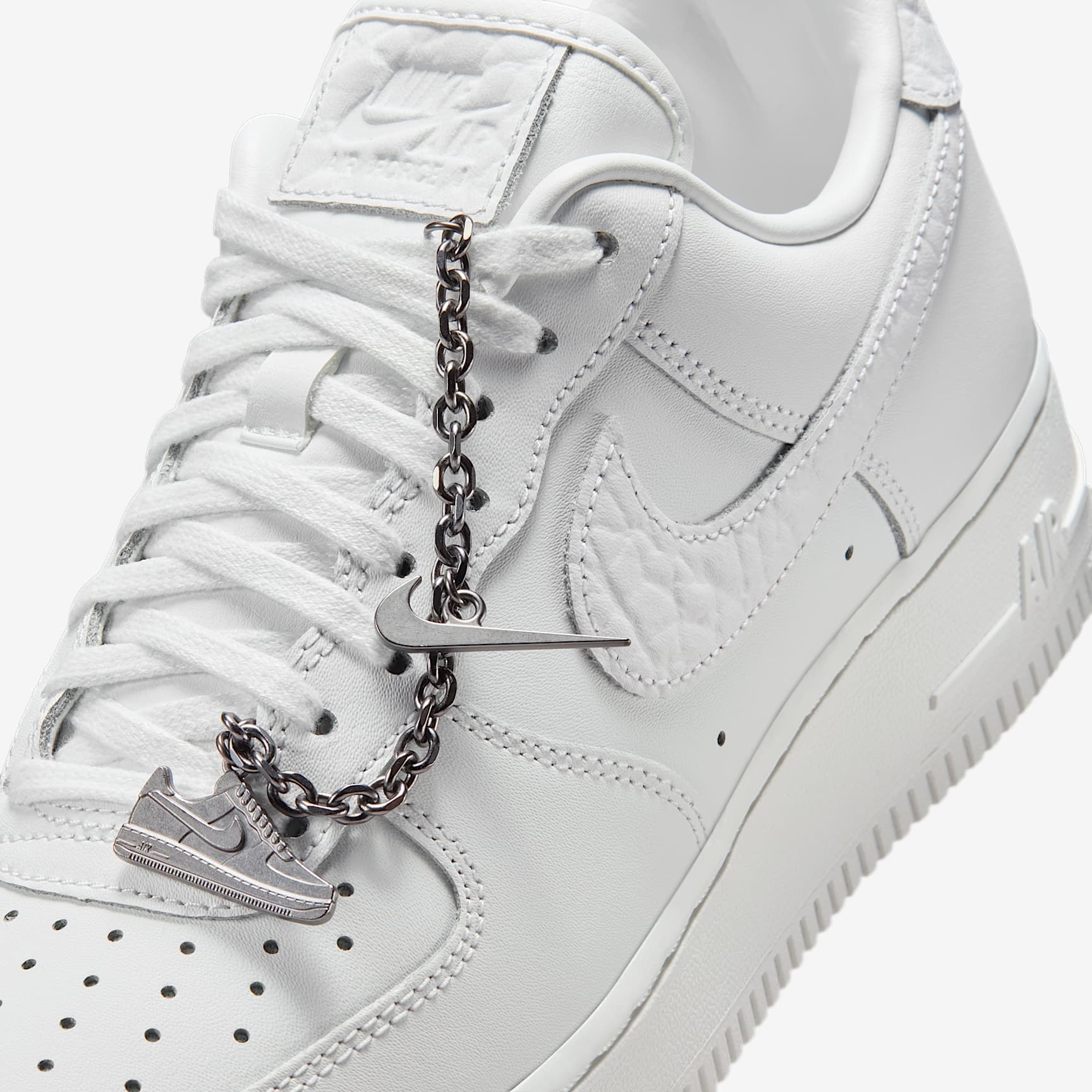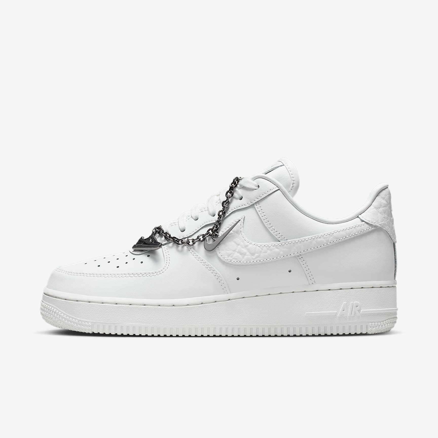 Comfortable, durable and timeless—it's number one for a reason. The Air Force 1 pairs its classic silhouette with premium leather for a crisp, clean look. This version includes a silver chain and charms to elevate your style. Benefits * The leather upper with a perforated toe box is breathable and comfortable. * Nike Air unit provides lightweight cushioning. * Rubber outsole with classic pivot circles delivers traction and durability. Product Details * Low-cut silhouette * Padded collar * Foam midsole