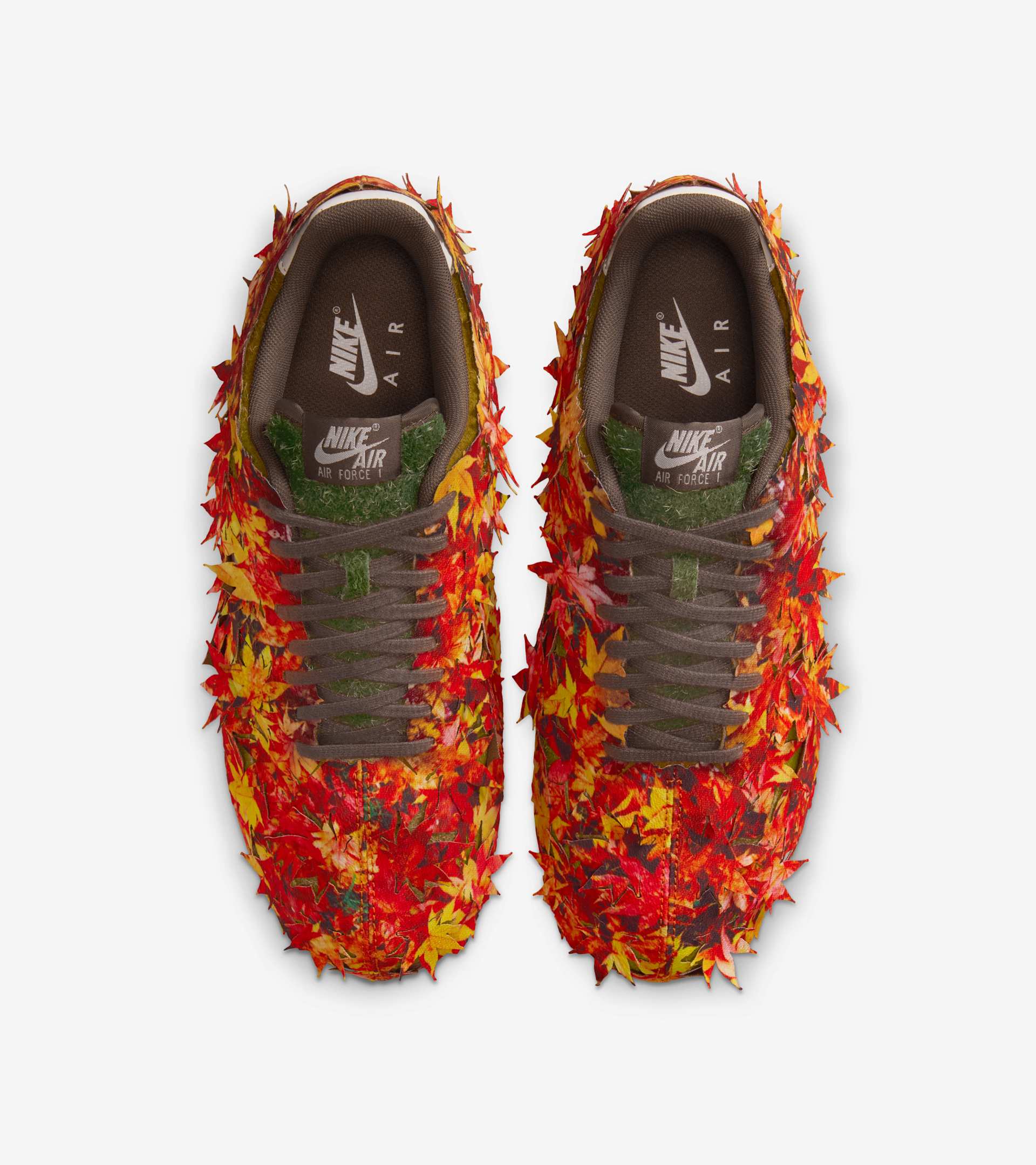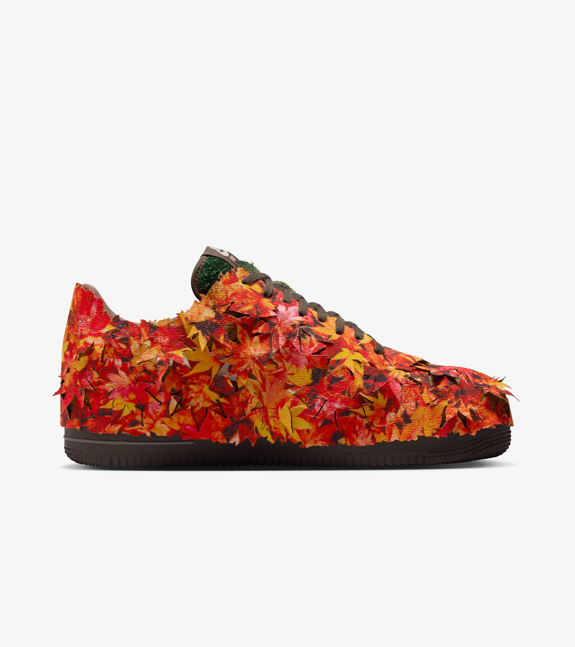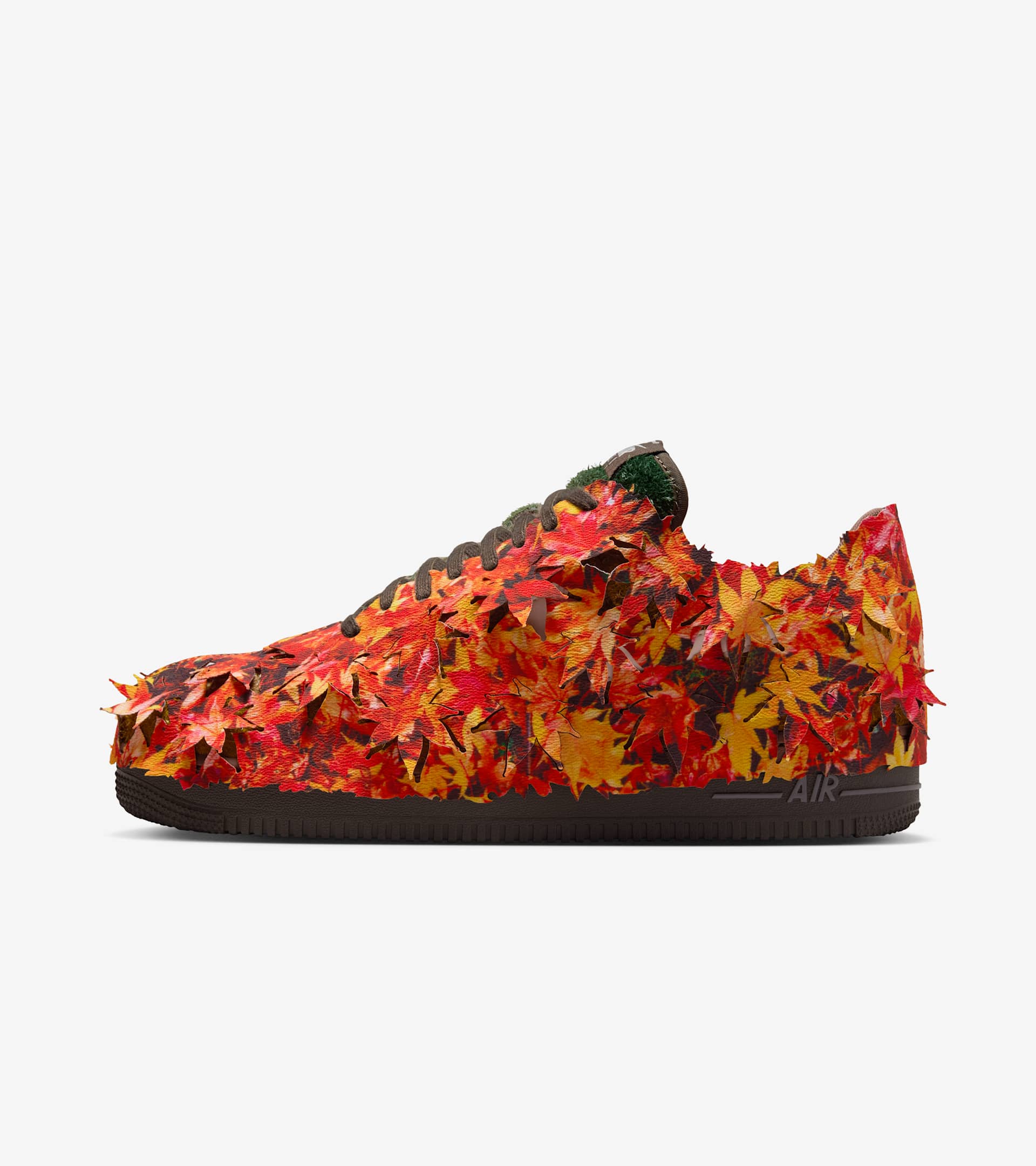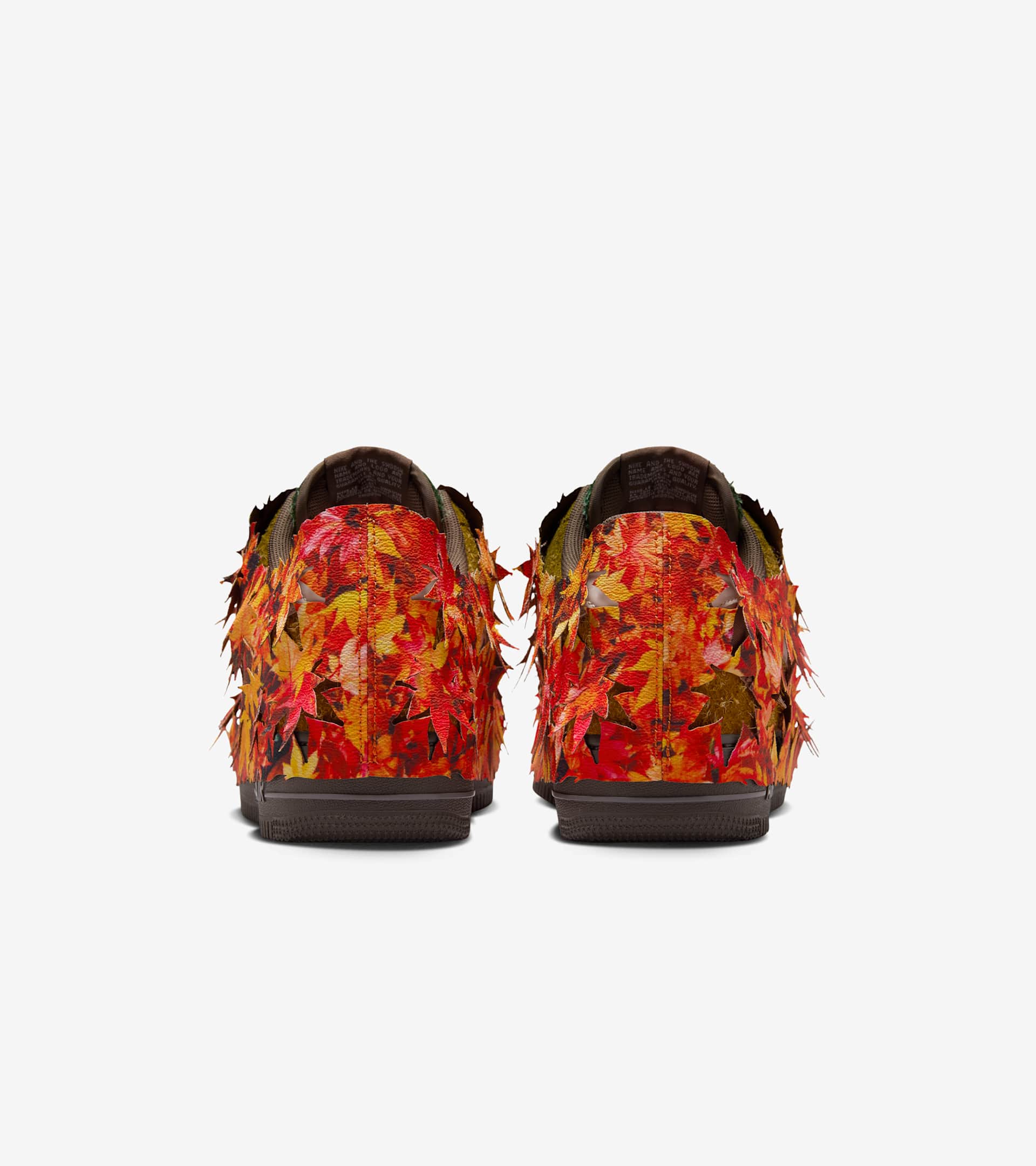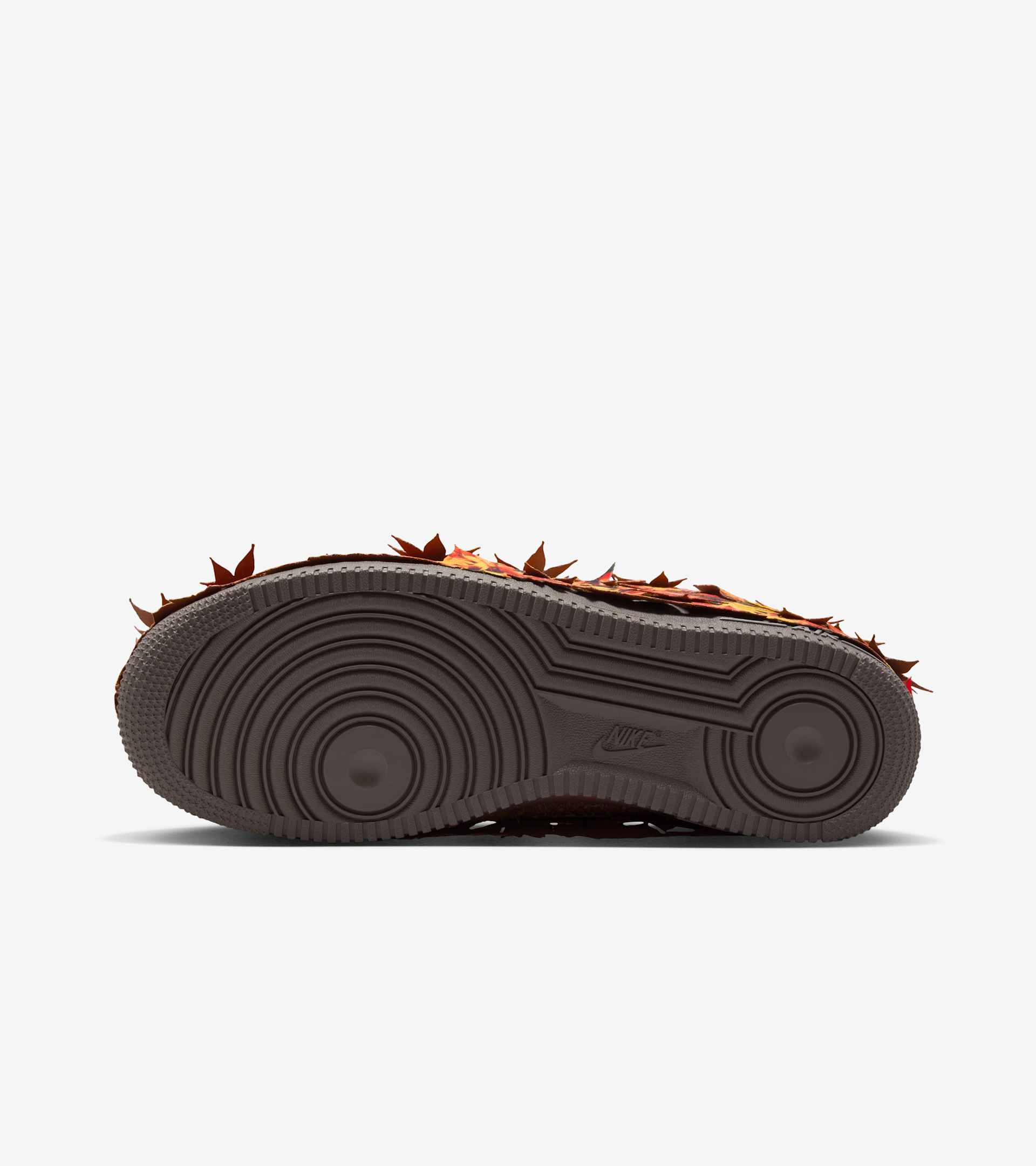 We created this Air Force 1 '07 to celebrate the colours and changes that come when winter approaches. An overlay shroud features the beautiful colours and shapes of maple leaves as they transform and fall. Peaking through the shroud is a suede and synthetic leather upper that channels stone lanterns and moss. What's more quintessential autumn than fallen leaves under your sneakers? Fallen leaves on your sneakers. SKU: IM8062-368