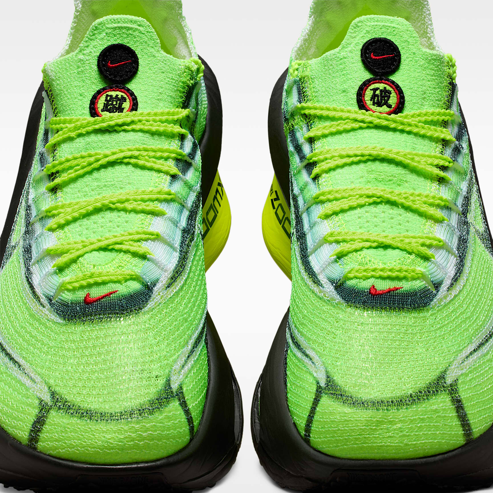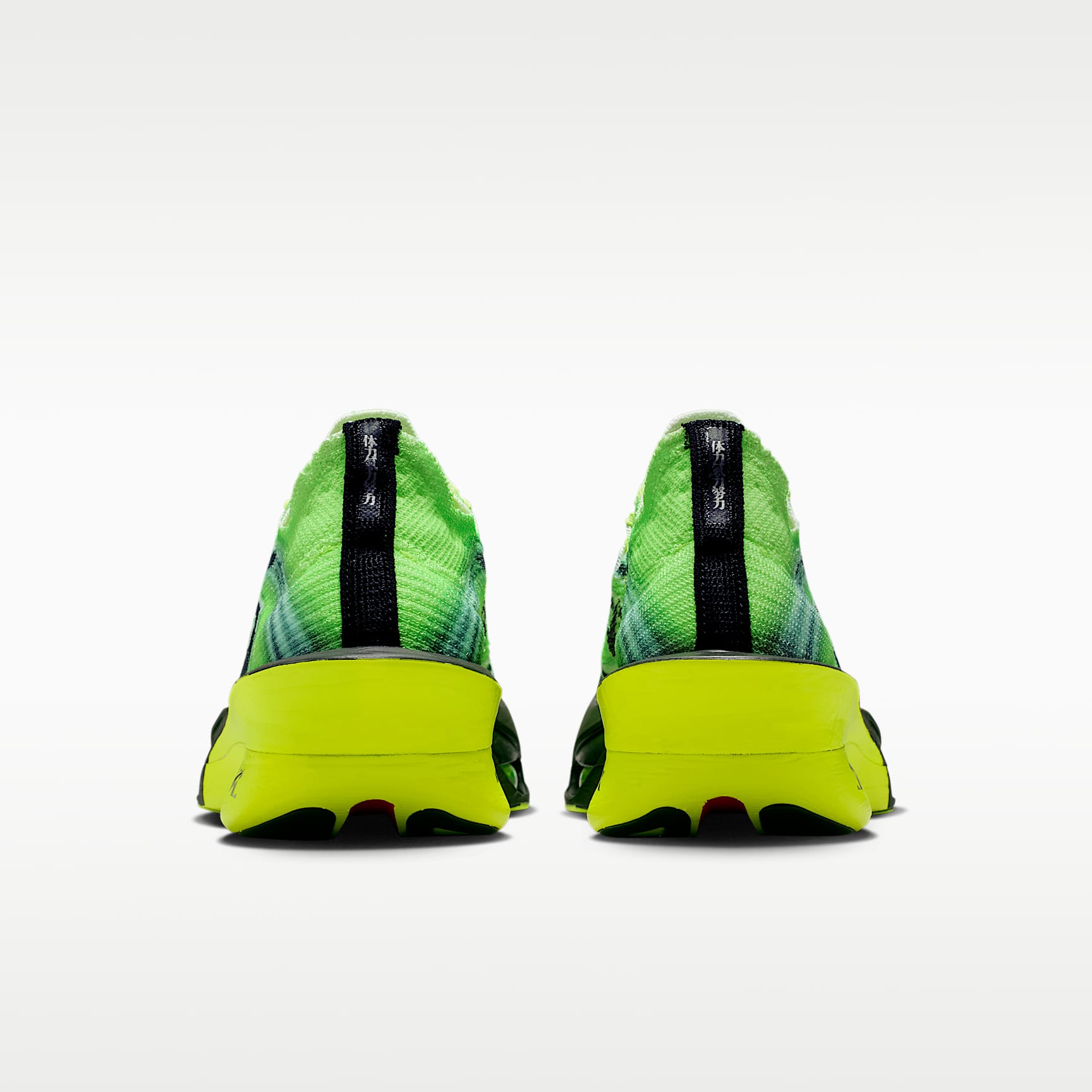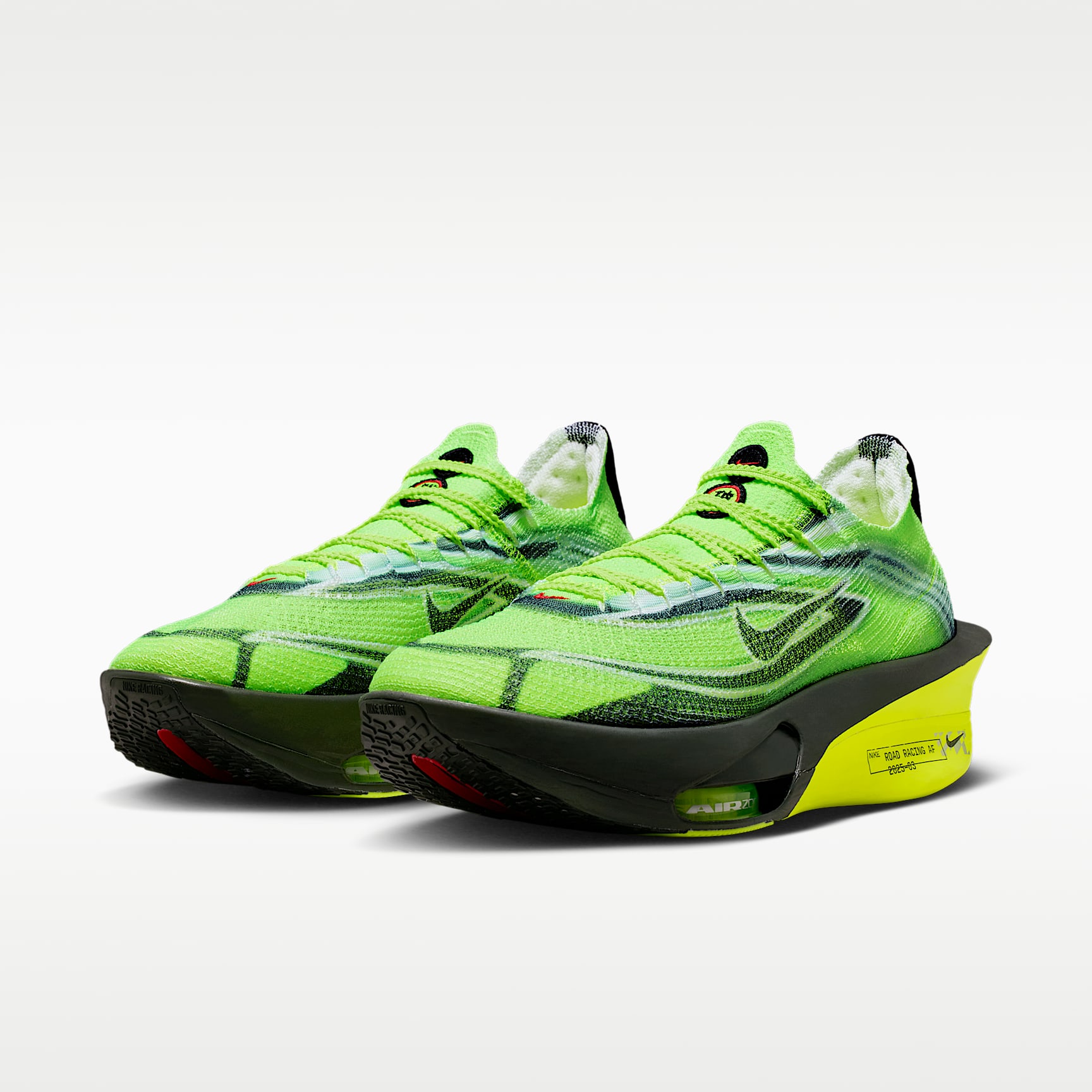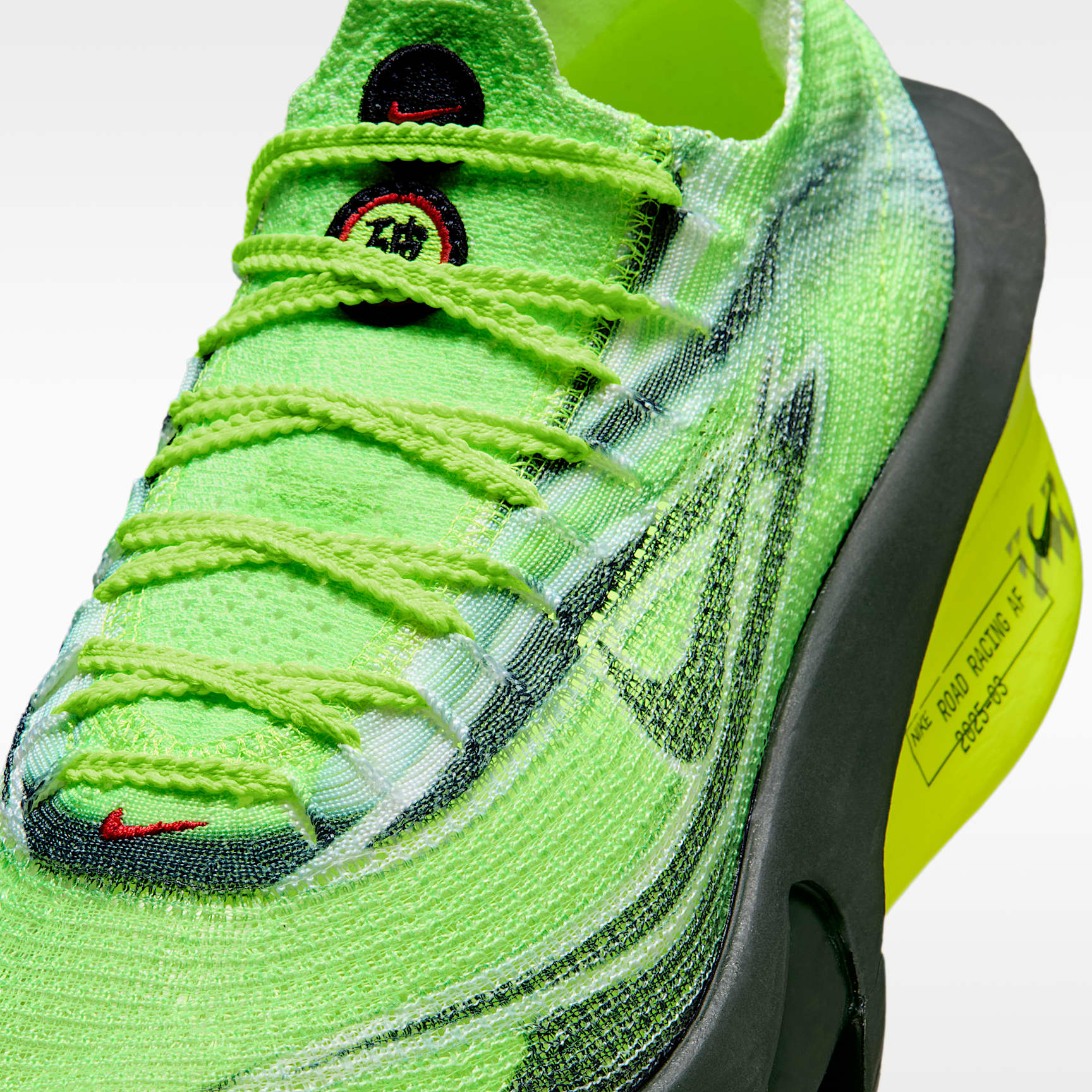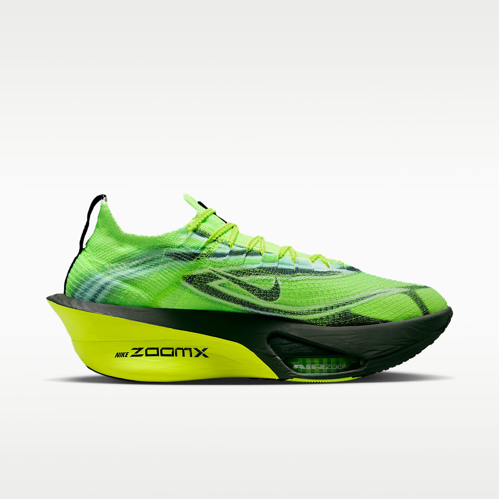 Pinnacle tech creates a propulsive ride fine-tuned for marathon speed. Fine-tuned for marathon speed, the Alphafly 3 helps you push beyond what you thought possible with three innovative technologies. A double dose of Air Zoom units works with a full-length carbon-fibre plate to help launch you into your next step. The ZoomX foam midsole helps keep you fresh from mile 1 to 26.2. Time to leave your old personal records in the dust. Propulsive Air Zoom Units Two Air Zoom units in the forefoot store and return energy back to you, helping power your every step. ZoomX Foam Cushioning The ultralight ZoomX foam midsole is fully connected to the outsole, providing you with a smooth transition and optimised responsiveness throughout your race. Full-length carbon-fibre plate A slightly wider carbon-fibre Flyplate gives you a propulsive and stable feel with each step and turn. What's new? * Lightest Alphafly ever * Wider carbon-fibre plate for increased stability * Improved multidirectional containment and breathability * Fully connected ZoomX foam midsole for smoother transitions * Notched laces offer a secure but soft lace-up. * Integrated knit tongue with lofted padding helps alleviate lace pressure. Product Details * Weight: approx. 218g (men's size 9) * Heel-to-toe drop: 8mm