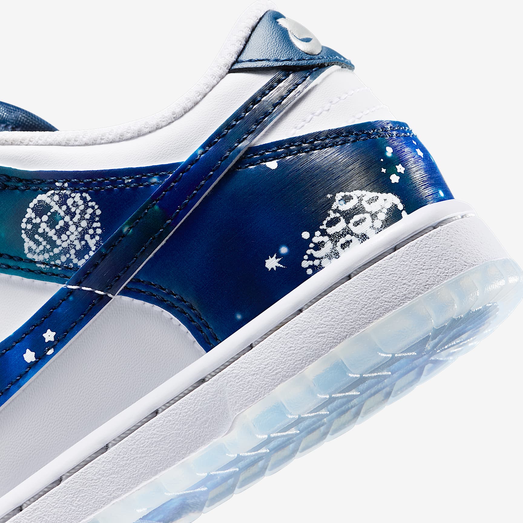 Are these Dunks a window into another universe? Lace 'em up and let your kiddo find out! We hid all our favorite LEGO® shapes within the galaxy-inspired print. Plus, durable synthetic leather up top and plush padding underfoot offer out-of this-world comfort. Benefits * Synthetic leather upper softens and gains vintage character with wear. * Foam underfoot offers lightweight, responsive cushioning. * Rubber outsole with classic pivot circle adds durable traction and heritage style, helping kids take what may be a small step for them, but a giant leap for a LEGO® Minifigure. Product Details * Classic laces * Rubber outsole Nike Dunk Born from a series of mash-ups, hacks and tight deadlines, the Nike Dunk landed on college basketball courts during the '85–'86 season. While the original College Colors designs helped you stay true to your school, the Dunk didn't prove to be popular. But it was this humble sneaker's lack of popularity—and flat, grippy soles—that helped it jump the rails to captivate skateboarders. Decades later, this everyday favorite continues to be snatched up in countless colorways, proving its influence is undeniable.