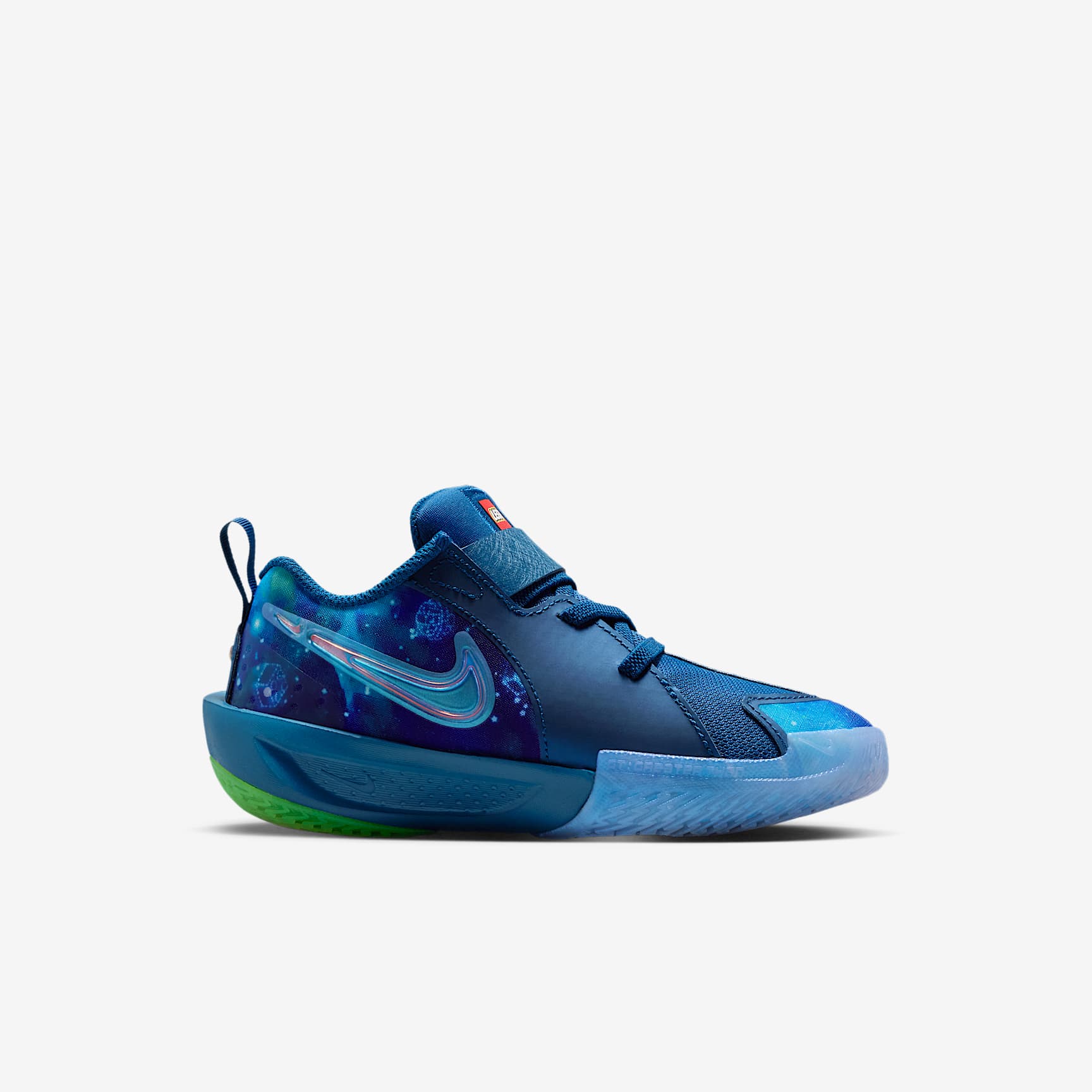 Lace your little one into the Nike x LEGO® Collection and get them cleared for space travel with our high-flying G.T. Cut 3. We hid all our favorite LEGO details in the upper's galaxy-inspired print. Underfoot, advanced traction gives little feet the grip they need to stop on a dime, while light and springy foam cushions their landing after zero-gravity shots. Traction: High The more traction kids have underfoot, the more separation they can create on the court. A herringbone traction pattern helps give little feet the grip they need to step in and out of the action, even when they're running at light speed. Cushioning: Moderate Kiddos who want to blast off into the stratosphere need bouncy cushioning. Springy foam in the midsole helps lessen the impact of little feet hitting the ground for soft yet responsive cushioning. Responsive: Moderate From bricks to buckets, kids need responsive shoes to help them build their next W. Soft foam helps absorb the energy of your little one's step and return it back to them, helping to move them forward. Get Space Ready A wide collar opening and pull tab helps your kiddos get game-ready in a flash. A lateral cable helps provide a secure feel, and an adjustable strap makes it easy for kids to quickly dial in their fit. Product Details * Pull tab on heel * Rubber outsole
