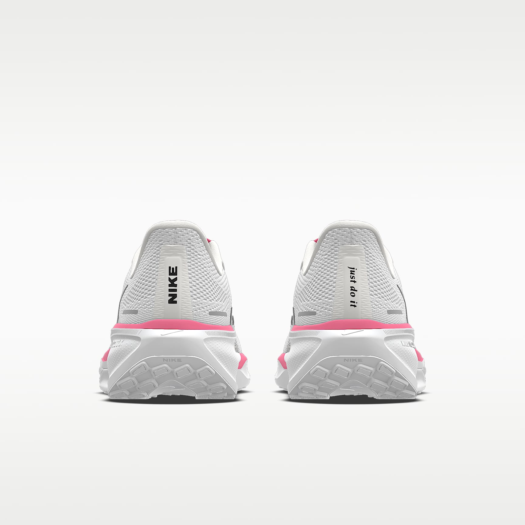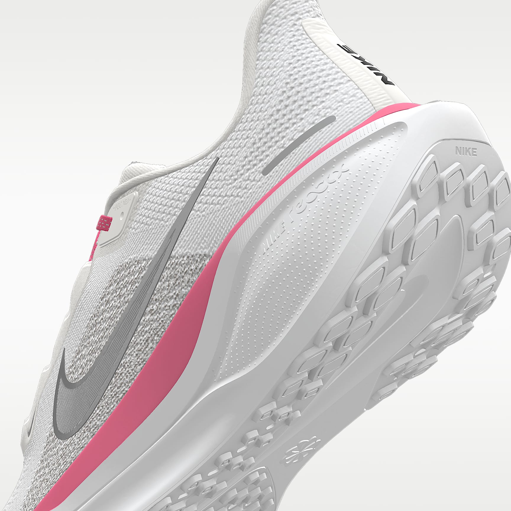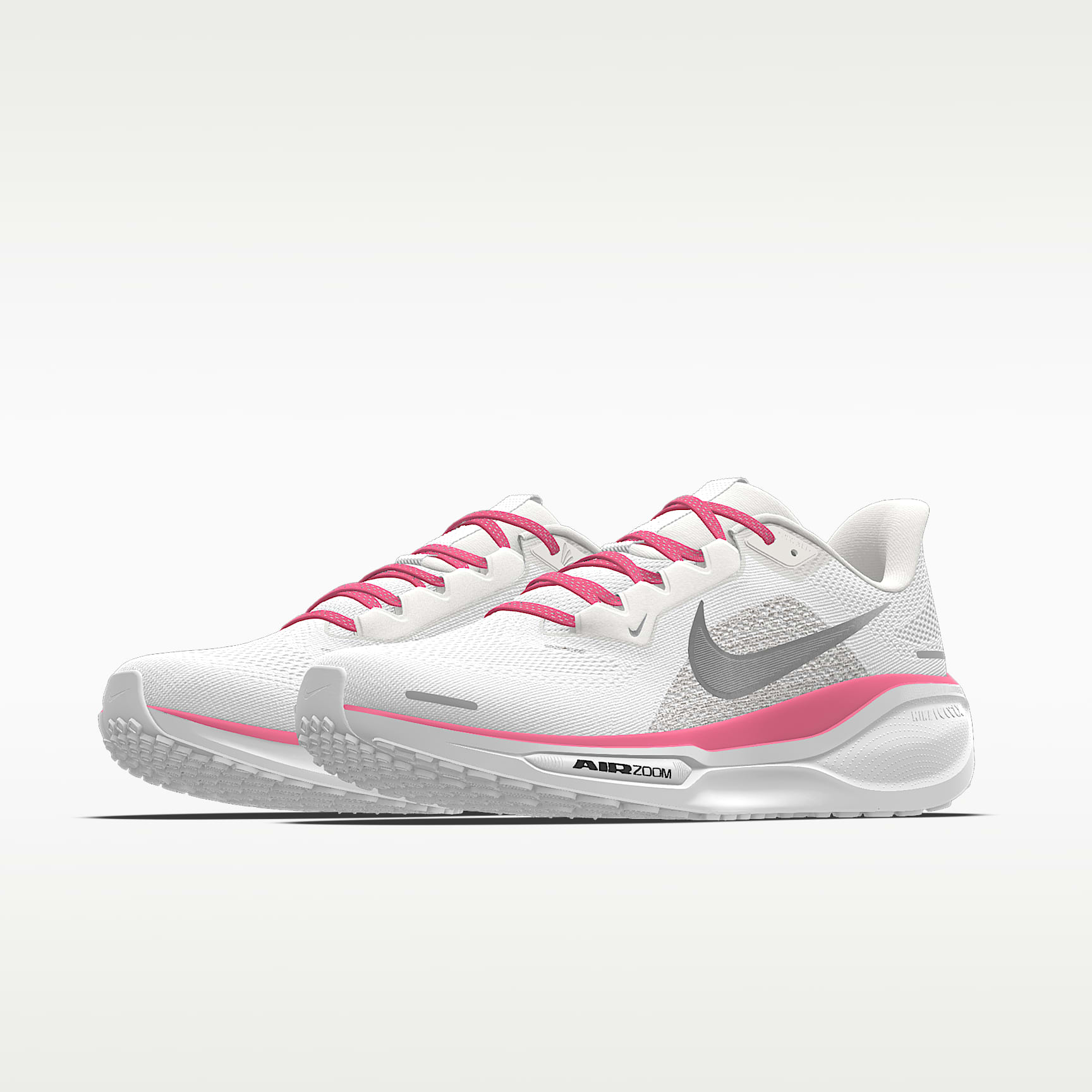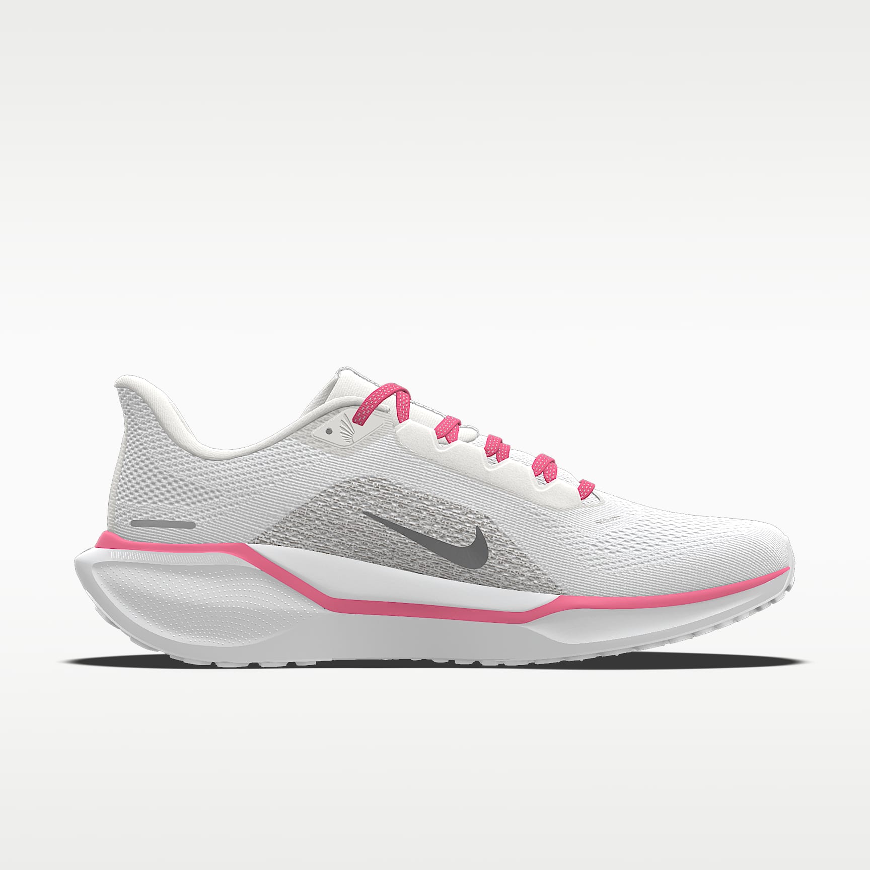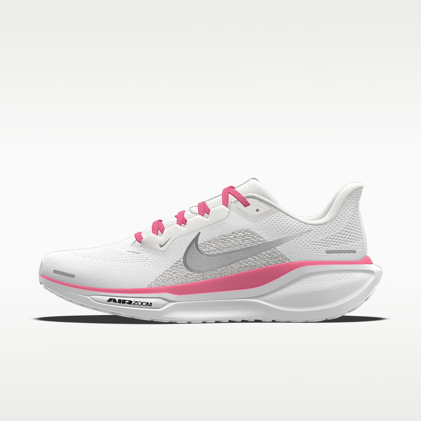 Responsive cushioning in the Pegasus provides an energized ride for everyday road running. Experience lighter-weight energy return with dual Air Zoom units and a ReactX foam midsole. Plus, improved engineered mesh on the upper decreases weight and increases breathability. With bold and bright colors to choose from and a trio of performance alternatives, this shoe is prepared for your special touch. Choose Your Colors Pick from an array of bold colors, or select a “dusk” or “dawn” graphic. Pop the midsole top line with one of many colors in the pallet or go for a fade, complementing the graphics. Change up the tongue to add shimmering energy to your run. And put some flair on our iconic logo by going with metallic gold or reflective silver. Add Performance Details Go with classic or toggle laces, opt for either a standard or “high” arch in the midsole, and pick between a traditional outsole or waffle lugs. Make It Personal Mix and match your personal messages on each heel with a goal, your initials or something meaningful to you. It can be up to 6 characters (letters A-Z, numbers 0-9). Key Features * Upgraded breathable engineered mesh upper * ReactX foam midsole surrounds forefoot and heel Air Zoom units for an energized ride. * Signature waffle-inspired rubber outsole for traction and flexibility * Plush collar tongue and sockliner for a secure and comfortable fit * What's new? All-new ReactX foam midsole is 13% more responsive than previous React technology. * Crafted for performance and planet, ReactX foam is engineered to reduce its carbon footprint by at least 43% in a pair of midsoles due to reduced manufacturing process energy compared to prior React foam. The carbon footprint of ReactX is based on cradle-to-gate assessment reviewed by PRé Sustainability B.V and Intertek China. Other midsole components such as airbags, plates or other foam formulations were not considered. Product Details * Weight: Approx. 251 g/8.8 oz (Women's US 8) * Heel-to-toe drop: 10 mm * MR-10 Last - Our best, most consistent fit (same as Pegasus 40) * Our members are one of a kind, and your shoes are, too. Each pair is proudly made one at a time, by hand. Good things are worth the wait. * Your initials? A nickname? Or something else that's so you. Get personal with a customizable inscription on your shoes. Plus, your name is on the box. * With our 3-D builder, watch your creation come alive as you experiment with all kinds of design choices. * Not intended for use as Personal Protective Equipment (PPE)