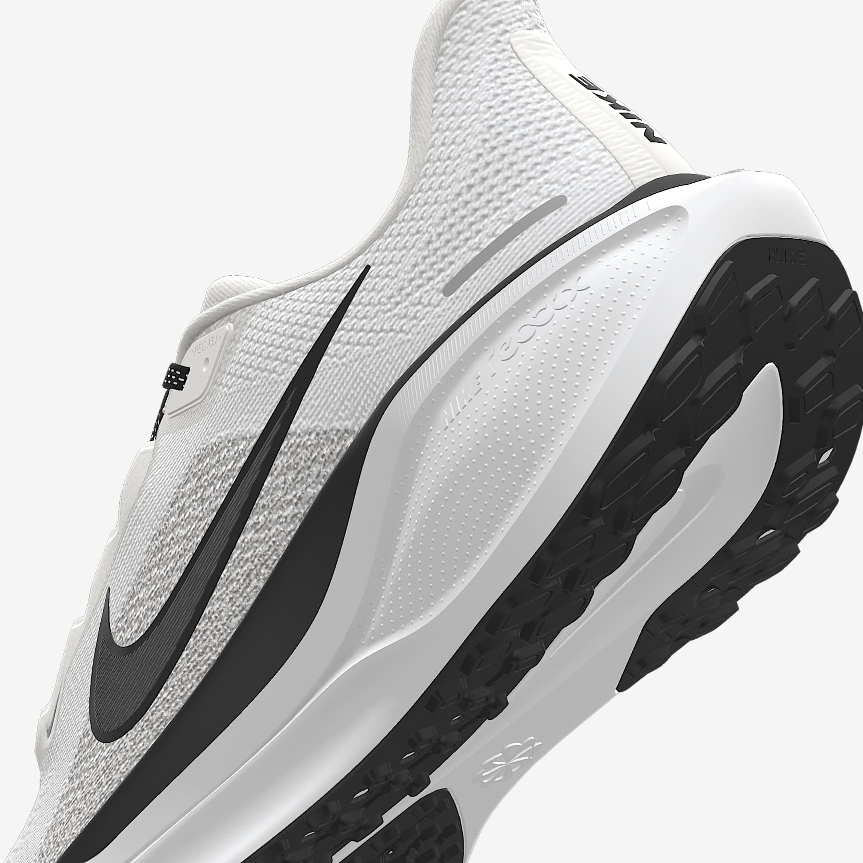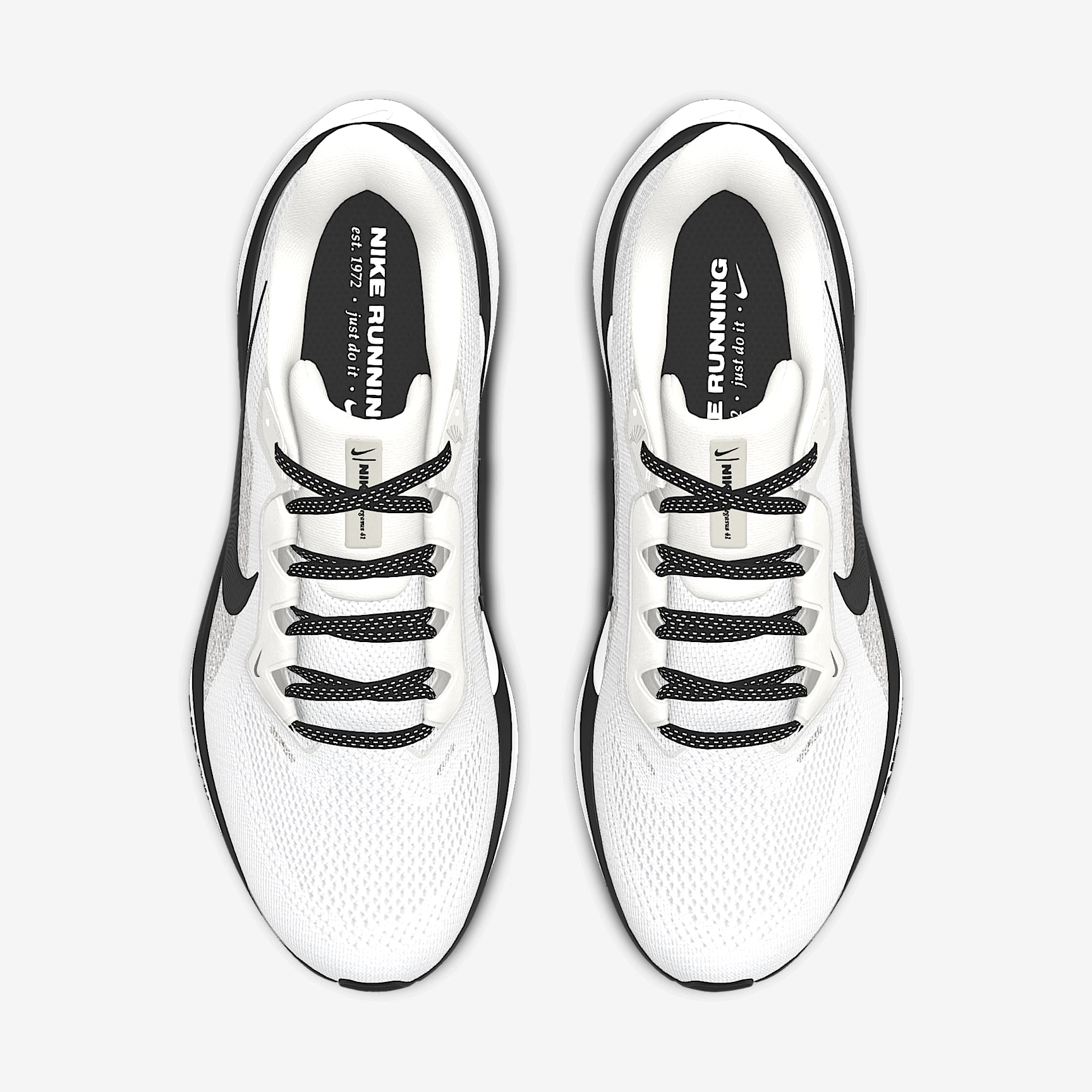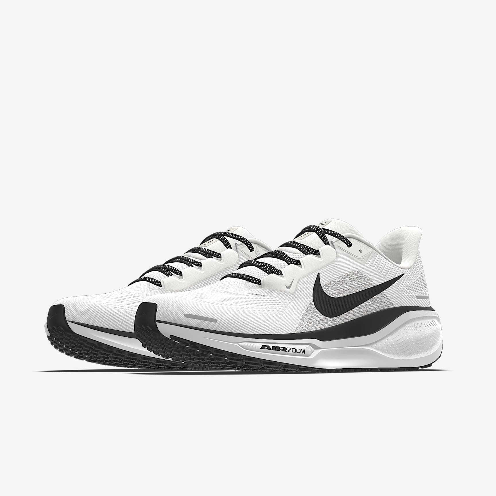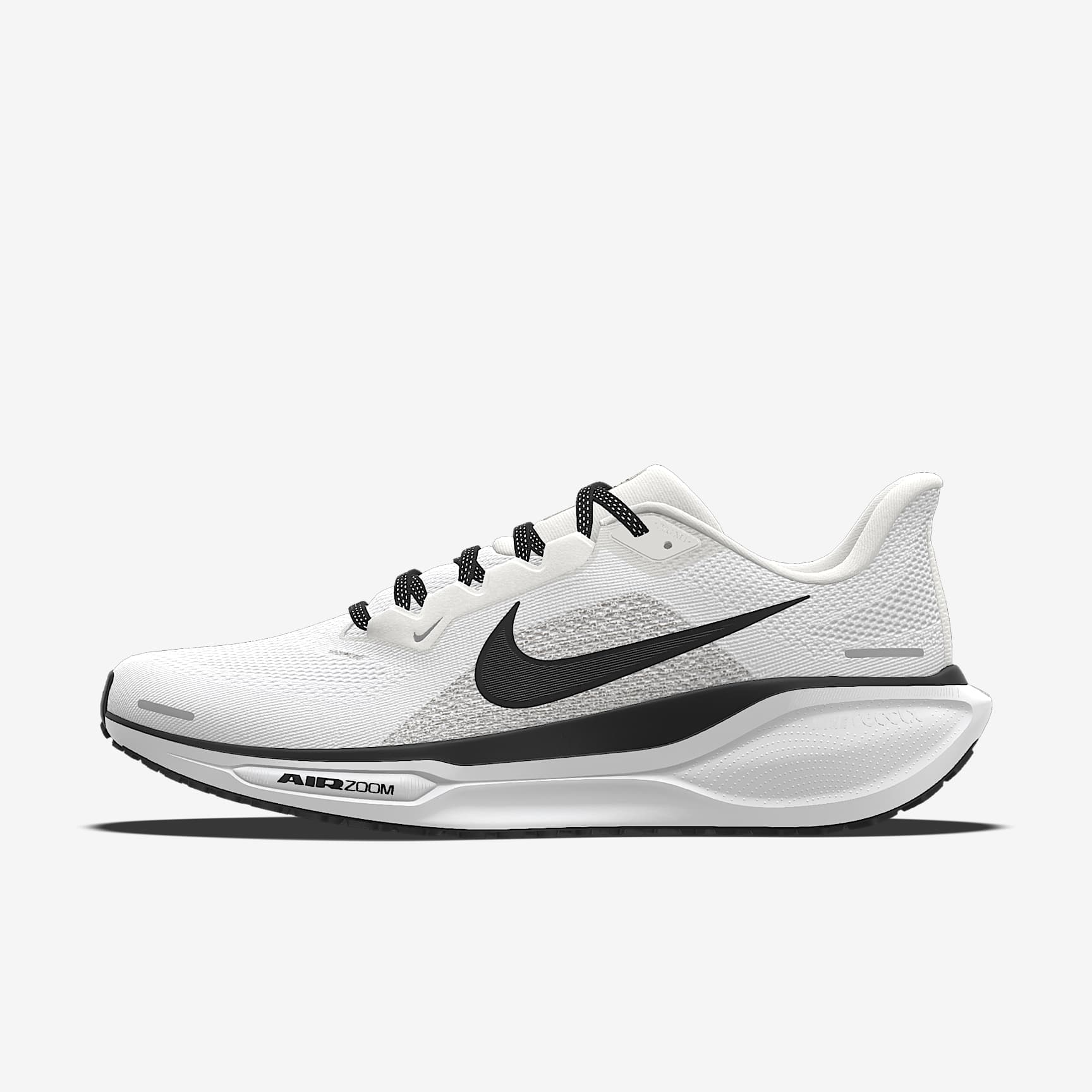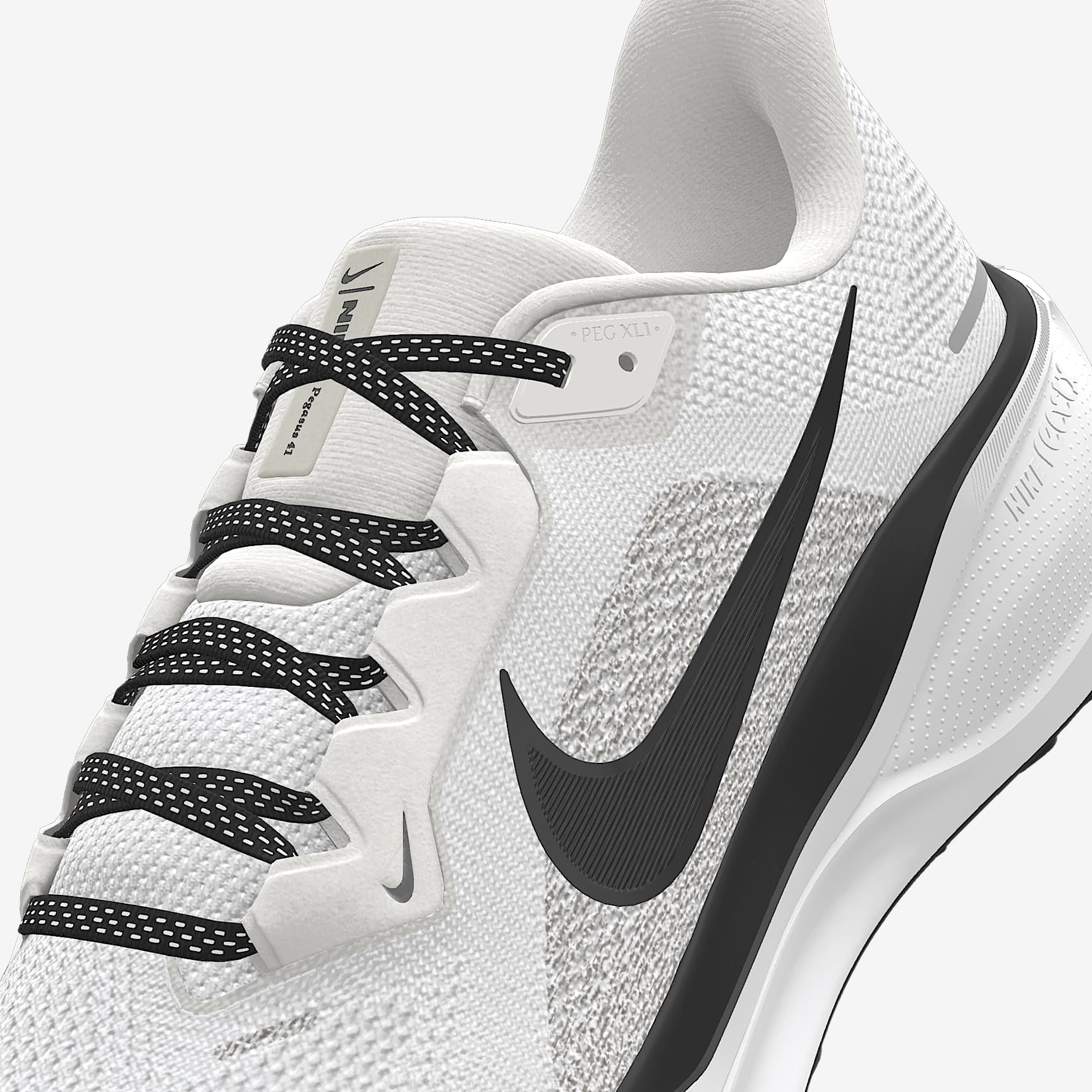 Responsive cushioning in the Pegasus provides an energized ride for everyday road running. Experience lighter-weight energy return with dual Air Zoom units and a ReactX foam midsole. Plus, improved engineered mesh on the upper decreases weight and increases breathability. With bold and bright colors to choose from and a trio of performance alternatives, this shoe is prepared for your special touch. Choose Your Colors Pick from an array of bold colors, or select a “dusk” or “dawn” graphic. Pop the midsole top line with one of many colors in the pallet or go for a fade, complementing the graphics. Change up the tongue to add shimmering energy to your run. And put some flair on our iconic logo by going with metallic gold or reflective silver. Add Performance Details Go with classic or toggle laces, opt for either a standard or “high” arch in the midsole, and pick between a traditional outsole or waffle lugs. Make It Personal Mix and match your personal messages on each heel with a goal, your initials or something meaningful to you. It can be up to 6 characters (letters A-Z, numbers 0-9). Key Features * Upgraded breathable engineered mesh upper * ReactX foam midsole surrounds forefoot and heel Air Zoom units for an energized ride. * Signature waffle-inspired rubber outsole for traction and flexibility * Plush collar tongue and sockliner for a secure and comfortable fit * What's new? All-new ReactX foam midsole is 13% more responsive than previous React technology. * Crafted for performance and planet, ReactX foam is engineered to reduce its carbon footprint by at least 43% in a pair of midsoles due to reduced manufacturing process energy compared to prior React foam. The carbon footprint of ReactX is based on cradle-to-gate assessment reviewed by PRé Sustainability B.V and Intertek China. Other midsole components such as airbags, plates or other foam formulations were not considered. Product Details * Weight: Approx. 297 g/10.4 oz (Men's US 10) * Heel-to-toe drop: 10 mm * MR-10 Last - Our best, most consistent fit (same as Pegasus 40) * Our members are one of a kind, and your shoes are, too. Each pair is proudly made one at a time, by hand. Good things are worth the wait. * Your initials? A nickname? Or something else that's so you. Get personal with a customizable inscription on your shoes. Plus, your name is on the box. * With our 3-D builder, watch your creation come alive as you experiment with all kinds of design choices. * Not intended for use as Personal Protective Equipment (PPE)