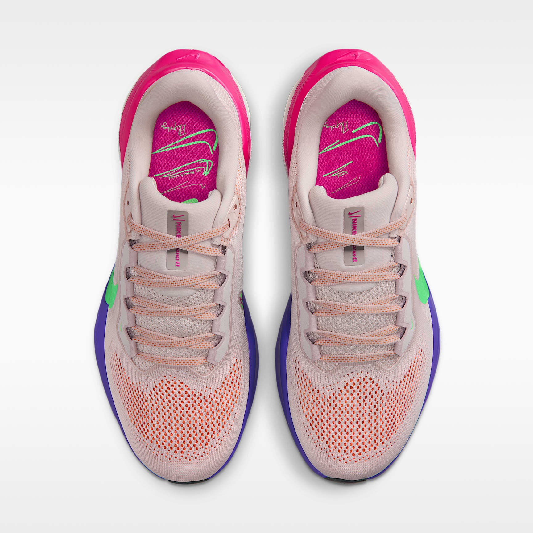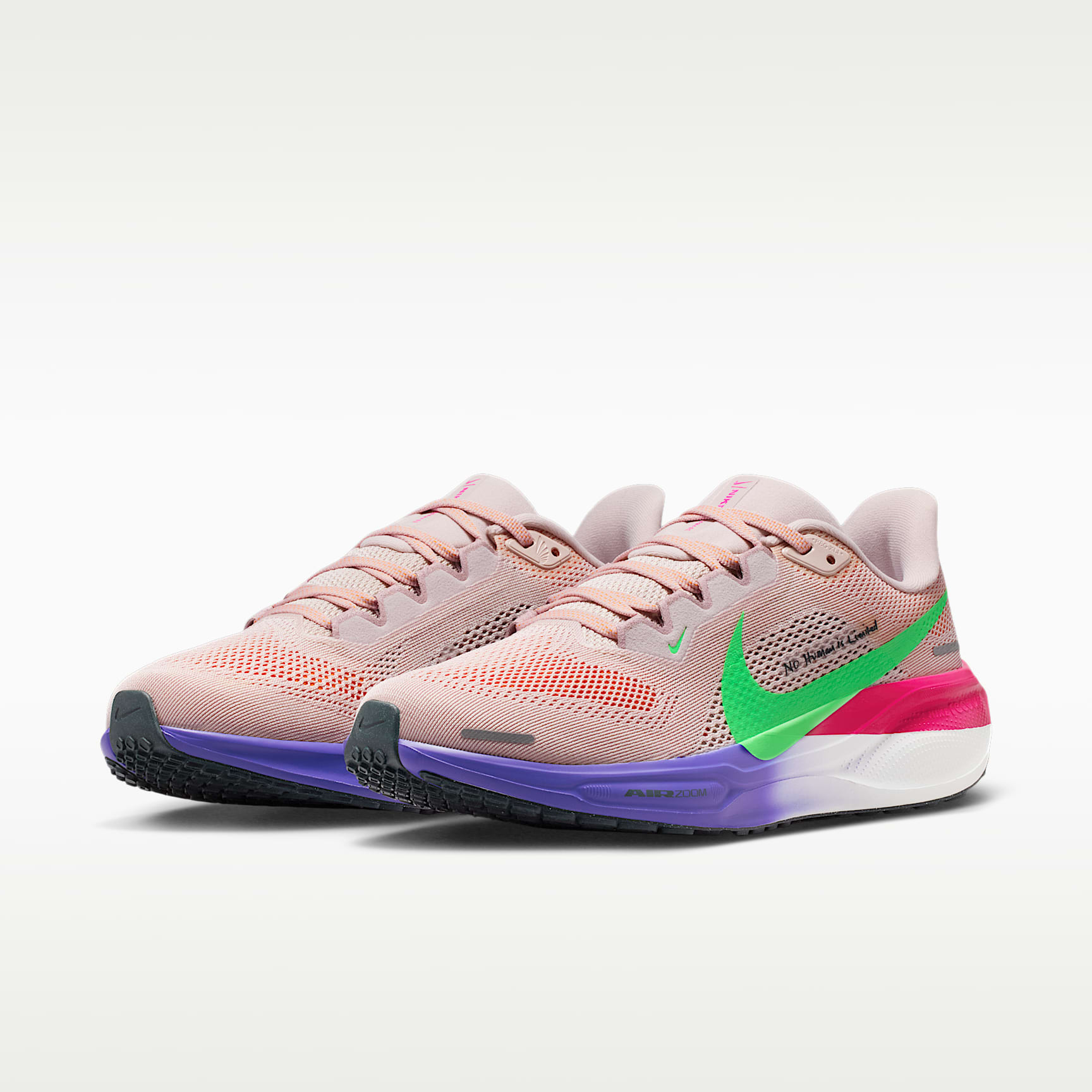 Responsive cushioning meets Air Zoom units for an energized ride. Responsive cushioning in the Pegasus "Eliud Kipchoge" provides an energized ride for everyday road running. Experience lighter-weight energy return with dual Air Zoom units and a ReactX foam midsole. Plus, improved engineered mesh on the upper decreases weight and increases breathability. Behind the Design Eliud Kipchoge says achieving your dream isn't a solo endeavor, so we utilized his community when designing this shoe. His family influenced the color selection and the multi-style Swoosh logo, which represents the strength behind a team. "No human is limited" nods to the endless possibilities you have with a support system. Engineered Mesh Upper Lightweight, breathable mesh on the upper strikes the ideal balance between comfort and containment. ReactX Foam Midsole Two Air Zoom units, at the forefoot and heel, combine with soft, durable ReactX foam for a smooth, responsive ride. Durable Traction Our signature waffle-inspired rubber outsole provides durable traction. Plush Padding Padding on the collar, tongue and sockliner give you a secure and comfortable fit. What's New? * Mesh upper is lighter and more breathable * ReactX foam midsole is 13% more responsive than previous React technology * Wider forefoot and heel * Increased stack heights at the forefoot and heel Product Details * Weight: Approx. 251 g/8.8 oz (Women's US 8) * Heel-to-toe drop: 10 mm * MR-10 Last - Our best, most consistent fit (same as Pegasus 40) * Reflective details * Not intended for use as Personal Protective Equipment (PPE)