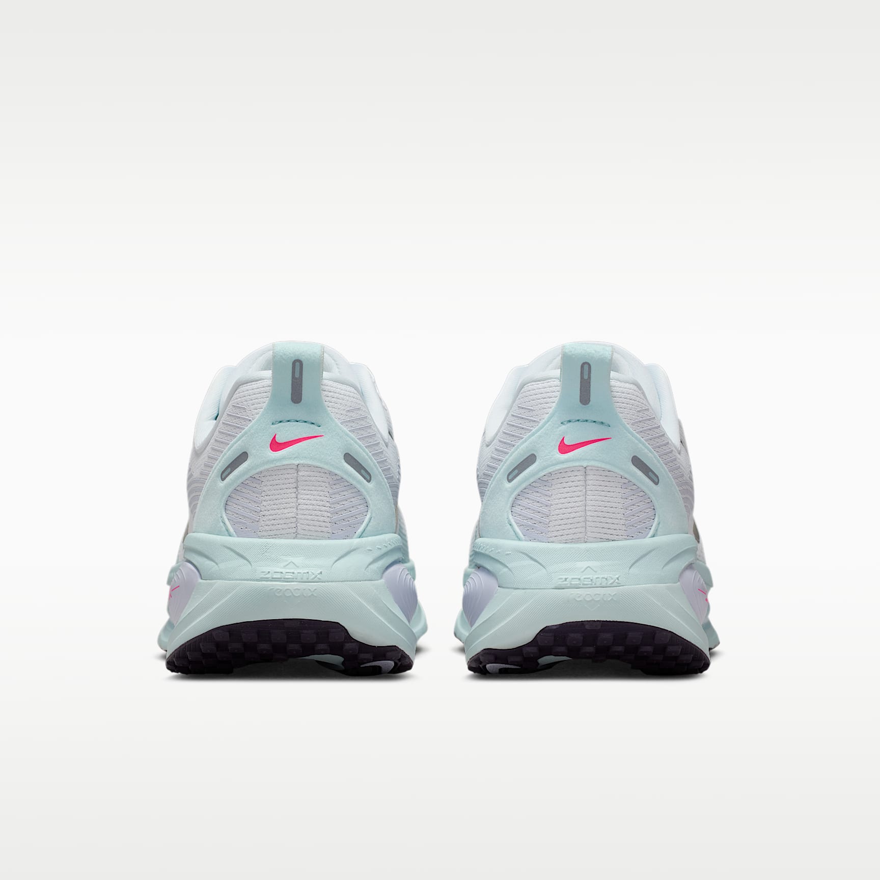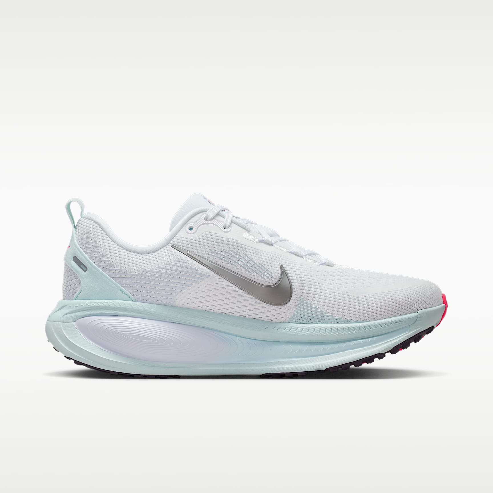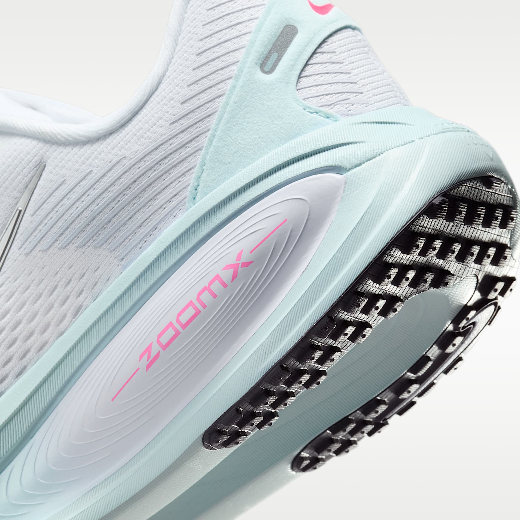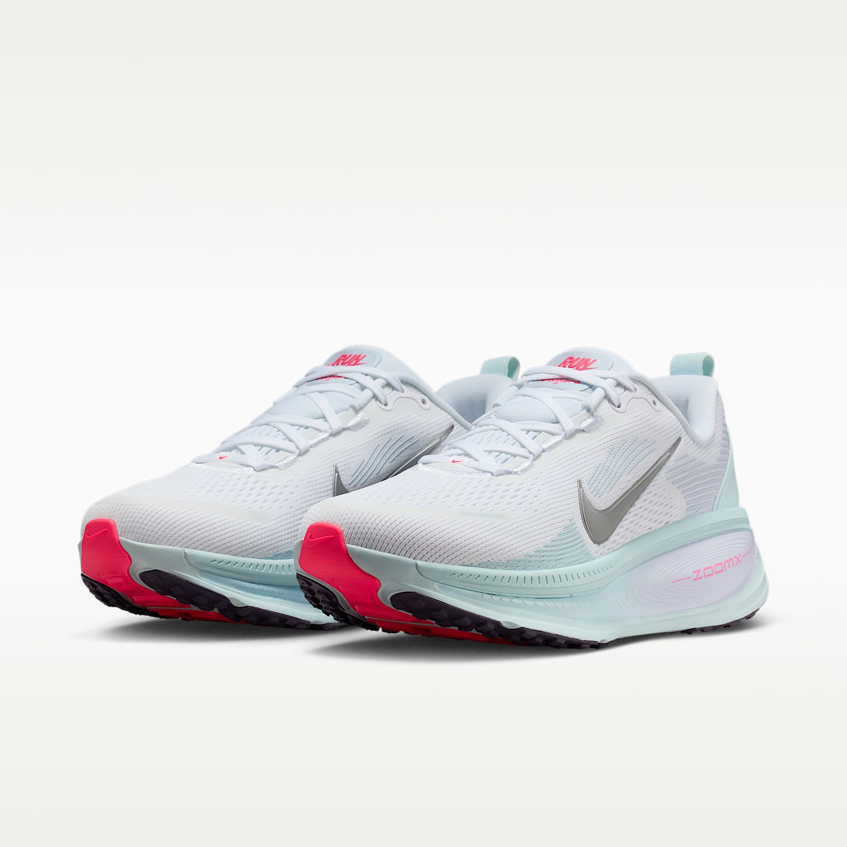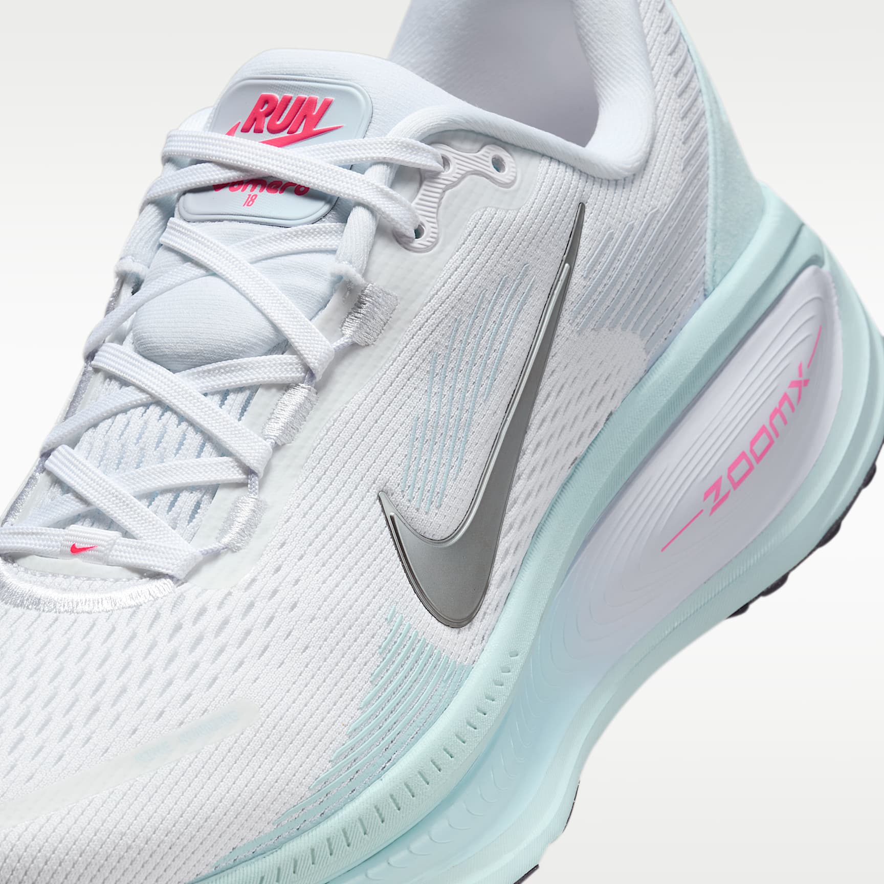 Double-stacked max cushioning for a soft and comfortable ride. Maximum cushioning in the Vomero provides a comfortable ride for everyday runs. Our softest, most cushioned ride has lightweight ZoomX foam stacked on top of responsive ReactX foam in the midsole. A redesigned traction pattern underfoot offers a smooth heel-to-toe transition. Engineered mesh upper The upper is made from engineered mesh for soft breathability. Dual-density midsole Our dual-density midsole has ZoomX foam stacked on top of ReactX foam, which is 13% more responsive than previous React technology, for a comfortable ride. Pods around the outsole We placed pods around the outsole to help enhance agility and provide smoother heel-to-toe transitions. Plush padding A plush tongue and lining give you a comfortably snug feel. What's new? * ZoomX foam stacked on top of ReactX foam * Higher stack height compared to Vomero 17 * Plush foam collar * Increased rocker Product Details * Weight: approx. 262g (women's size 5.5) * Heel-to-toe drop: 10mm * Reflective design details * Not intended for use as personal protective equipment (PPE)