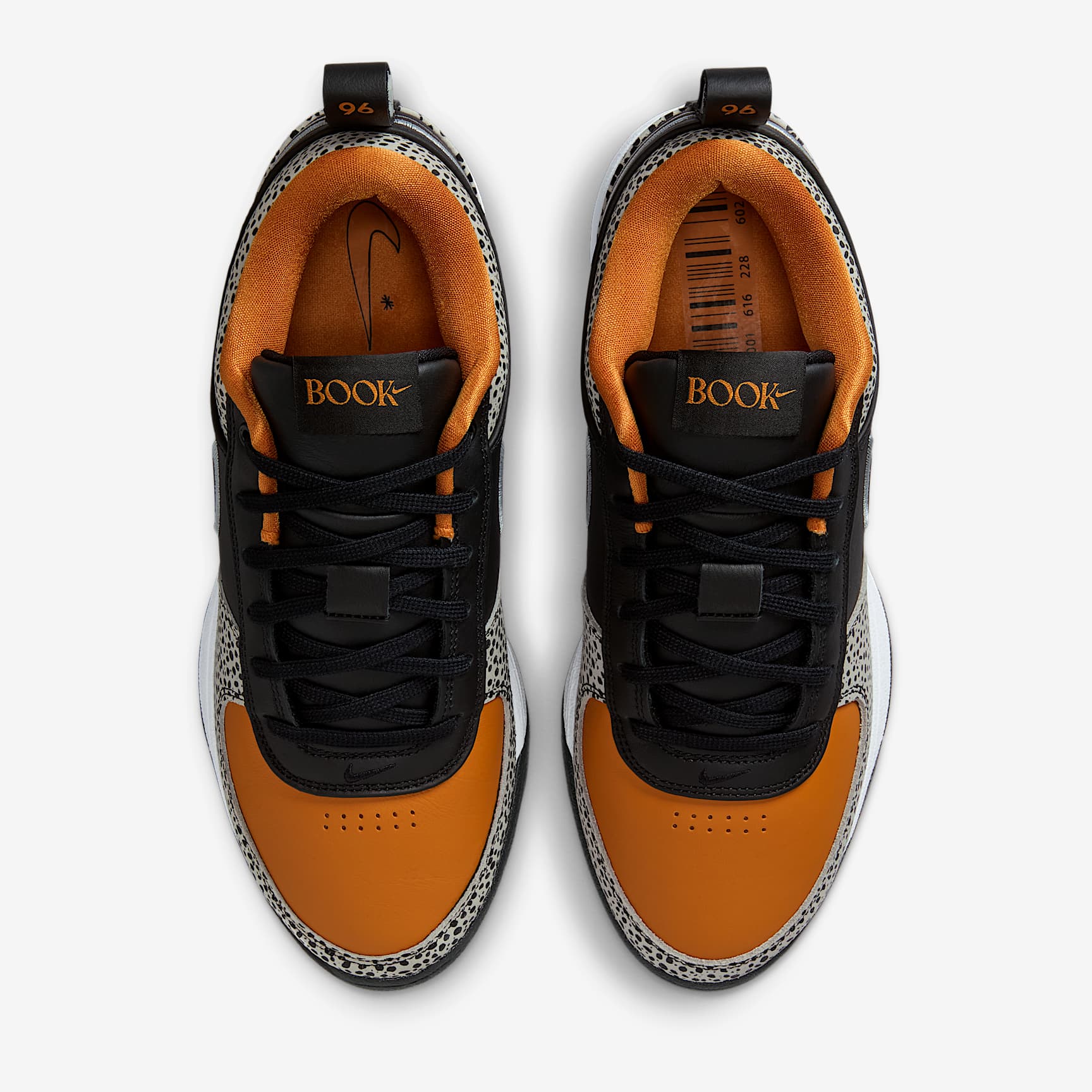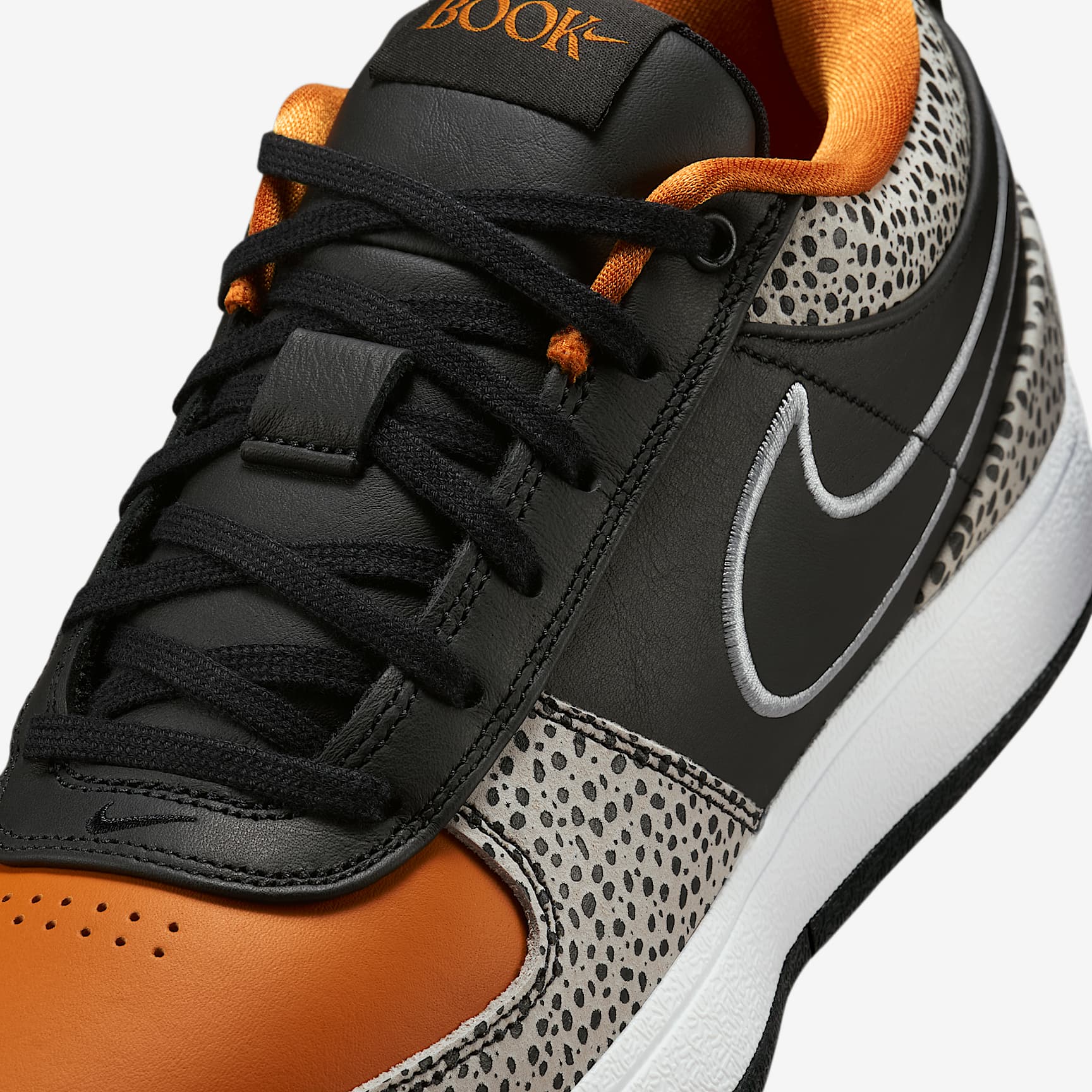 How’s the saying go? A leopard never changes its spots? Book is calm, cool and collected as they come. But every now and then, he’s gotta let them know. This Book 1 is an untamed take on a Nike masterpiece, drawing its inspiration from the Air Safari that took over the sneaker world in the '80s. Cult classic, meet future classic. Book Smooth The outside is pure Book, with a workwear-inspired upper that adds durability, while genuine leather across the forefoot provides more reinforcement and a familiar, plush, broken-in feel out of the box. The pull tab at the heel is inspired by a book spine, with numbers referencing chapters in an ongoing story. Stop and Go A top-loaded Air Zoom unit in the heel provides a measure of responsive speed when taking off in the open floor and coming to sudden halts, like a two-foot Book jump stop and pump fake around the rim. Plant and Pivot A top-loaded midfoot strong plastic plate helps keep your foot stable when making sudden movements like sharp plants, Book-like pivots and jabs in the post. A strong plastic sidewall cage adds even more stability. Cut Hard The multidirectional, herringbone-like pattern gives you sticky traction that’s ideal for lateral cuts and quick changes in movement. Full-Go Foam Soft, responsive full-length foam can help you keep running and cutting in comfort.