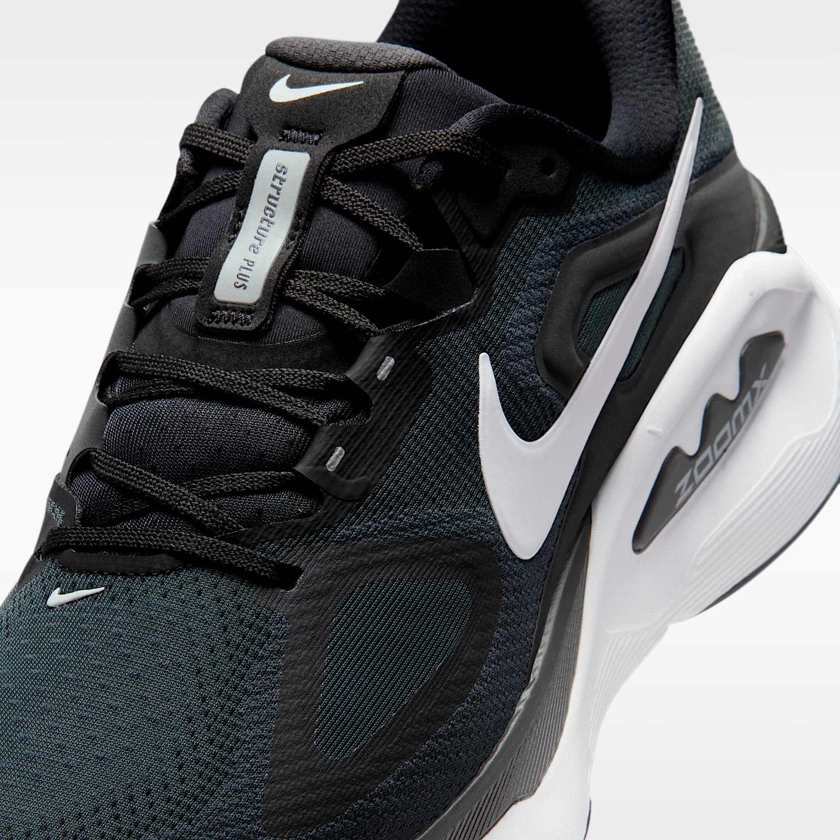 Double-stacked foam creates our most cushioned stability shoe yet. Take supportive cushioning to the next level in the Structure Plus. We stacked responsive ZoomX foam on top of ReactX foam for a smooth, yet secure, ride. Plus, our midfoot support system provides a stable transition from heel to toe. Dialled-Up Cushioning We combined premium ZoomX foam with sturdy ReactX foam to give you an ultra-comfortable, ultra-responsive feel. Trusted Stability Our midfoot support system helps stabilise your foot and securely guide it through heel-to-toe transitions. Dual-Rubber Outsole Soft rubber in the forefoot gives you flexibility while stiff, high-abrasion rubber in the heel offers enhanced durability. Secure Mesh Upper Engineered mesh upper with a secure midfoot band gives you a contained feeling with optimal breathability. Product Details * Heel-to-toe drop: 10mm * Weight: approx. 309g (men's UK 9) * Reflective design details * Not intended for use as Personal Protective Equipment (PPE)
