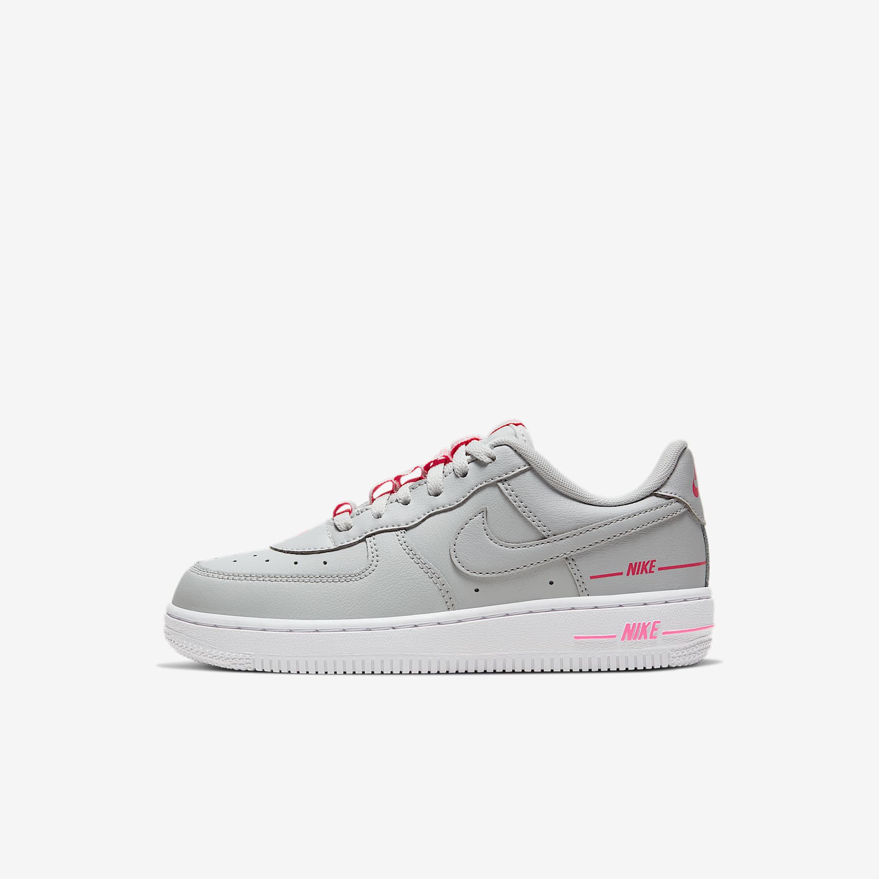 A LEGEND LIVES ON. Do a double-take and double the fun with the Nike Force 1 LV8 3. Repeated "NIKE" logos on the heel bring a new look while still keeping the classic feel of the '82 original remade for kids. Lasting Durability Real and synthetic leather are durable and bring that classic AF-1 feel. Classic AF-1 Cupsole construction for heritage AF-1 style. Trusted Traction Rubber on the sole gives you durable traction. Product Details * Classic laces * Perforations on the toe Air Force 1 Debuting in 1982 as a basketball must-have, the Air Force 1 came into its own in the '90s. The clean look of the classic white-on-white AF-1 was endorsed from the basketball courts to the street and beyond. Finding its rhythm in hip-hop culture, releasing limited collabs and colourways, Air Force 1 became an iconic sneaker around the globe. And with over 2,000 iterations of this staple, its impact on fashion, music and sneaker culture can't be denied.