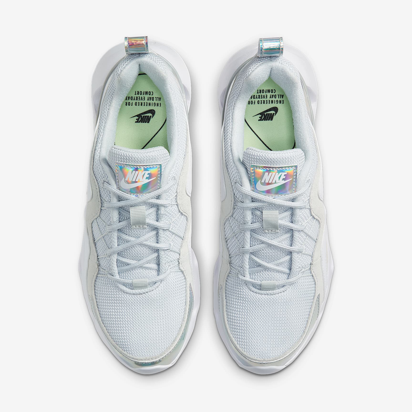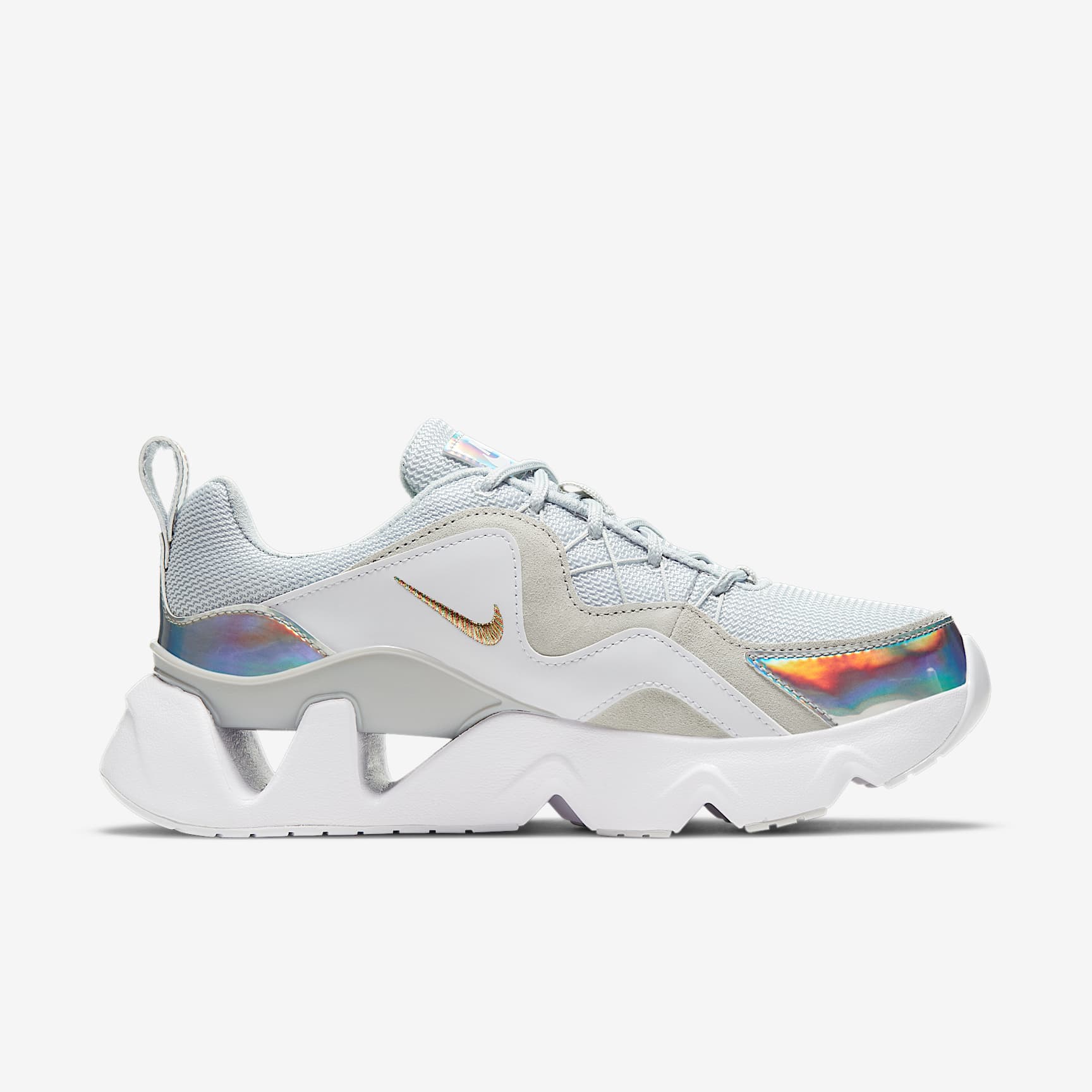LIFTED IN IRIDESCENCE. The Nike RYZ 365 is a colorful, shiny take on the classic chunky, mid-'90s sneaker. Bold lines in the upper complement flashes of iridescence inspired by CDs of our past for eye-catching shine. The geometric shapes in the midsole draw in the eye and help provide a cushioned footfall. Let your carefree expression match your powerful force. Benefits * Suede and synthetic leather in the upper are durable and easy to keep looking clean. * The use of shapes lets you see through the midsole. * A plastic plate connects to the midsole, playing off the look of mechanical cushioning. * Rubber on the outsole provides traction and durability. * Laces feed through Flywire cables to help secure a snug fit. Product Details * Heel pull tab