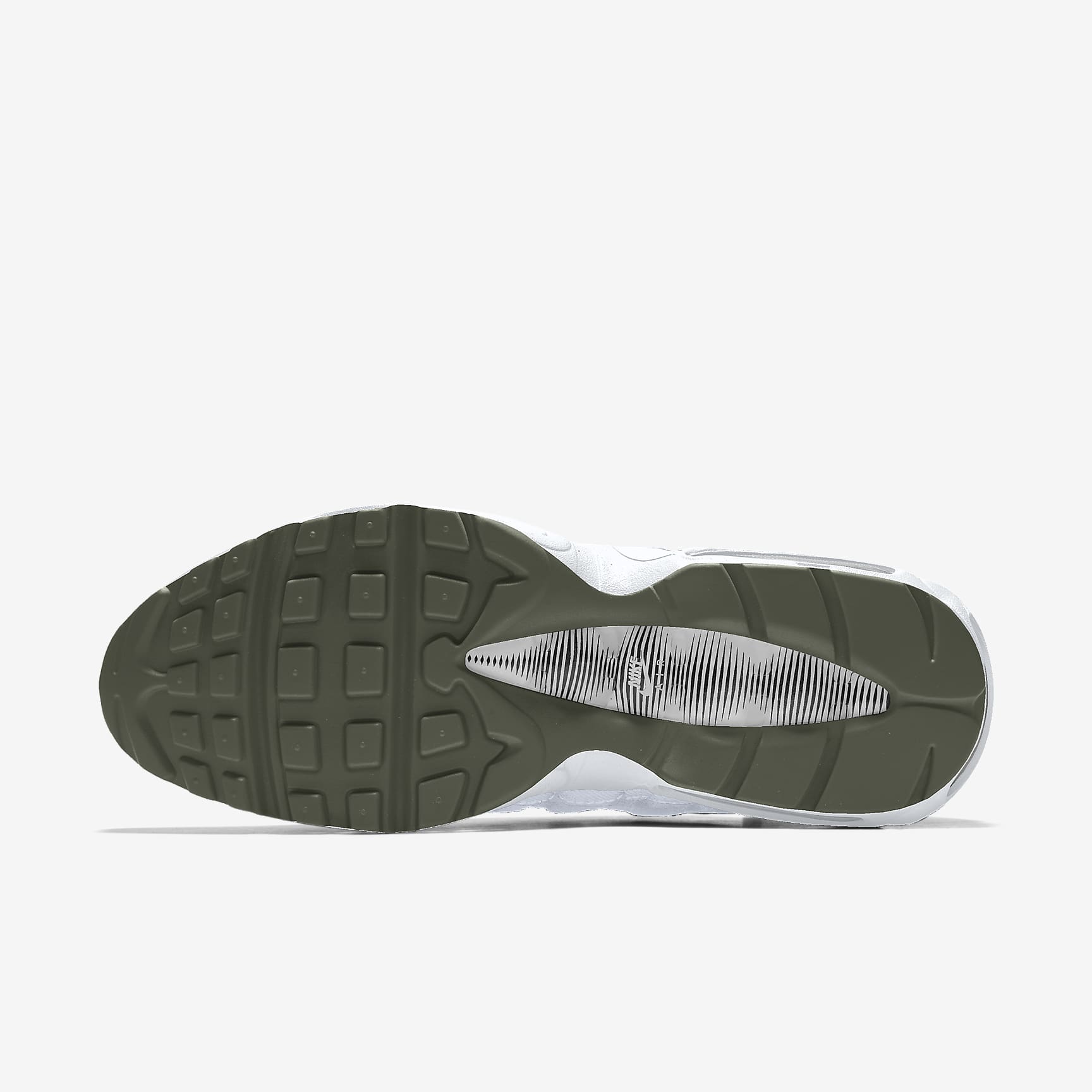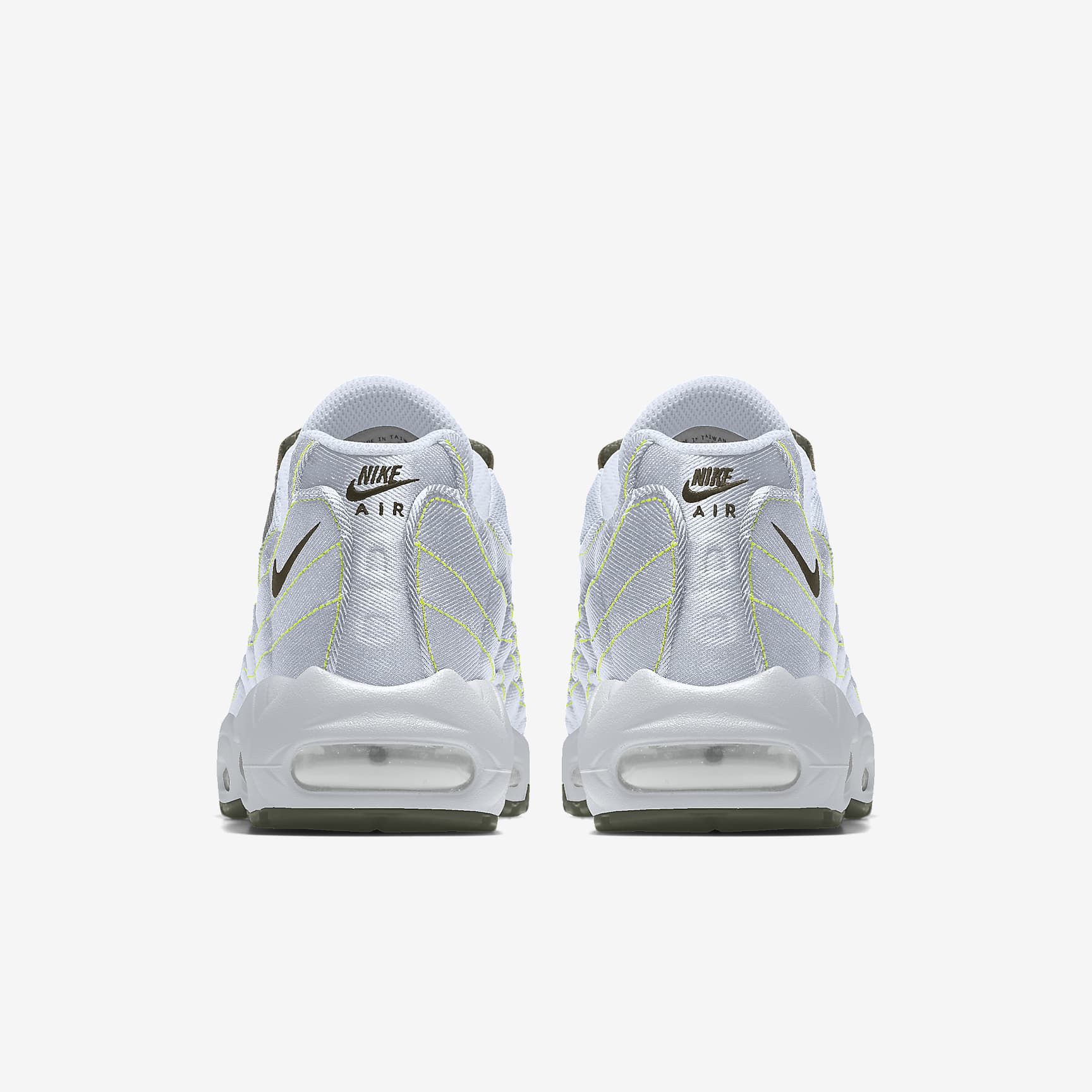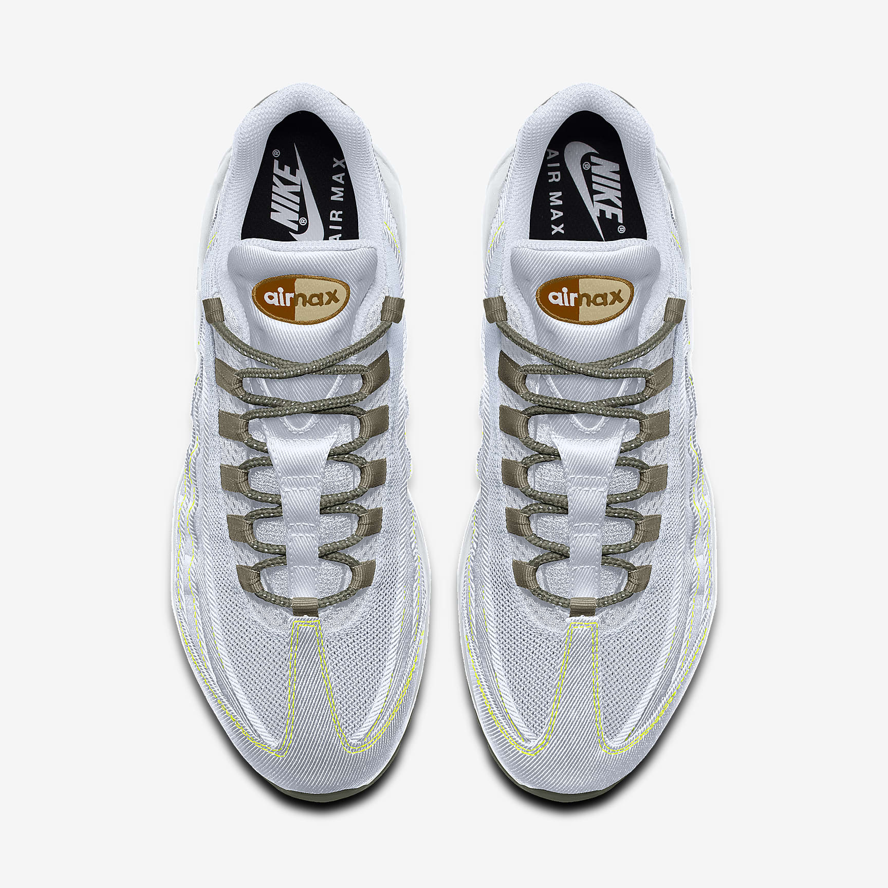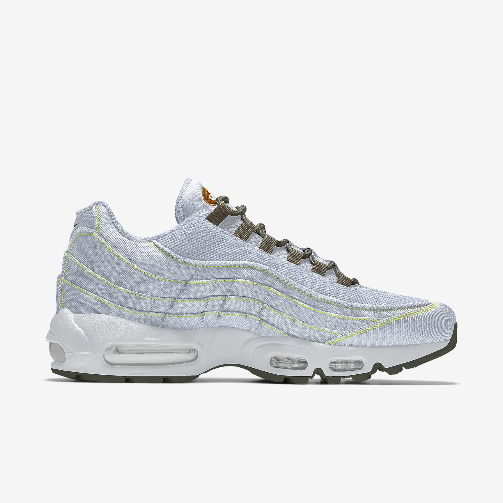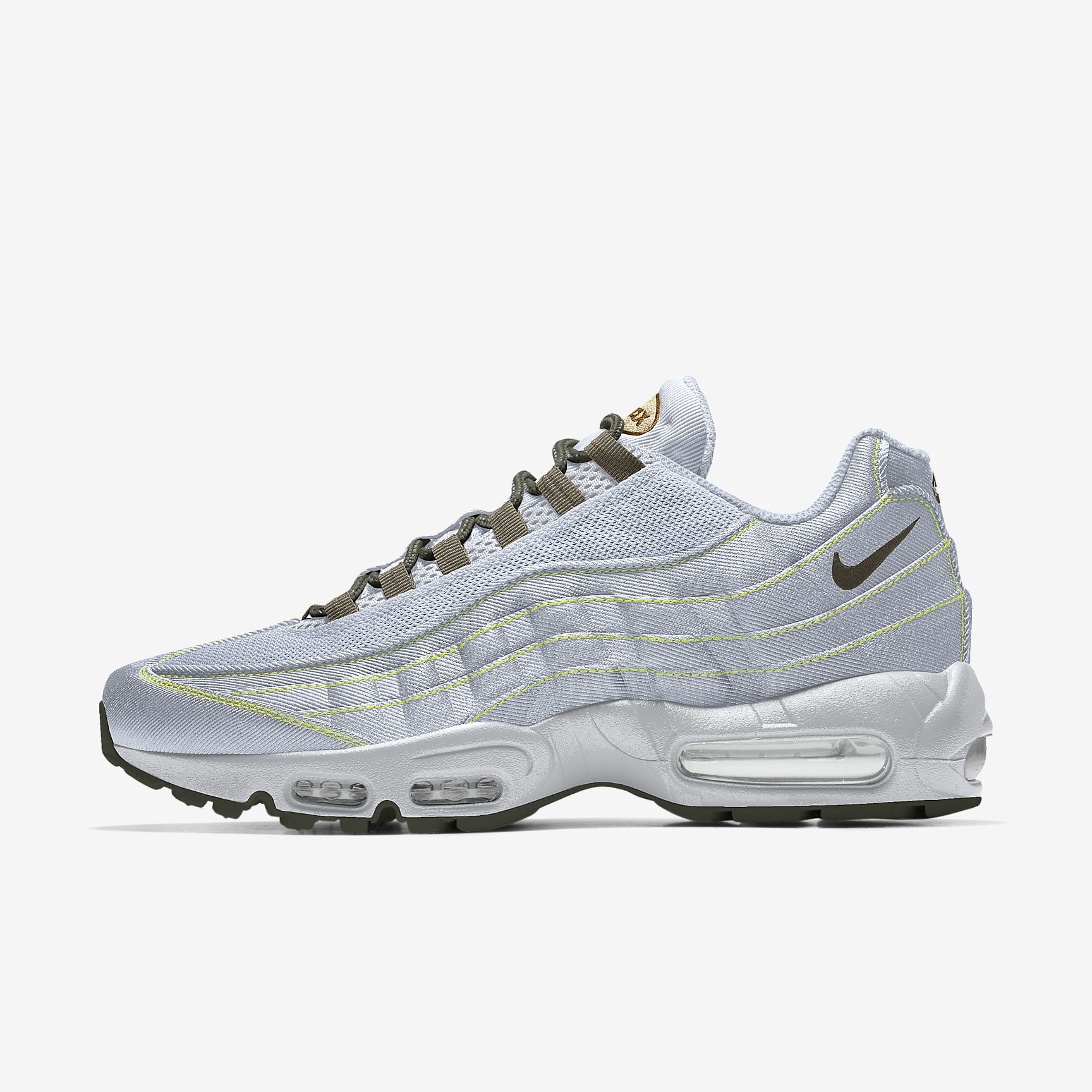 WORK IN PROGRESS. Celebrate workwear's wide appeal with a new take on the Nike Air Max 95 By You. Utilitarian materials like polished twill and leather are rugged and durable with an undeniable nod to runway style. Perfectly understated details like contrast stitching and gradient layers add a new level of depth to this long-time favourite. Back To Work The workwear world crosses over with style inspiration from the '00s with durable materials like polished twill that has the slightest shine or classic leather for the iconic layers. Subtlety at Its Best You have to look closely to appreciate the tonal and flooded colour plays designed for this shoe. The optional contrast stitching gives novice and professional designers an opportunity to let their stylistic sensibilities shine. Unmistakeable Pride Add a personalised message with up to 3 characters on each heel or keep the original "Air" logo. More Benefits * The AM95 was inspired by the components of the human body and its fine-tuned integration of form and function. * Originally developed for performance running, visible Nike Air cushioning delivers all-day comfort. * The OG lacing system was an innovative take on traditional laces, making it easy to put on and take off while also letting you personalise your fit. * A foam midsole has flex grooves for a comfortable feel that lets you move freely.
