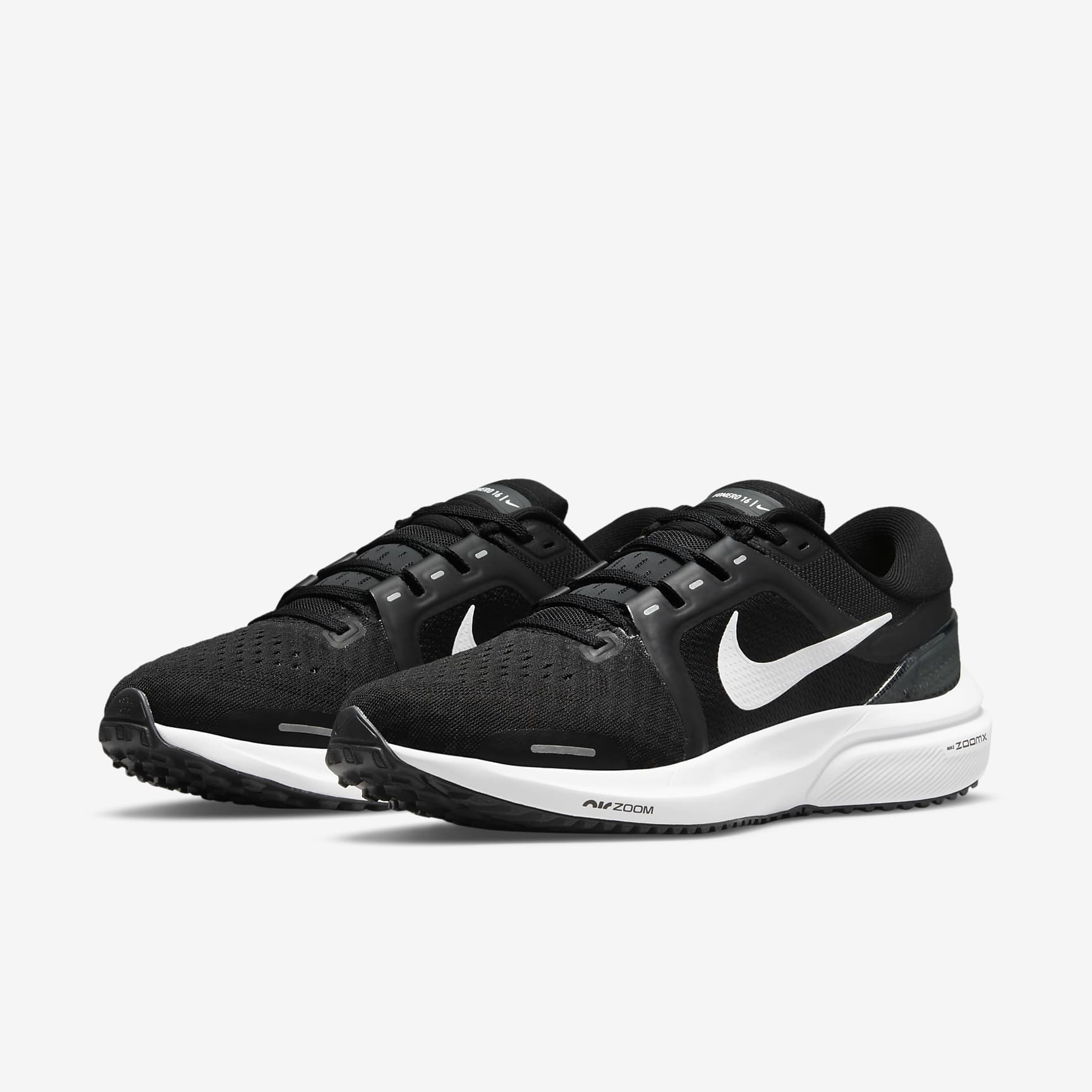 SUPPORTIVE WITH SNAPPY CUSHIONING. The Vomero 16 adds responsive ZoomX foam cushioning, bringing an energetic pop to your stride that's perfect for high mileage on the road. It's super-lightweight, with plenty of stretch and ventilation through the upper. Looking for the right amount of support? We've got you covered with an adjustable midfoot band and a stable clip at the heel. A Secure Stride We added extra support along the sides via a band at the midfoot. It works with your laces, helping you adjust how snug and secure your foot feels. There's also a clip at the heel, helping with stability as you run across uneven surfaces. Cool For the Distance We tested real runners to learn where feet need the most cooling. Using that data, we put mesh in key spots (especially around the toes) to give you stretch and ventilation. Snappy Steps Your foot sits on Nike ZoomX, our lightest and highest energy returning foam. It gives you a smooth ride from foot strike through your transition. We combined it with Zoom Air cushioning under the forefoot for a snappy, responsive feel as you push off. More Benefits * High-abrasion rubber at the outsole with lugs gives you durable traction. * The tongue is even more plush than previous versions. Product Details * Weight: 9.1oz (approx. 0.25kg) (Women's size 10) * Offset: 9.6mm (Forefoot: 18.5mm, Heel: 28.1mm) * Not intended for use as Personal Protective Equipment (PPE)