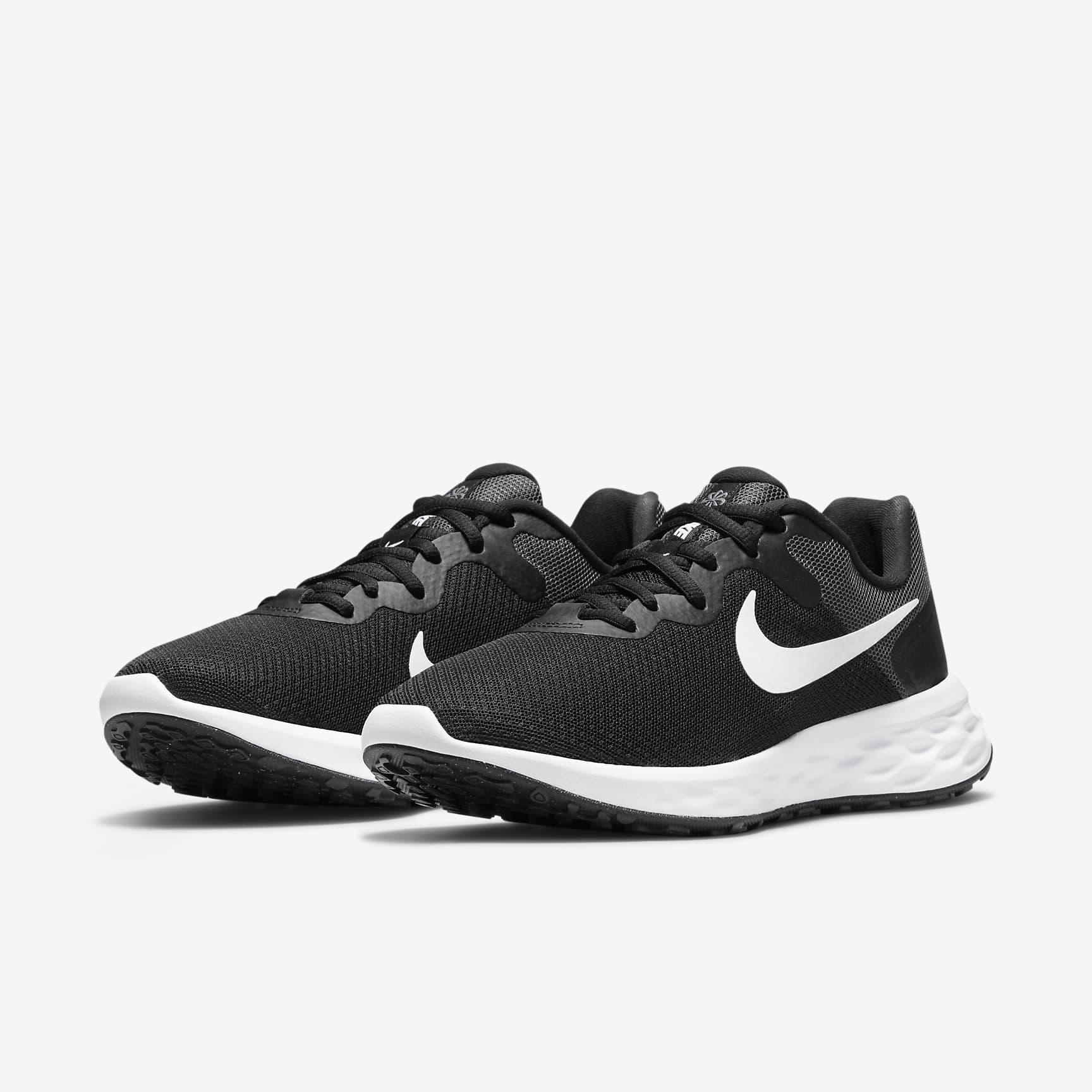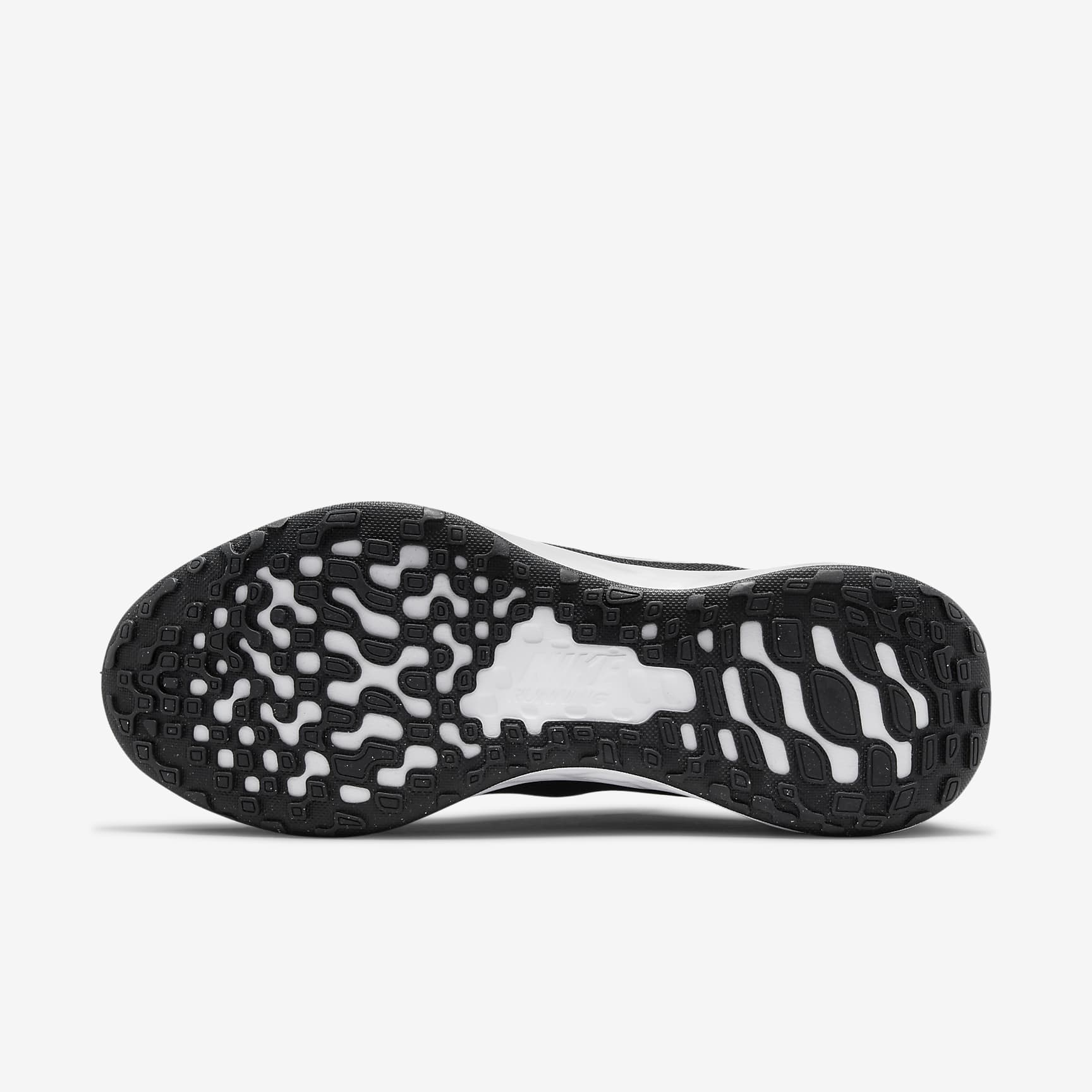 VERSATILE COMFORT WITH FLEXIBLE CUSHIONING. Made from at least 20% recycled material by weight, old materials find new beginnings. Now you can find yours. Set the pace at the start of your running journey with the plush feel of the Nike Revolution 6. We know comfort is key to a successful run, so we made sure your steps are cushioned and flexible for a soft ride. It's an evolution of a favourite, with a breathable design. Simple Design Plush mesh is placed along the collar for a comfortable feel. Additional skins throughout add durability. More Flexibility A foam midsole delivers a softer ride than the Revolution 5. The outsole has a computer-generated design that creates a natural piston effect as you run, providing more cushioning and flexibility. They combine for durable traction. Intuitive Touch Touch points at the heel and tongue create a natural feel as you get the shoes on and off.