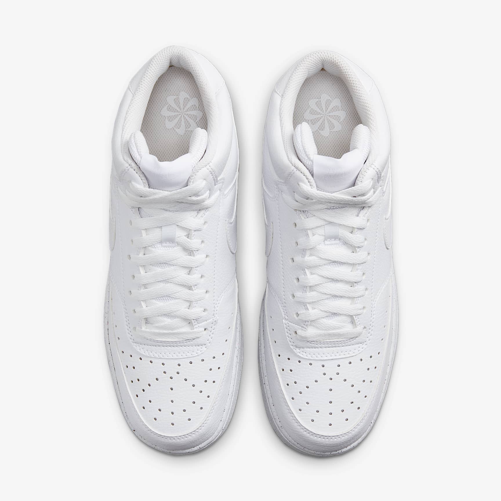 FRESH OFF THE COURT. In love with the classic look of '80s basketball but have a thing for the fast-paced culture of today's game? Meet the Nike Court Vision Mid. A classic remixed with at least 20% recycled materials by weight. We replaced leather with recycled and synthetic materials that keeps the soul of the original style. Its crisp upper and stitched overlays stays true to its origins. The plush collar keeps it sleek and comfortable for your world. Benefits * Made with at least 20% recycled material by weight. * Using synthetic materials, the design features materials that echo mid-1980s basketball shoes. * Padded collar looks sleek and feels great while the perforations on the toe and sides add comfort and breathability.