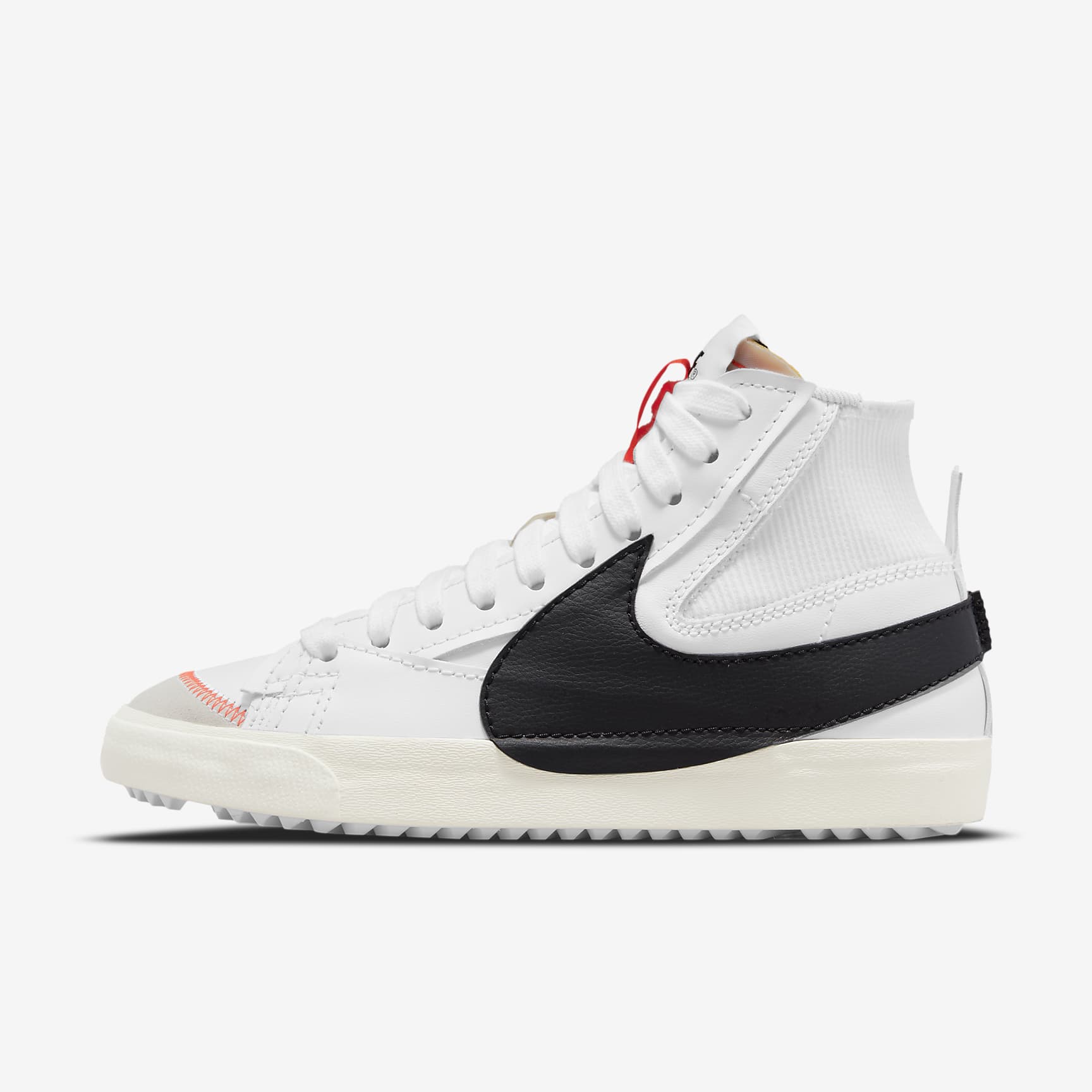 THE SWOOSH GETS BIG AND BOLD. Praised by many for its enduring look and feel, the wardrobe staple hits refresh with the Nike Blazer Mid '77 Jumbo.Harnessing the old-school look you love, it now has an elastic heel with corduroy-like texture and large pull tabs for easy on and off.The oversized Swoosh design and jumbo laces add a fun twist. Free Up Time The elastic heel allows you to slip on and get going quicker.Exaggerated pull tabs on the back and tongue let you pull them on and off with ease. Big and Bold The oversized Swoosh design and jumbo laces add a bold look to any outfit. Tried and True Capturing the essence of the classic Blazer, the stitched leather overlays and soft suede accent on the toe add heritage hoops style.The extra-thick thread for the stitching enhances the look with a defiant touch. Heritage Traction A raised herringbone pattern on the rubber outsole exaggerates the classic look. More Benefits * Thick, exposed foam tongue * Jumbo laces * Thick thread stitching * Large pull tabs on heel and tongue * Oversized woven label