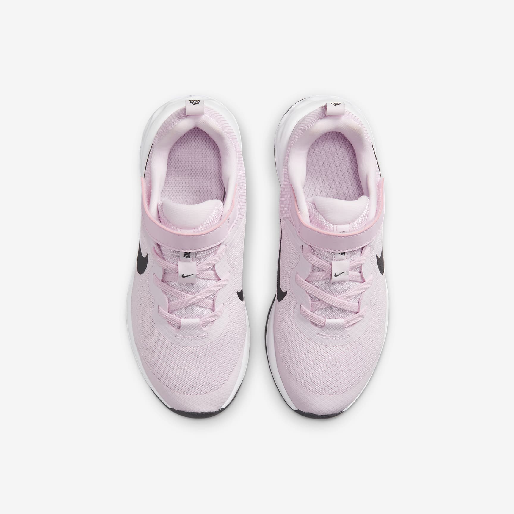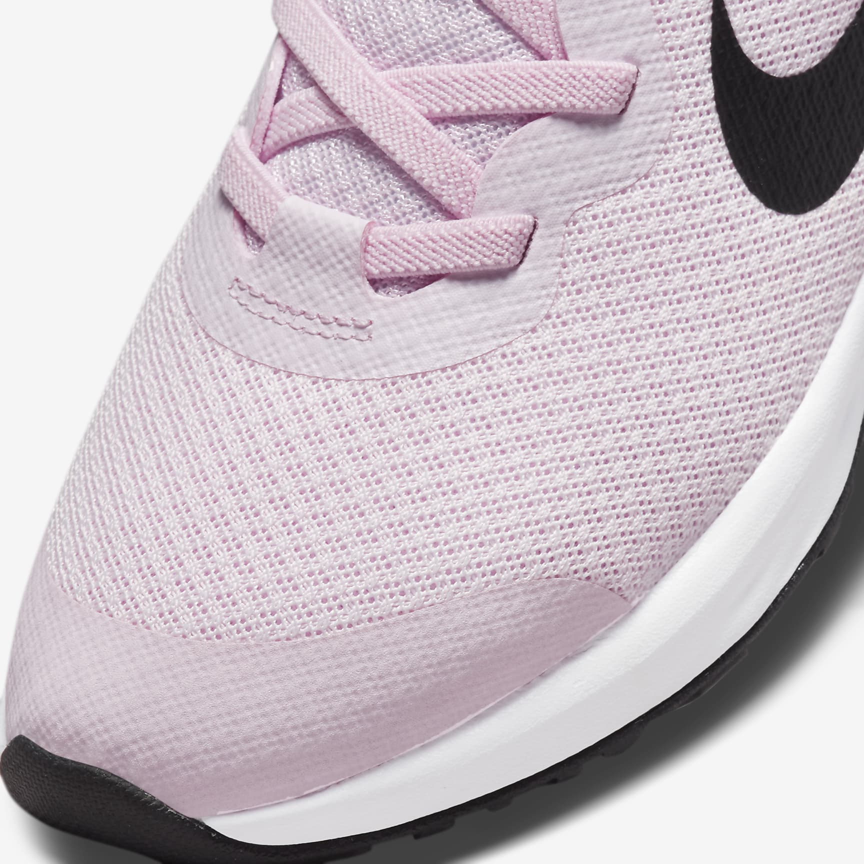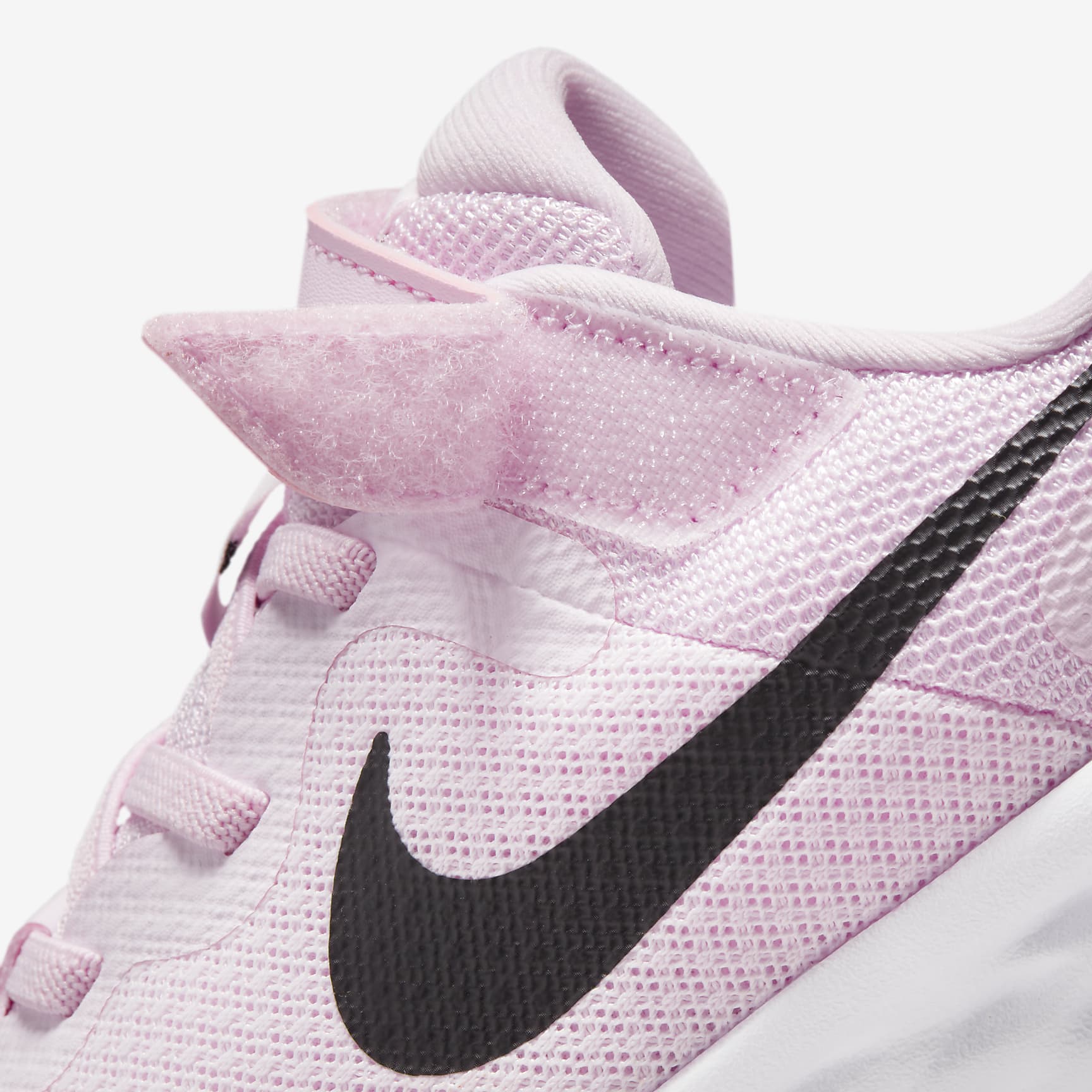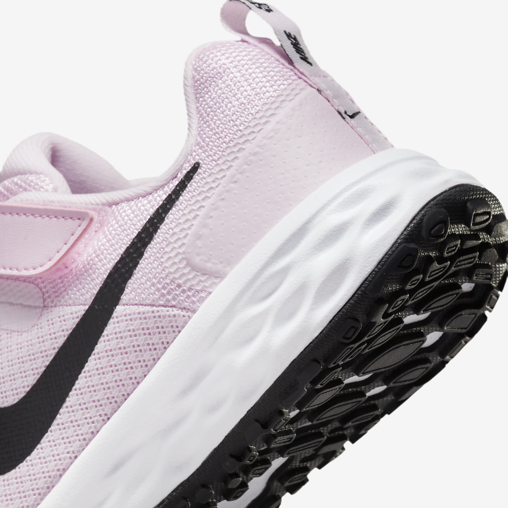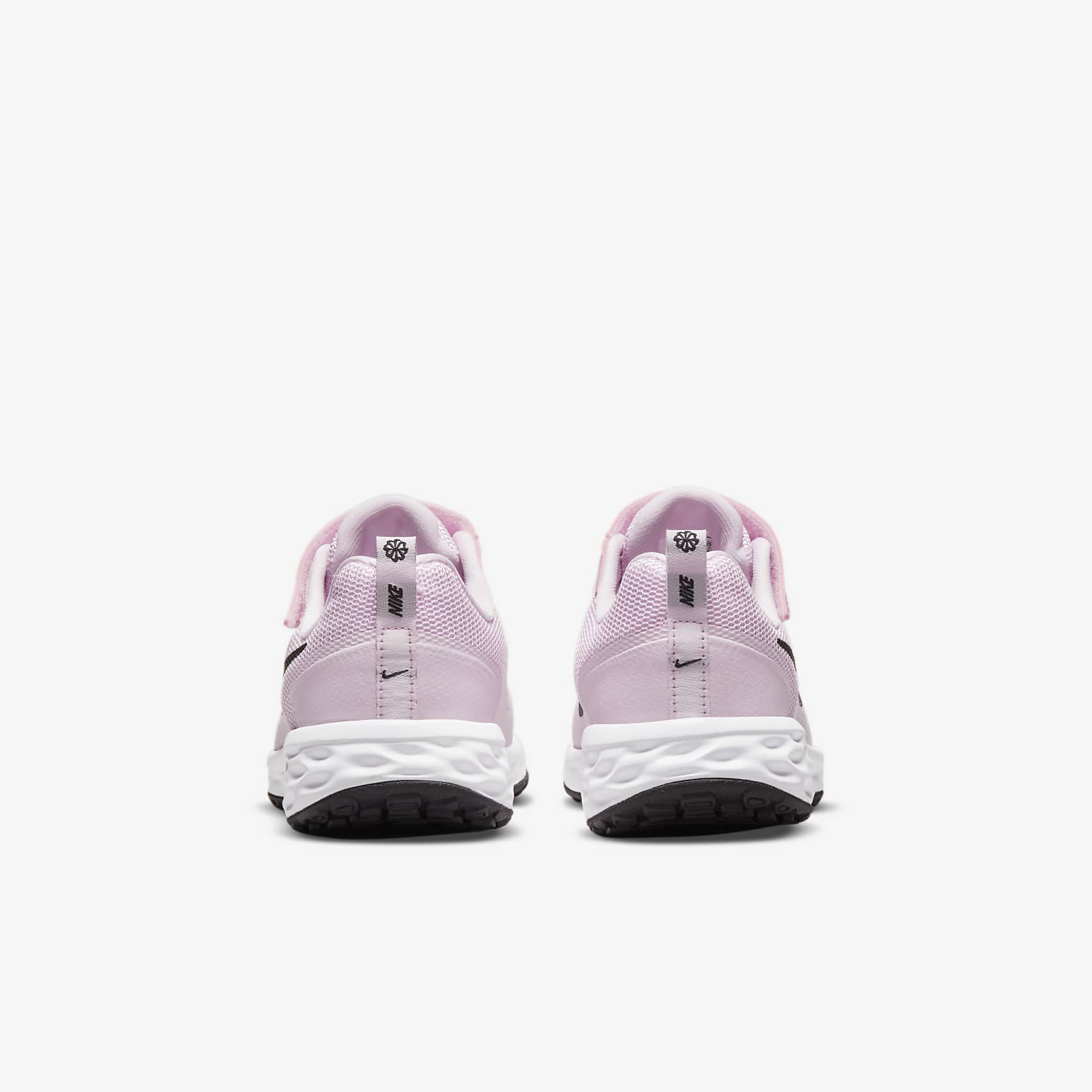MADE PLAY READY. The Nike Revolution 6 is all about versatility for little athletes, from all-day play to anytime wear. With easy straps, kids can feel comfy and secure when slipping these on. Lightweight, breathable and made from at least 20% recycled material by weight—you can't go wrong with that. Benefits * Lightweight textile provides breathability so little feet can stay cool. * Hook-and-loop strap and elastic laces make the shoes easy to get on and off. * Soft foam underfoot creates plush cushioning with every step. * Rubber sole gives durable traction. * Extra skin layer across the toes provides reinforcement against toe draggers. Product Details * Hook-and-loop strap and elastic laces * Sockliner topcloth uses 100% recycled TPU * 100% recycled polyester in the collar lining * Parts of the upper made from 100% recycled polyester