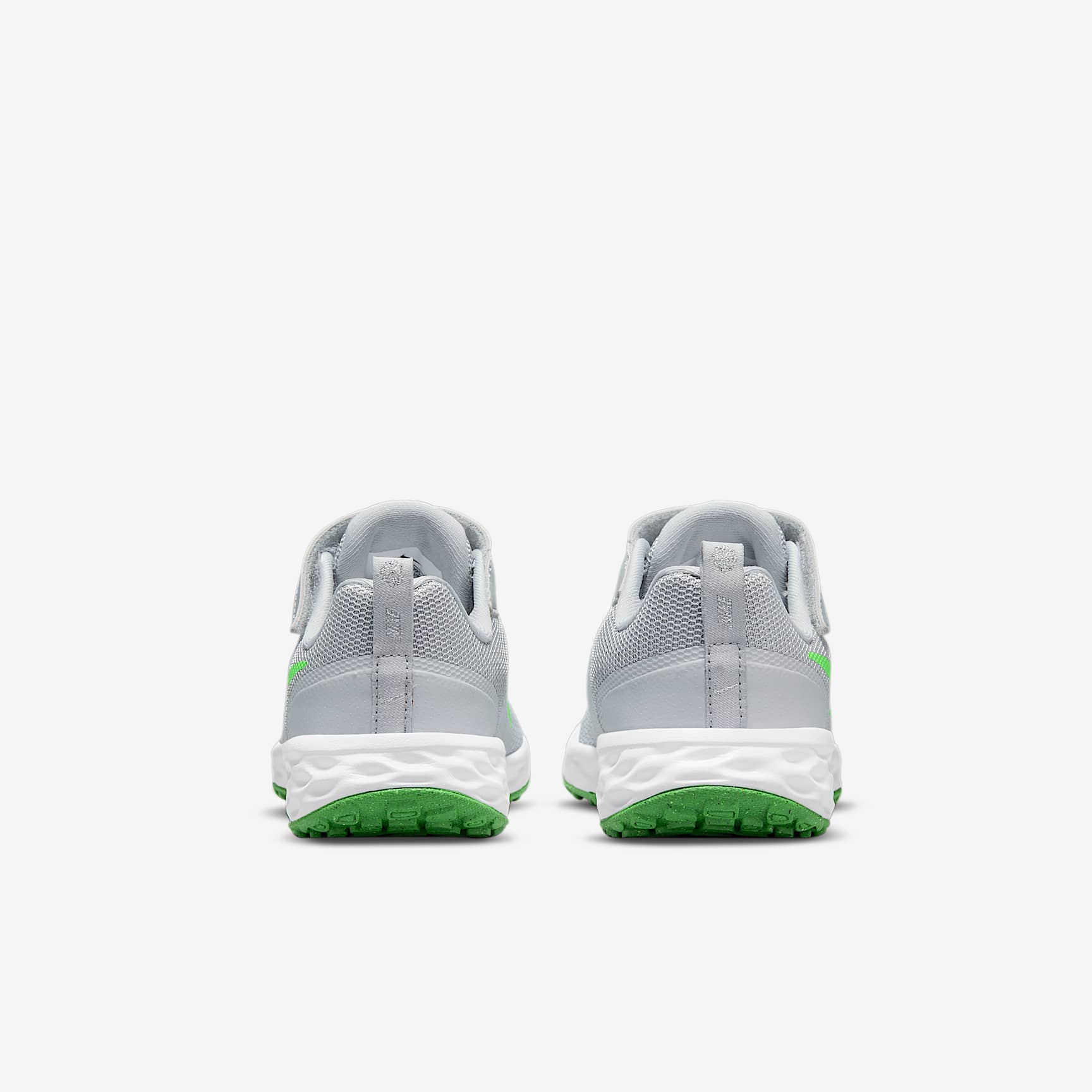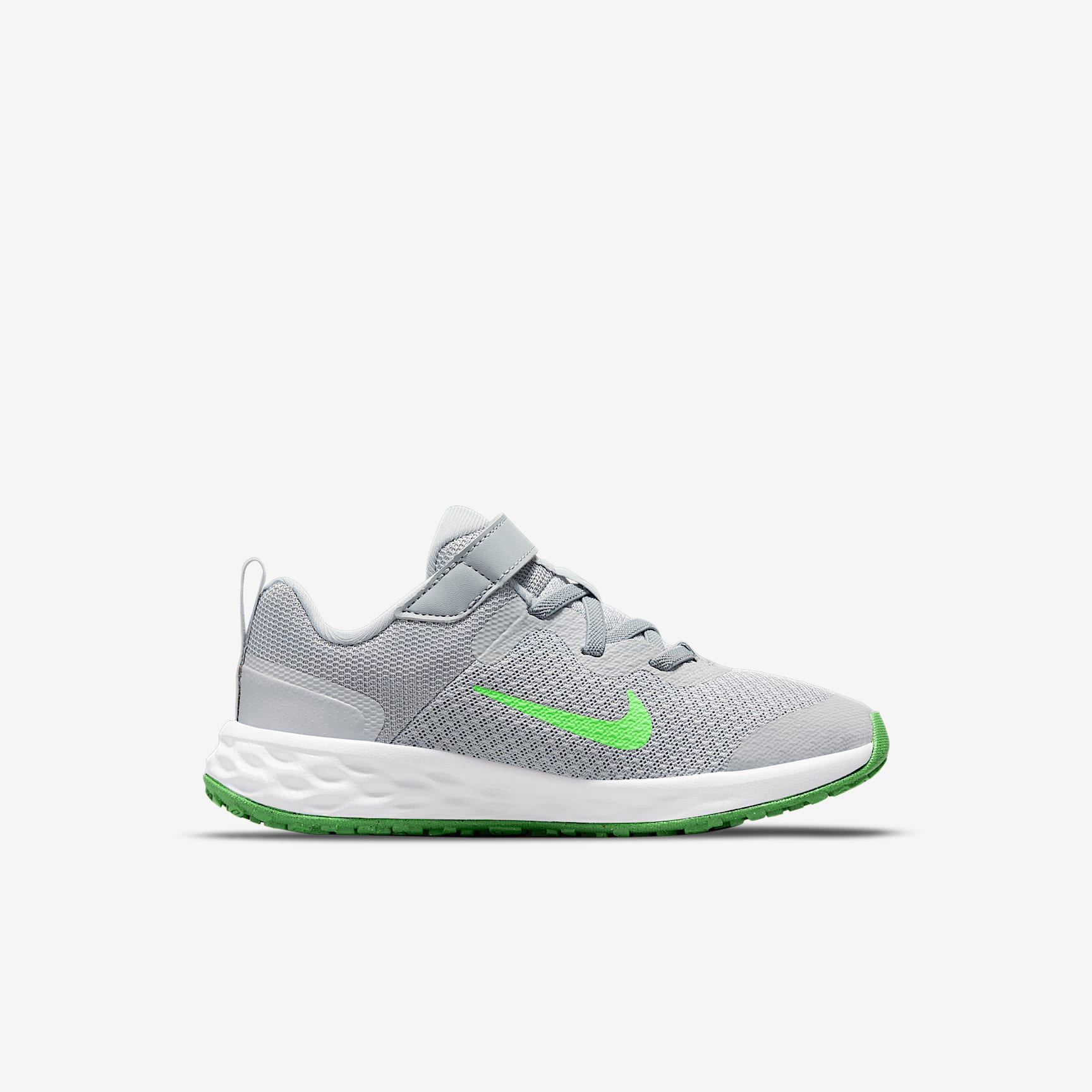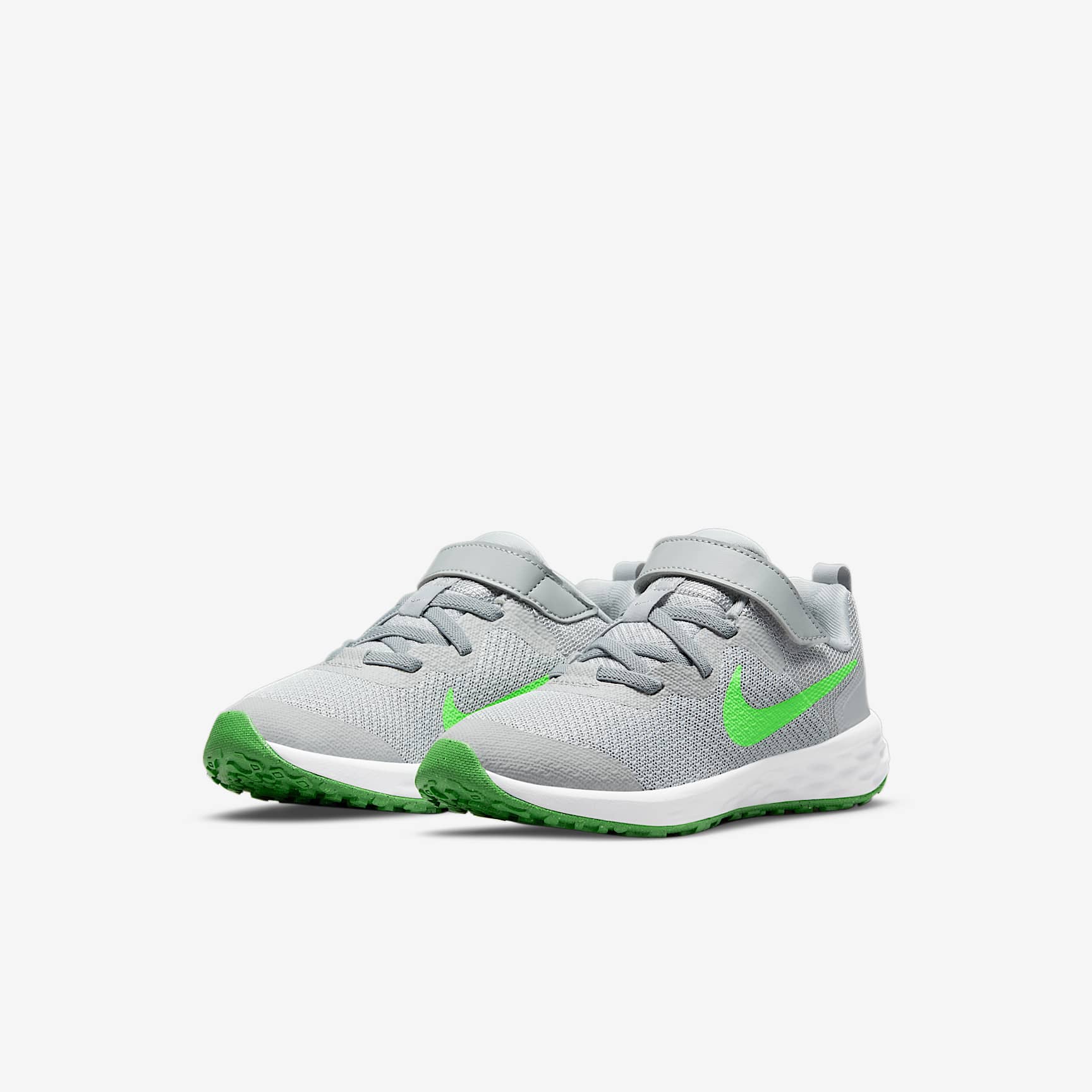 MADE PLAY READY. The Nike Revolution 6 is all about versatility for little athletes, from all-day play to anytime wear. With easy straps, kids can feel comfy and secure when slipping these on. Lightweight, breathable and made from at least 20% recycled material by weight—you can't go wrong with that. Benefits * Lightweight textile provides breathability so little feet can stay cool. * Hook-and-loop strap and elastic laces make the shoes easy to get on and off. * Soft foam underfoot creates plush cushioning with every step. * Rubber sole gives durable traction. * Extra skin layer across the toes provides reinforcement against toe draggers. Product Details * Hook-and-loop strap and elastic laces * Sockliner topcloth uses 100% recycled TPU * 100% recycled polyester in the collar lining * Parts of the upper made from 100% recycled polyester