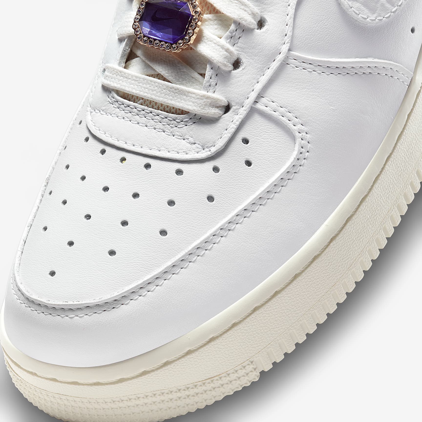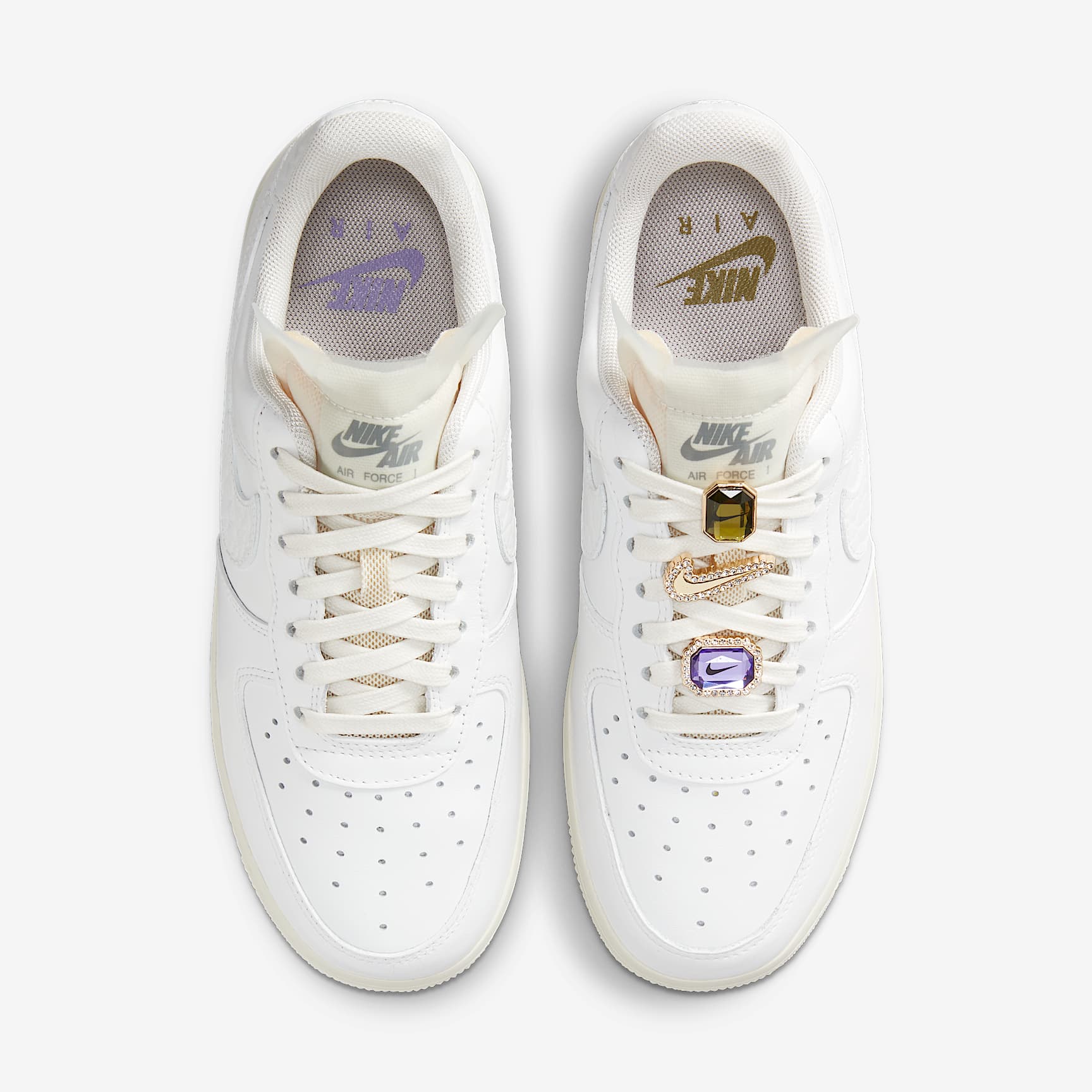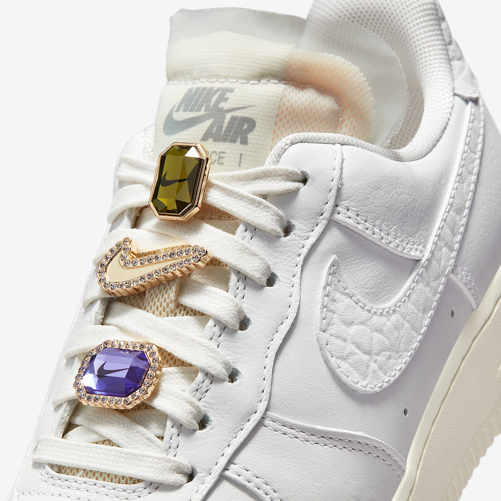 A LEGEND GOES GLAM. The Nike Air Force 1 Low elevates a legend with some bling for your feet.Premium leather on the upper features jewels interwoven in the laces crown the icon in all its glory.Plus a touch of tulle on the tongue adds a delicate edge. Adorned in Detail Jewels and premium leather crown this pinnacle of sneaker culture. All About Air Foam midsole with Nike Air cushioning, originally designed for hoops performance, provides lightweight comfort. Cushioned Comfort Padded collar feels soft and comfortable while the low-cut silhouette adds a versatile look. More Benefits * Rubber outsole